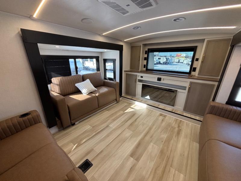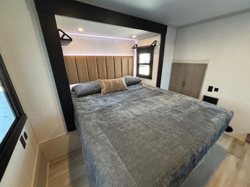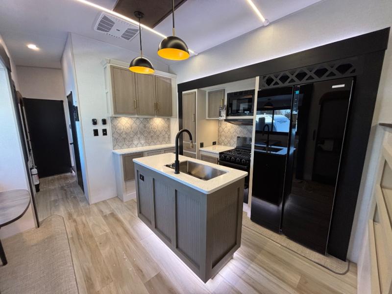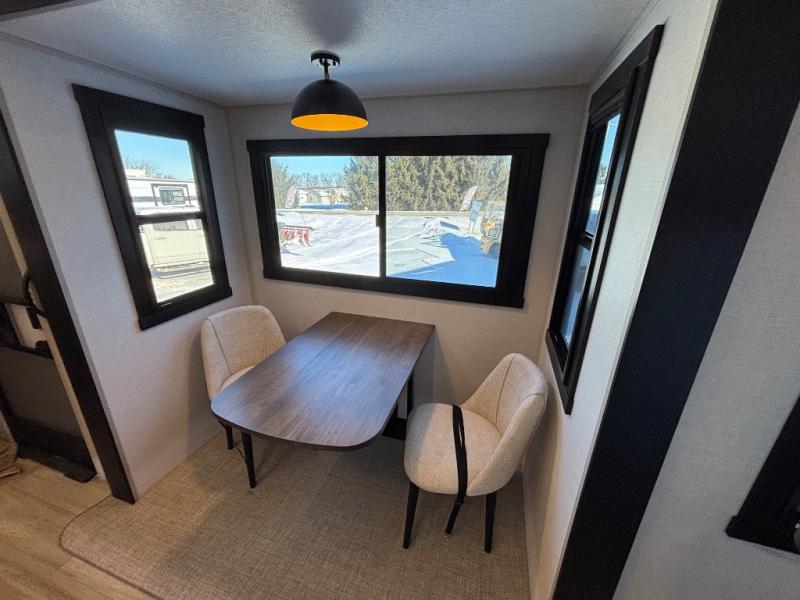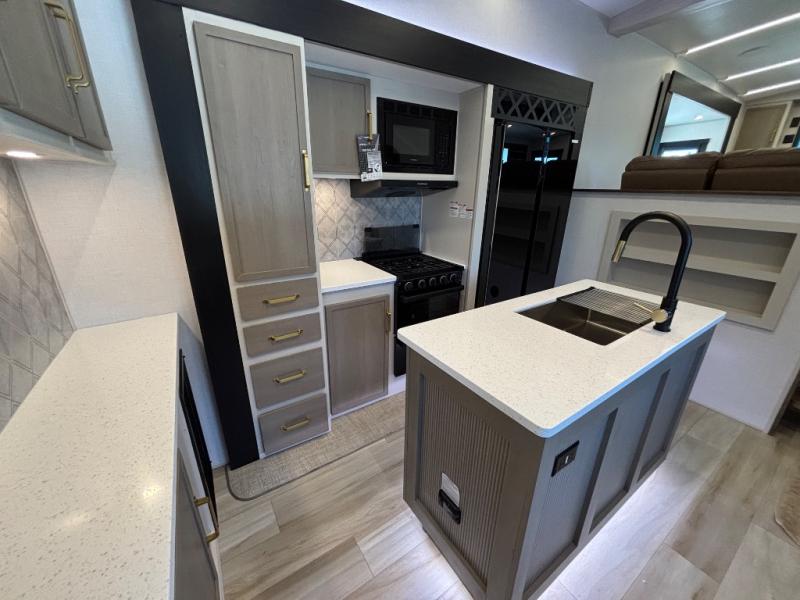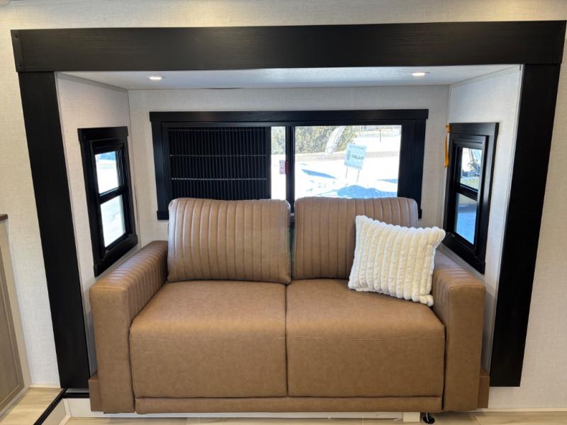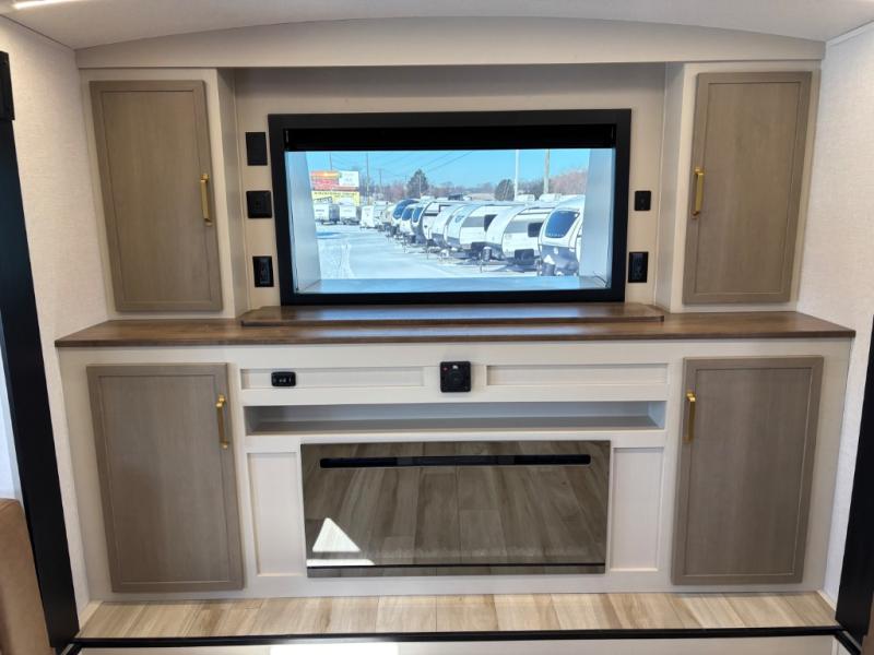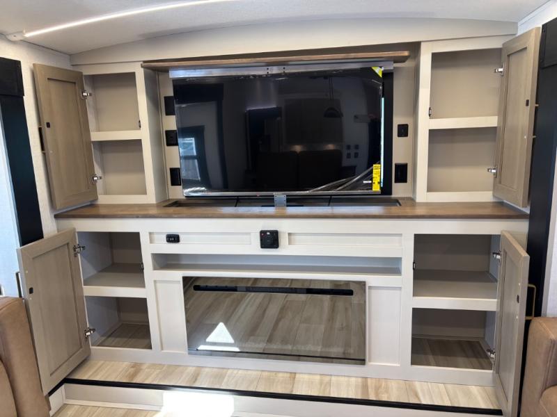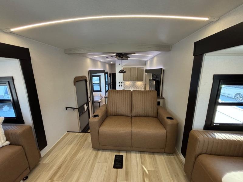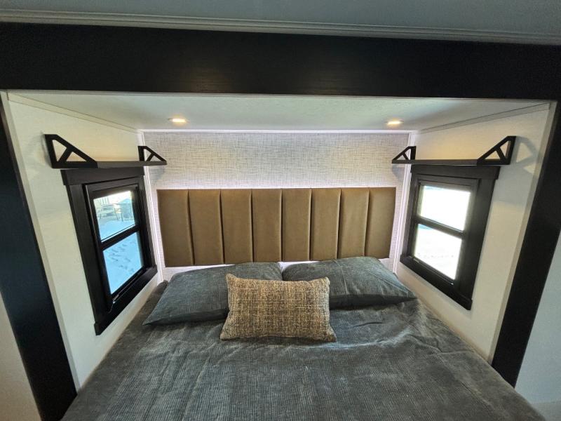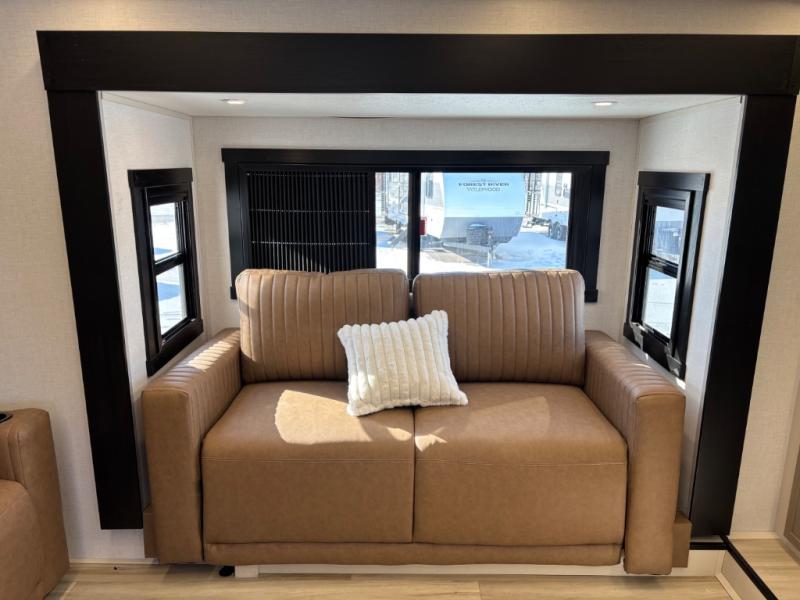 If you are looking for plenty of space, great views, and a place to call home, you have found it with this Wildwood Heritage Glen fifth wheel! The living area is separate from the kitchen and includes dual opposing tri-fold sofas with panoramic windows, theater seating with cupholders, and a 50" LED TV with a fireplace and storage along the front wall. The separate kitchen also offers lots of space with dual slides, a kitchen island, a free-standing table and chairs, and a hutch. You will find the loft stairs beside the full bathroom with a walk-in shower, and the rear private bedroom has a custom king bed slide for endless nights of rest and rejuvenation. There is so much more to enjoy from the loft above the bedroom, the pantry for lots of snack storage as well as the panoramic window in the kitchen and the residential walk-in shower in the full bathroom to mention a few.