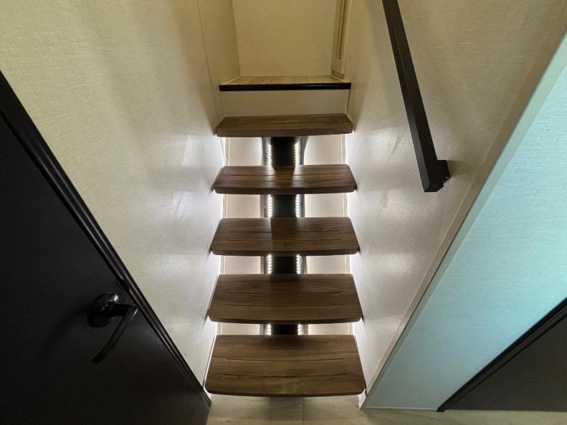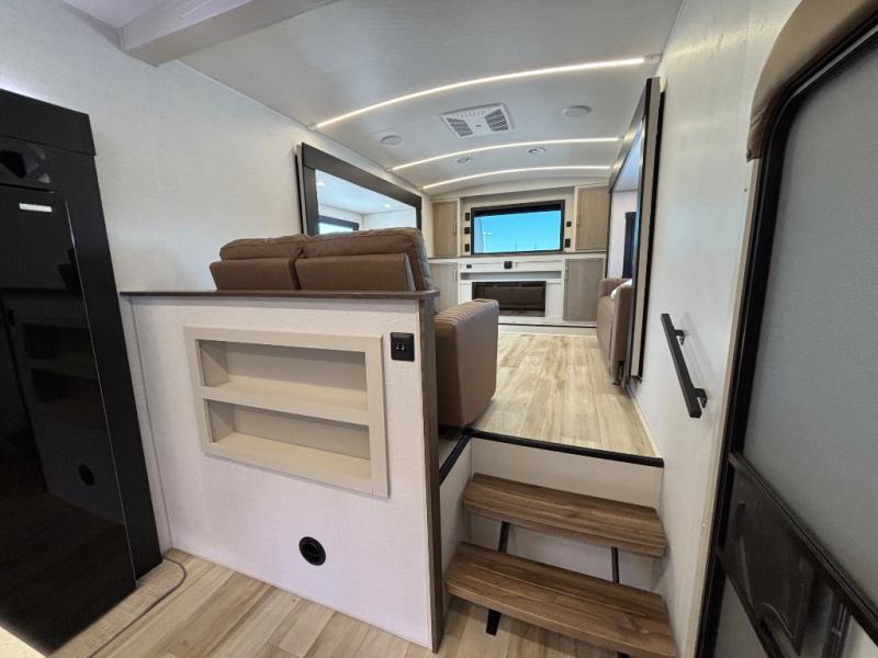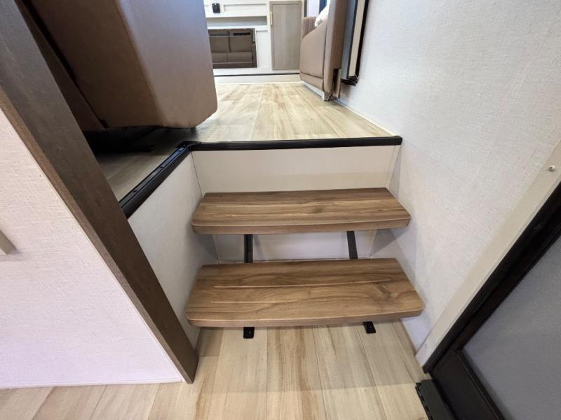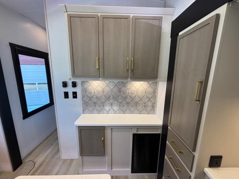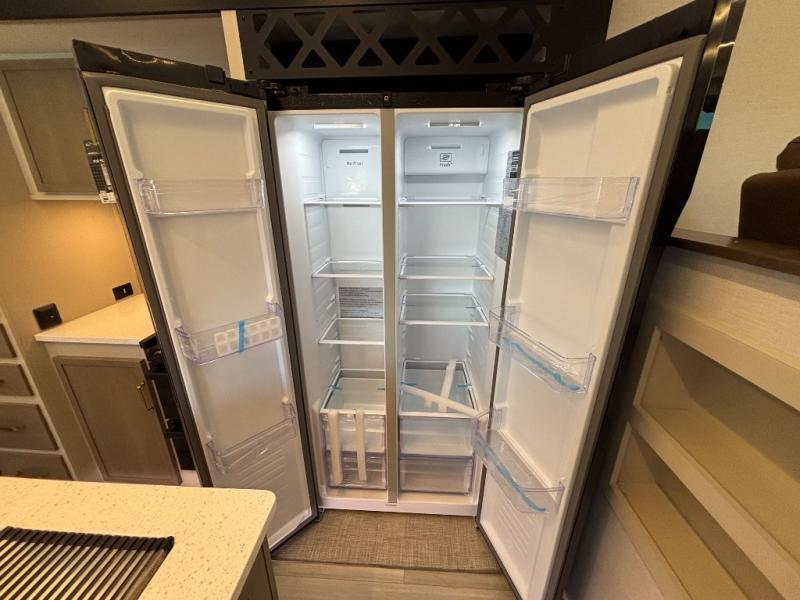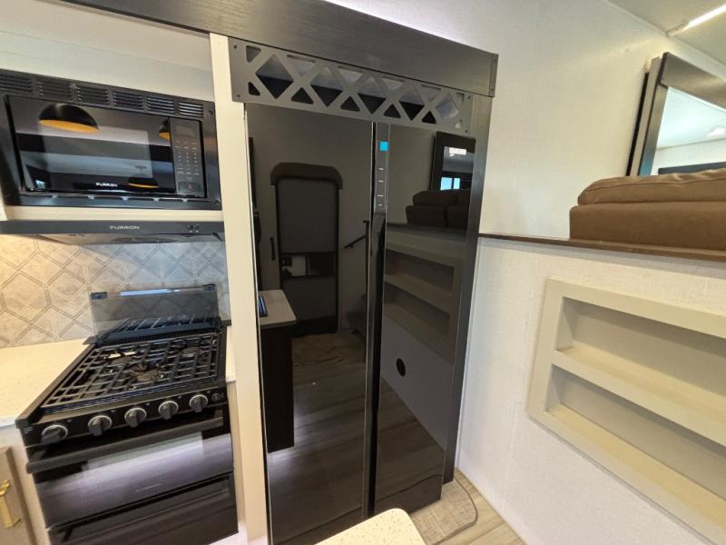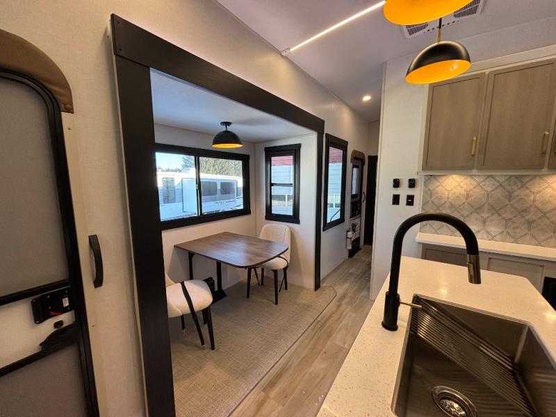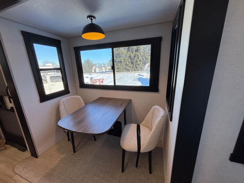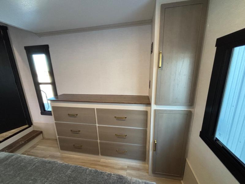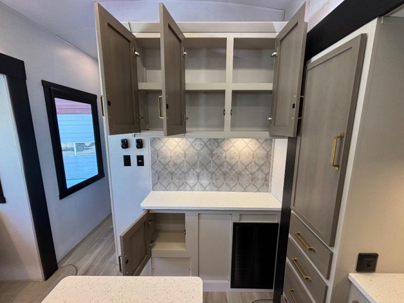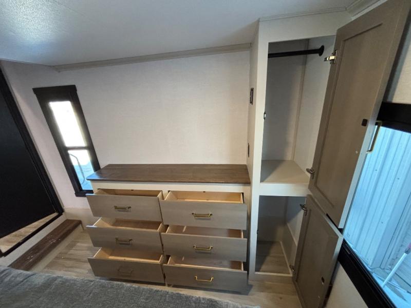 If you are looking for plenty of space, great views, and a place to call home, you have found it with this Wildwood Heritage Glen fifth wheel! The living area is separate from the kitchen and includes dual opposing tri-fold sofas with panoramic windows, theater seating with cupholders, and a 50" LED TV with a fireplace and storage along the front wall. The separate kitchen also offers lots of space with dual slides, a kitchen island, a free-standing table and chairs, and a hutch. You will find the loft stairs beside the full bathroom with a walk-in shower, and the rear private bedroom has a custom king bed slide for endless nights of rest and rejuvenation. There is so much more to enjoy from the loft above the bedroom, the pantry for lots of snack storage as well as the panoramic window in the kitchen and the residential walk-in shower in the full bathroom to mention a few.