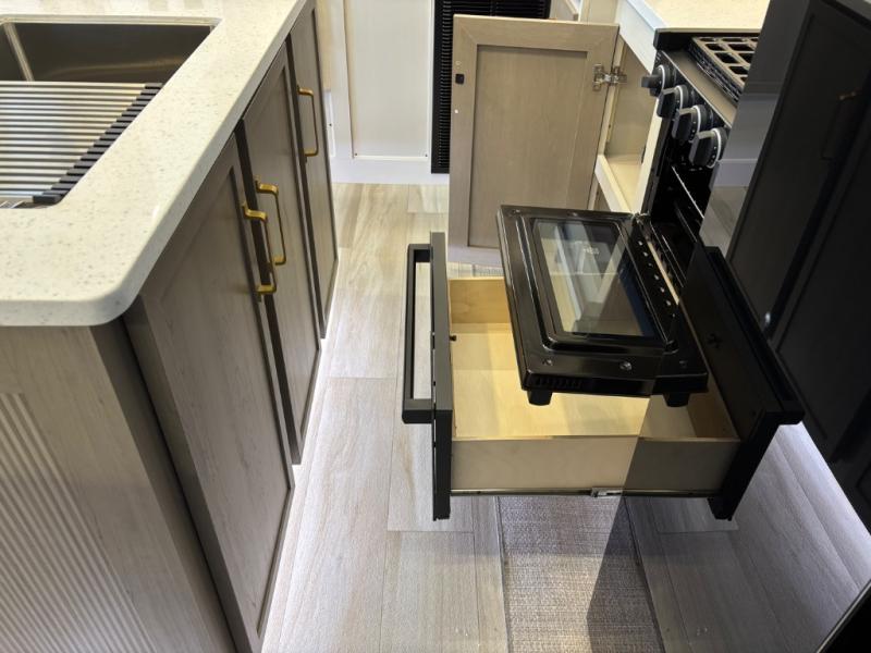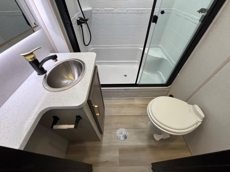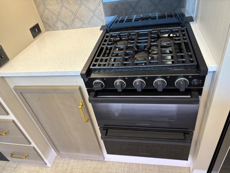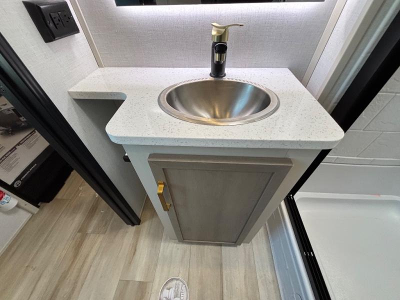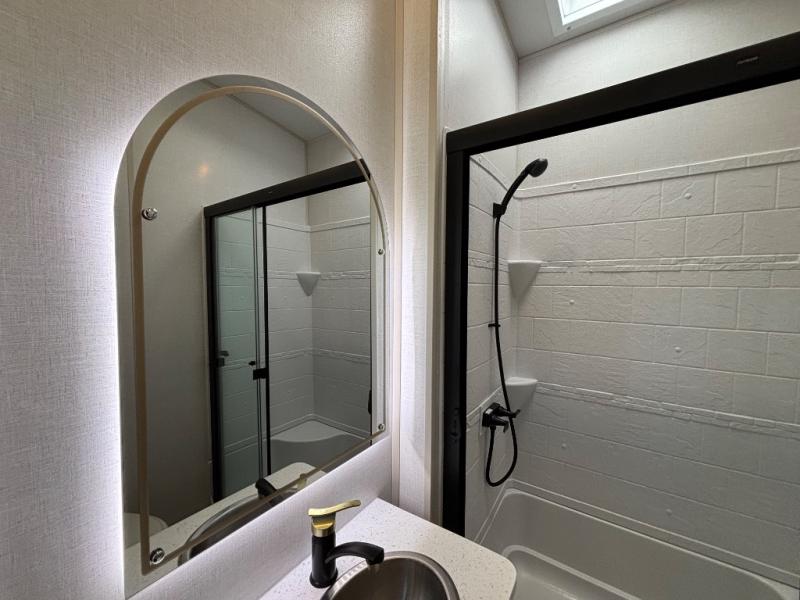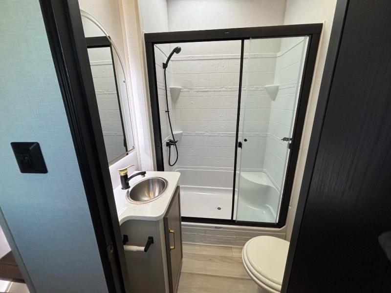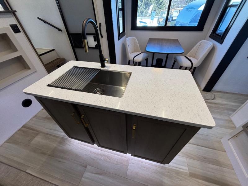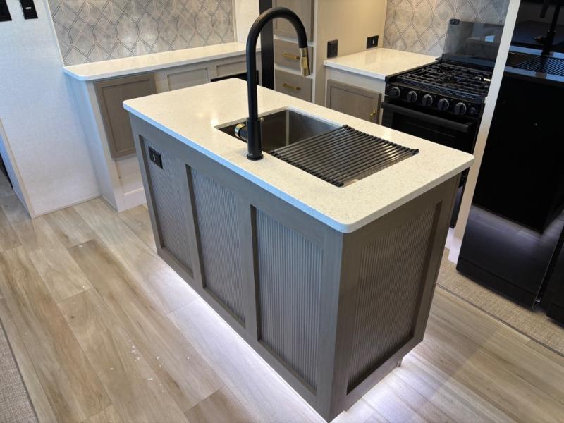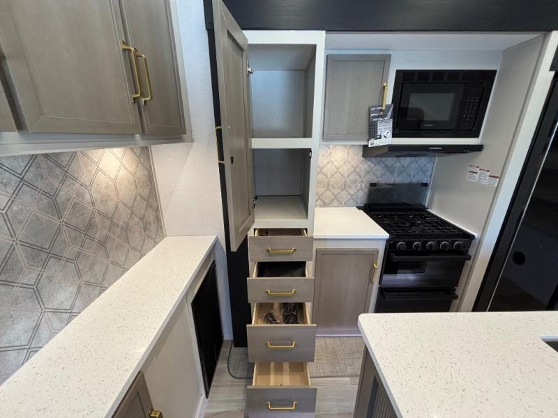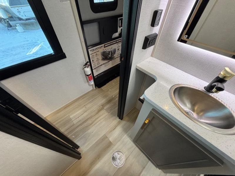 With any Wildwood Heritage Glen fifth wheel by Forest River, the quality construction, attention to detail and design along with a bright and welcoming interior allows you to relax in comfort with conveniences while exploring outdoors. The Summer Wind colored horizontal plank linoleum flooring is unique, beautiful and durable, and there are gold-accented faucets with stainless steel sinks in the bathrooms for added luxury. The Accessibelly underbelly with 12V tank heaters will help protect your unit from the elements, and the power stabilizer jacks and landing gear will make set-up a breeze. More features that provide convenience include the high-end solid surface countertops, an RV Airflow System that provides at least 25% better airflow, and solar prep for off-grid capabilities.