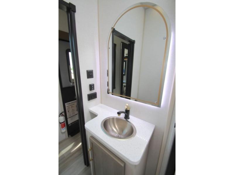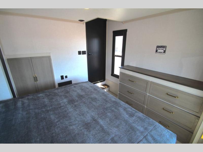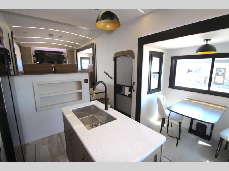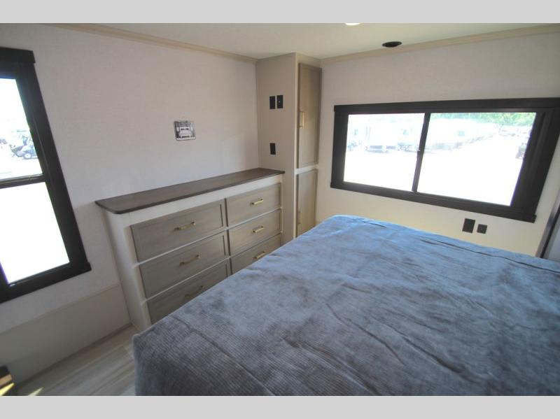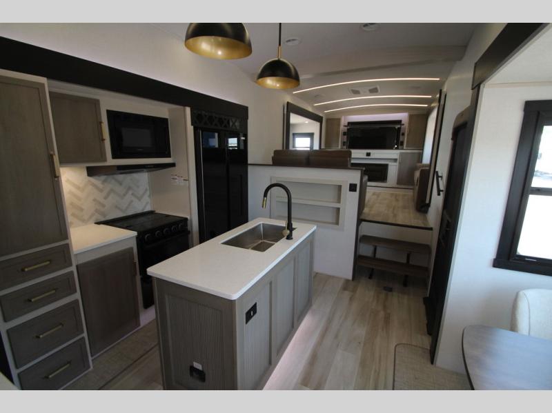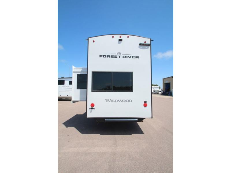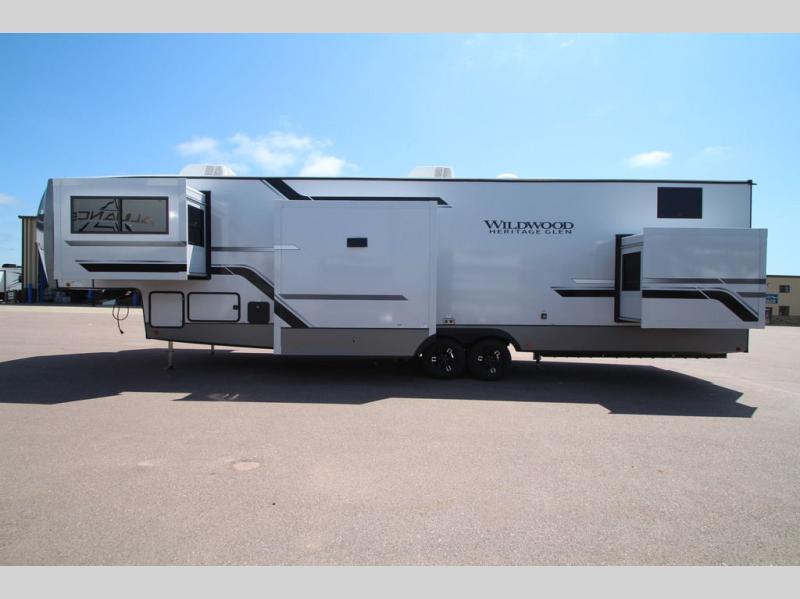 With any Wildwood Heritage Glen fifth wheel by Forest River, the quality construction, attention to detail and design along with a bright and welcoming interior allows you to relax in comfort. You'll love the high-end solid surface countertops included in the Elevated Value Package, along with a JBL sound system, full-length barreled ceilings, and an ultimate interior lighting upgrade. The included Expedition Package features an Accesibelly underbelly panel with 12V tank heaters, nitrogen-filled tires with aluminum rims, and a spacious 30" wide main entry door with a window. The Lippert On-The-Go ladder prep and back-up camera prep let you customize your fifth wheel even more, and the LED awning, front cap, marker and taillights will make it easier than ever to set up camp!