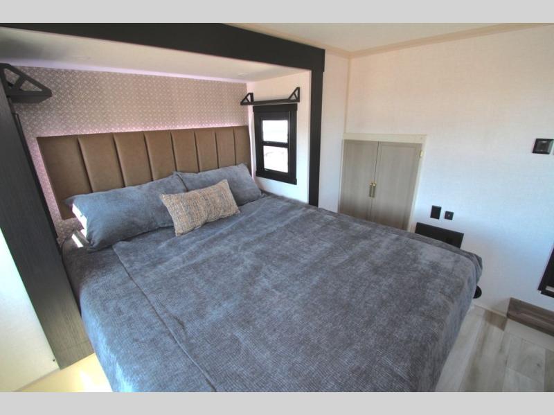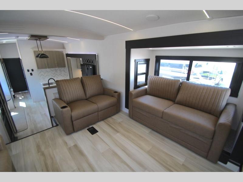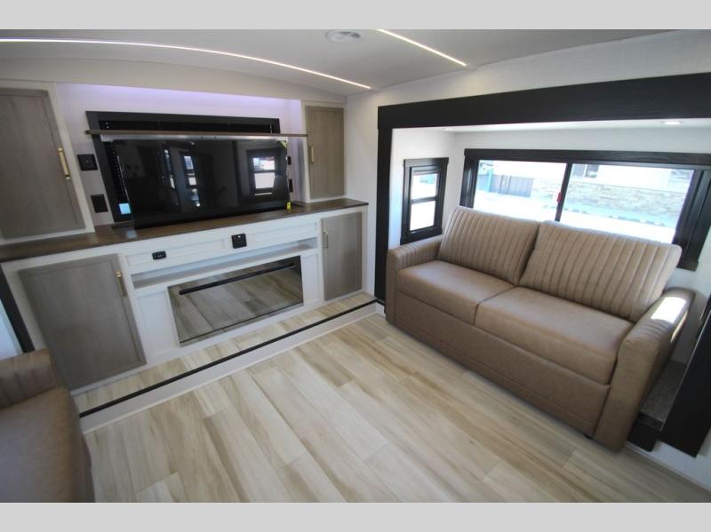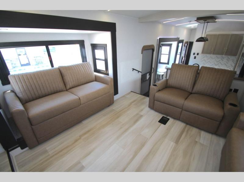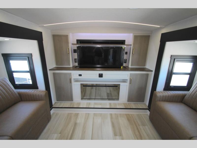 If you are looking for plenty of space, great views, and a place to call home, you have found it with this Wildwood Heritage Glen fifth wheel! The living area is separate from the kitchen and includes dual opposing tri-fold sofas with panoramic windows, theater seating with cupholders, and a 50" LED TV with a fireplace and storage along the front wall. The separate kitchen also offers lots of space with dual slides, a kitchen island, a free-standing table and chairs, and a hutch. You will find the loft stairs beside the full bathroom with a walk-in shower, and the rear private bedroom has a custom king bed slide for endless nights of rest and rejuvenation. There is so much more to enjoy from the loft above the bedroom, the pantry for lots of snack storage as well as the panoramic window in the kitchen and the residential walk-in shower in the full bathroom to mention a few.