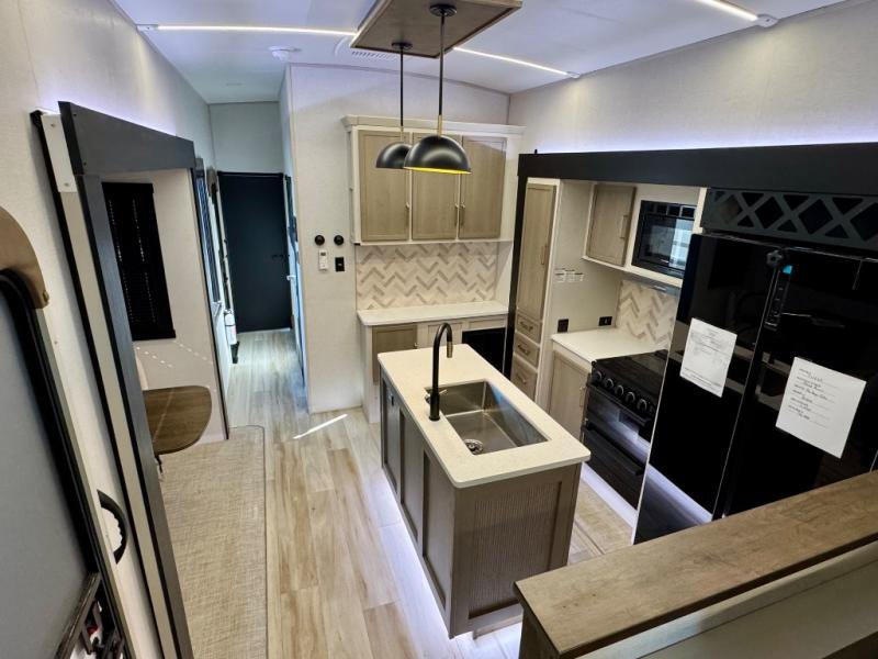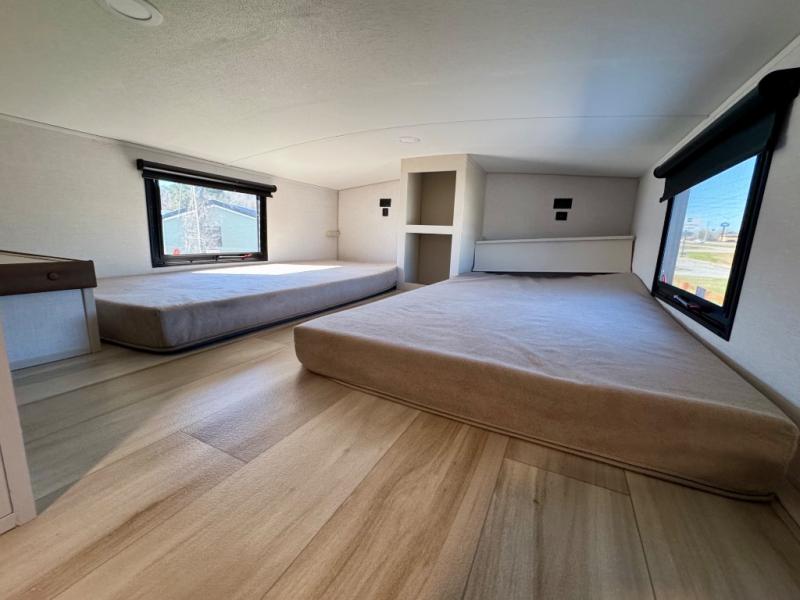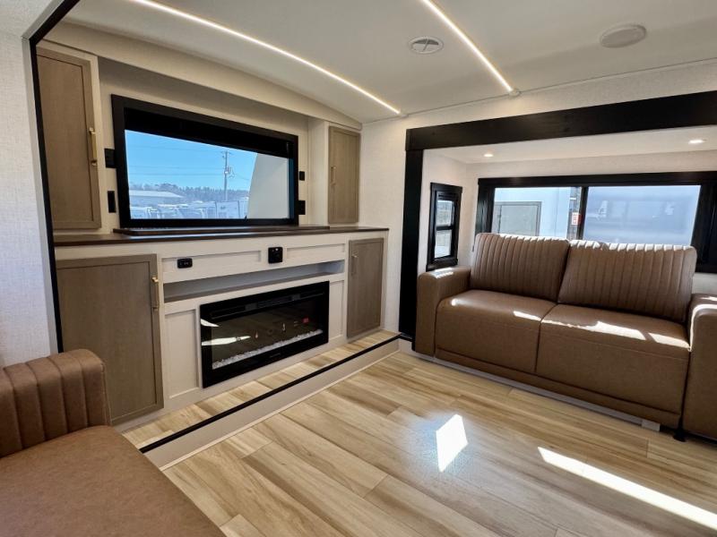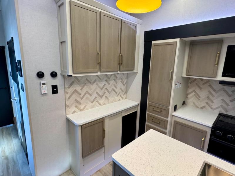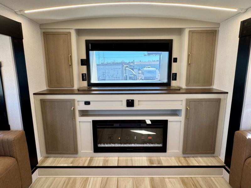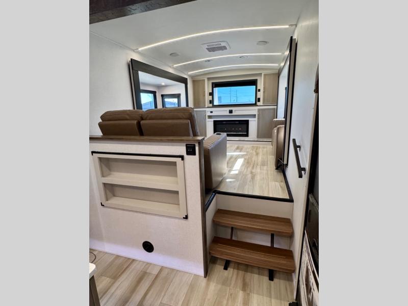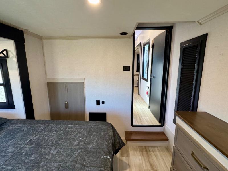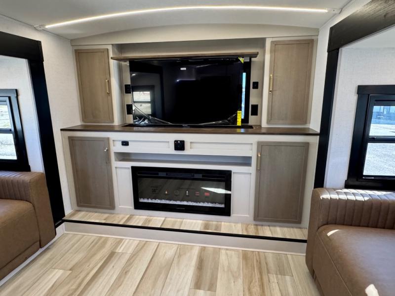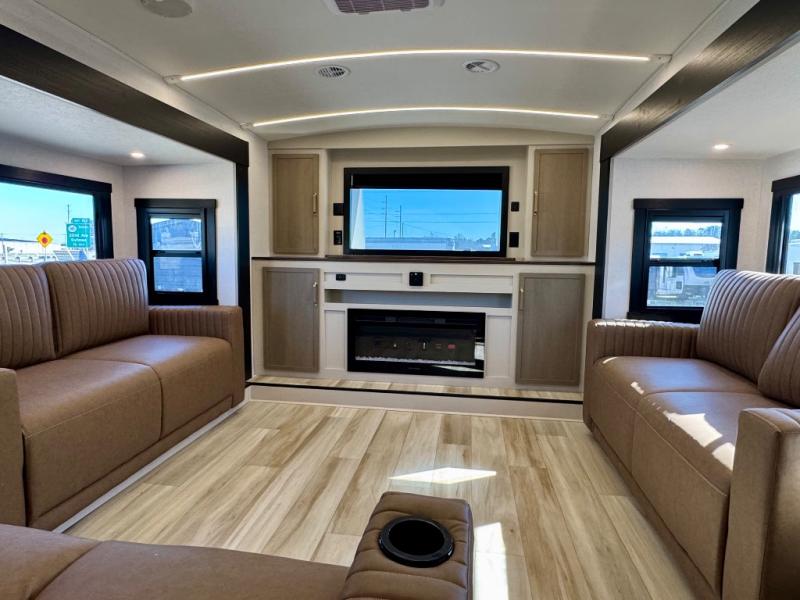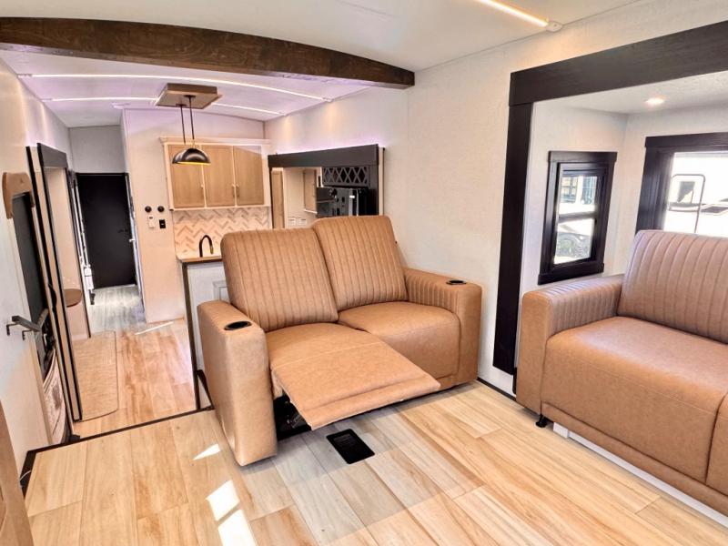 If you are looking for plenty of space, great views, and a place to call home, you have found it with this Wildwood Heritage Glen fifth wheel! The living area is separate from the kitchen and includes dual opposing tri-fold sofas with panoramic windows, theater seating with cupholders, and a 50" LED TV with a fireplace and storage along the front wall. The separate kitchen also offers lots of space with dual slides, a kitchen island, a free-standing table and chairs, and a hutch. You will find the loft stairs beside the full bathroom, and the rear private bedroom has a king bed slide for endless nights of rest and rejuvenation. There is so much more to enjoy from the loft above the bedroom, that features two 38" x 74" bunk mats, and storage for essentials, giving the whole family a place to rest in comfort.
