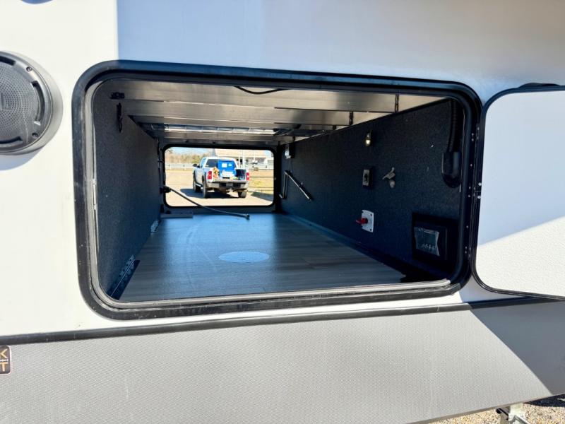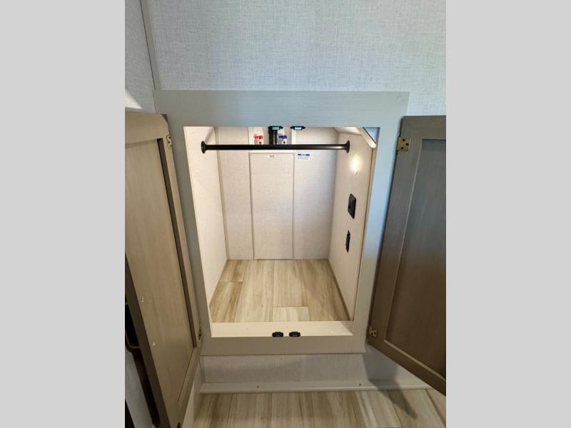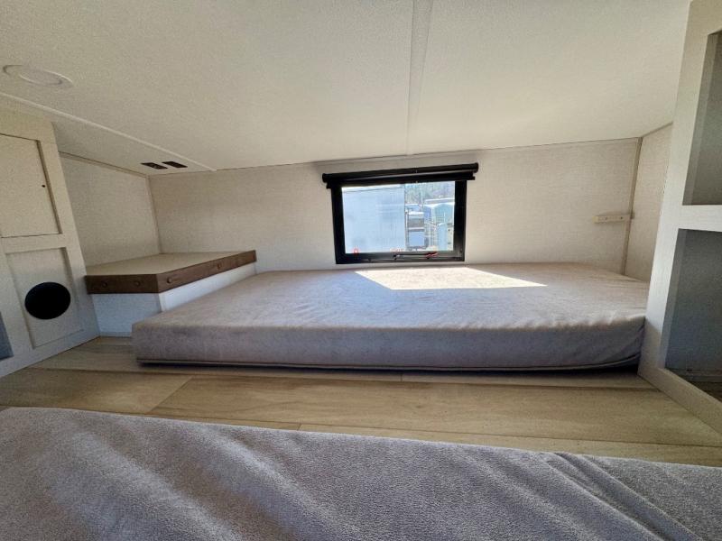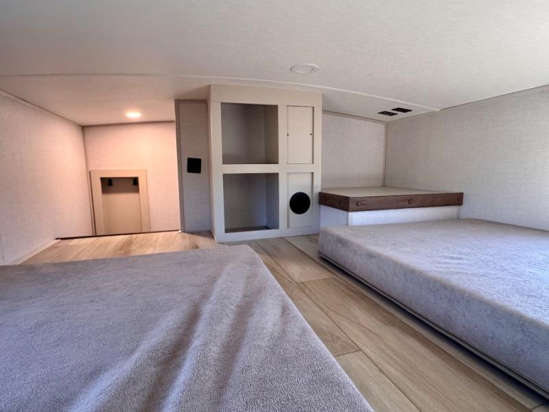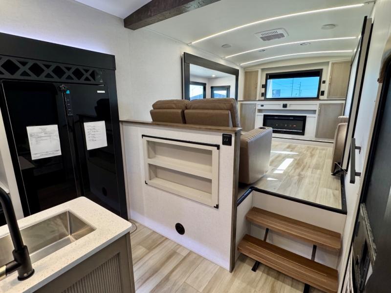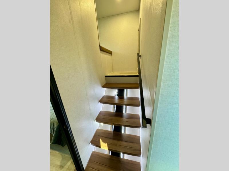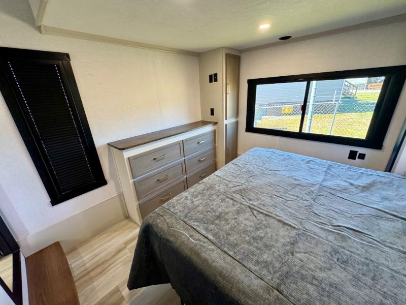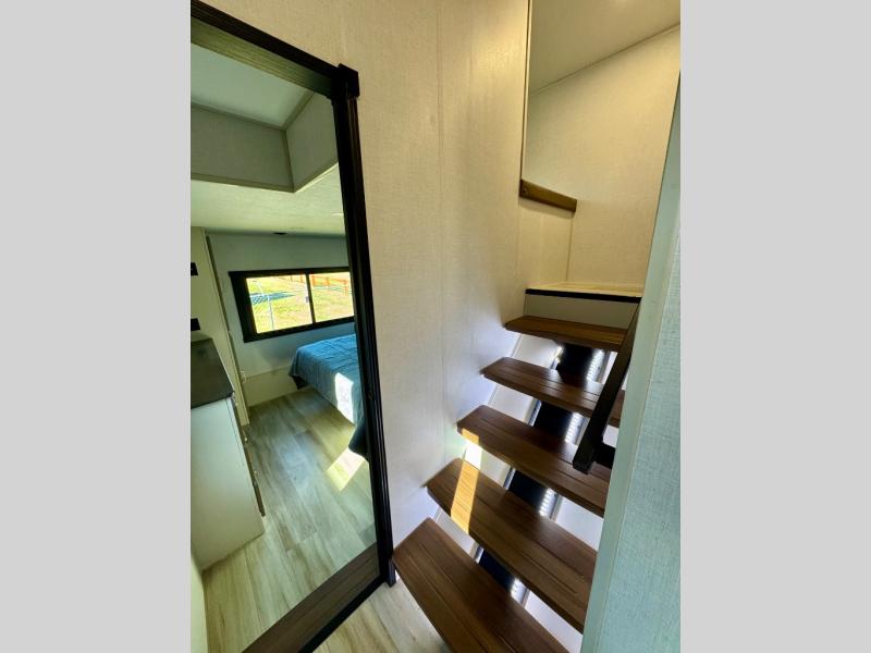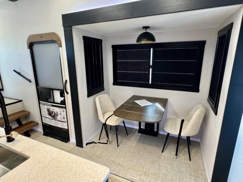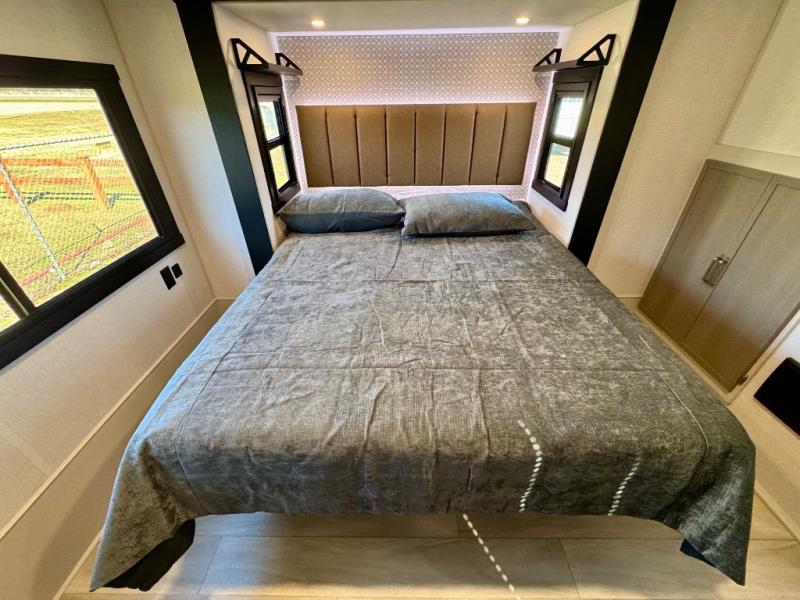 If you are looking for plenty of space, great views, and a place to call home, you have found it with this Wildwood Heritage Glen fifth wheel! The living area is separate from the kitchen and includes dual opposing tri-fold sofas with panoramic windows, theater seating with cupholders, and a 50" LED TV with a fireplace and storage along the front wall. The separate kitchen also offers lots of space with dual slides, a kitchen island, a free-standing table and chairs, and a hutch. You will find the loft stairs beside the full bathroom, and the rear private bedroom has a king bed slide for endless nights of rest and rejuvenation. There is so much more to enjoy from the loft above the bedroom, that features two 38" x 74" bunk mats, and storage for essentials, giving the whole family a place to rest in comfort.