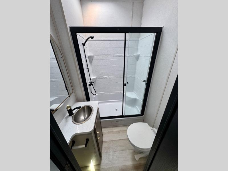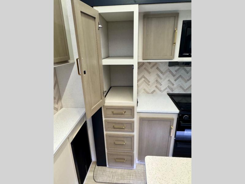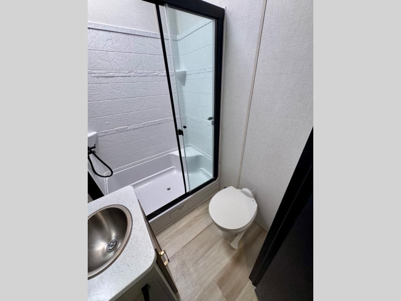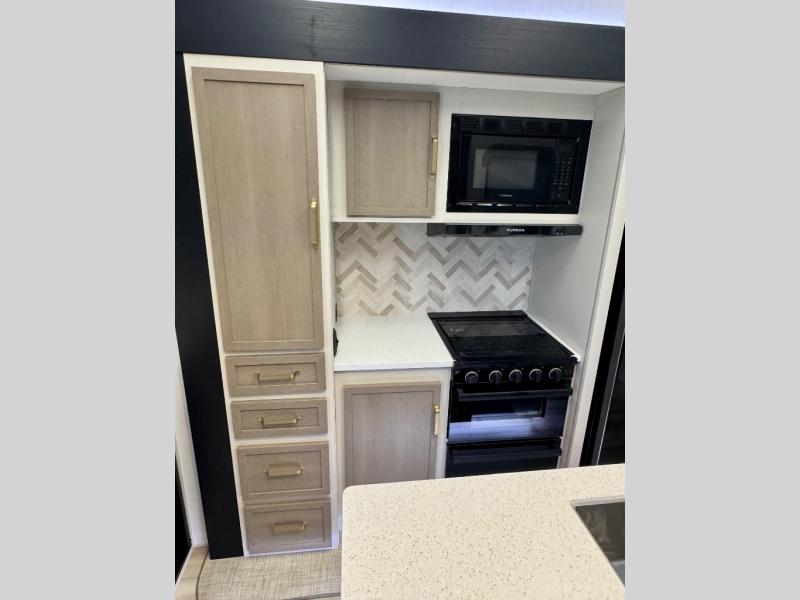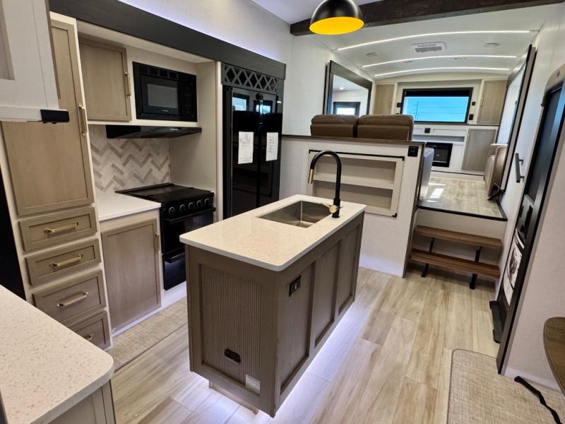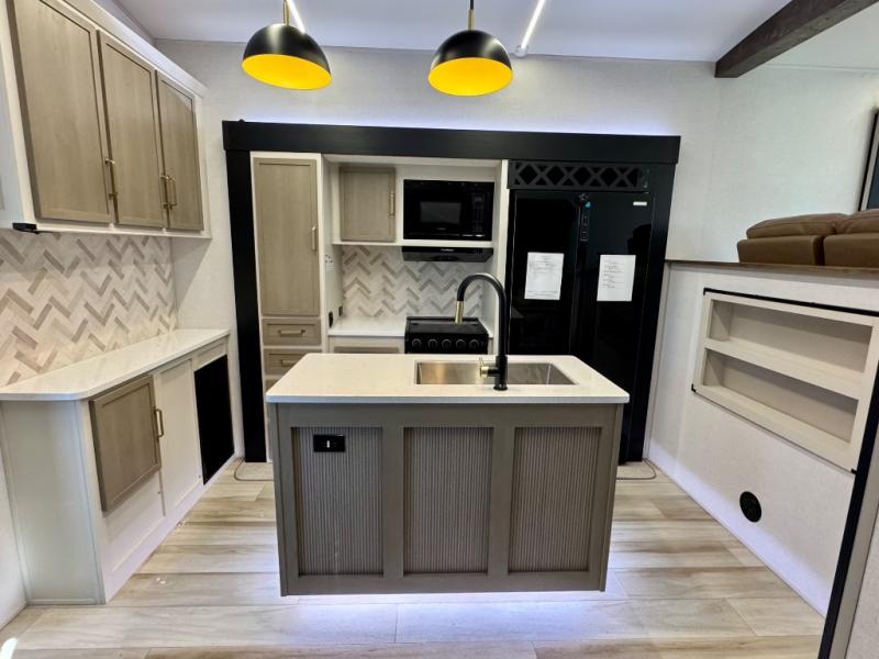 With any Wildwood Heritage Glen fifth wheel by Forest River, the quality construction, attention to detail and design along with a bright and welcoming interior allows you to relax in comfort. You'll love the high-end solid surface countertops included in the Elevated Value Package, along with a JBL sound system, full-length barreled ceilings, and an ultimate interior lighting upgrade. The included Expedition Package features an Accesibelly underbelly panel with 12V tank heaters, nitrogen-filled tires with aluminum rims, and a spacious 30" wide main entry door with a window. The Lippert On-The-Go ladder prep and back-up camera prep let you customize your fifth wheel even more, and the LED awning, front cap, marker and taillights will make it easier than ever to set up camp!