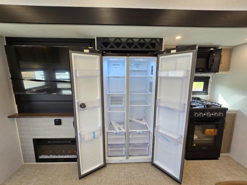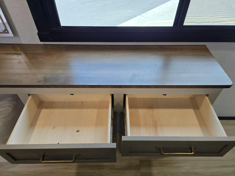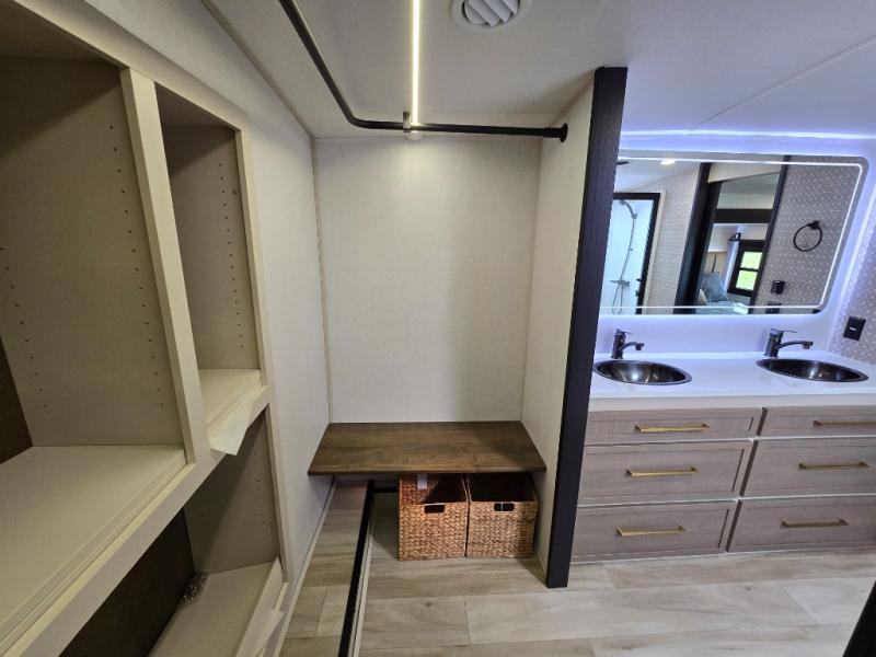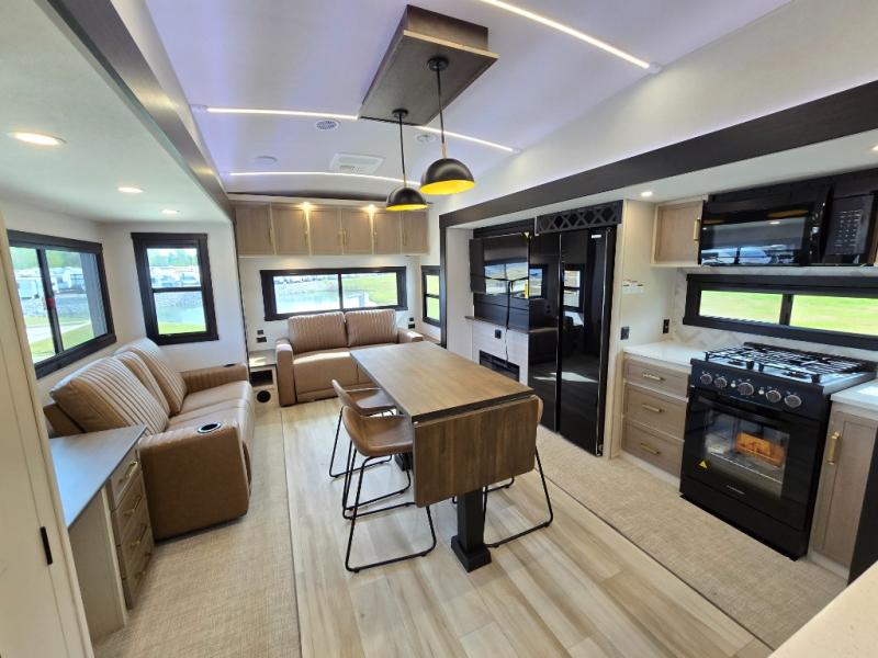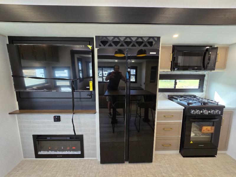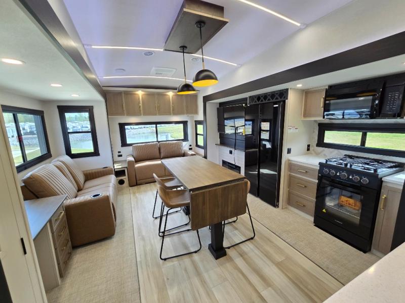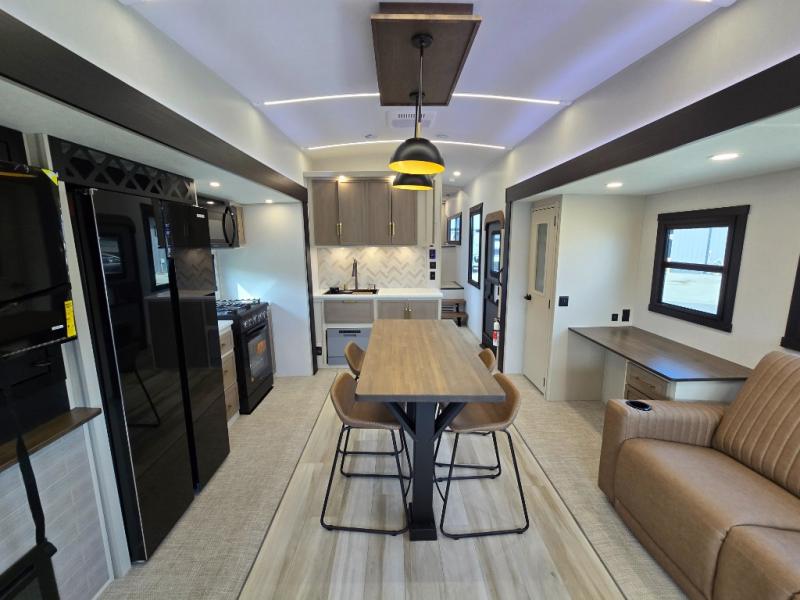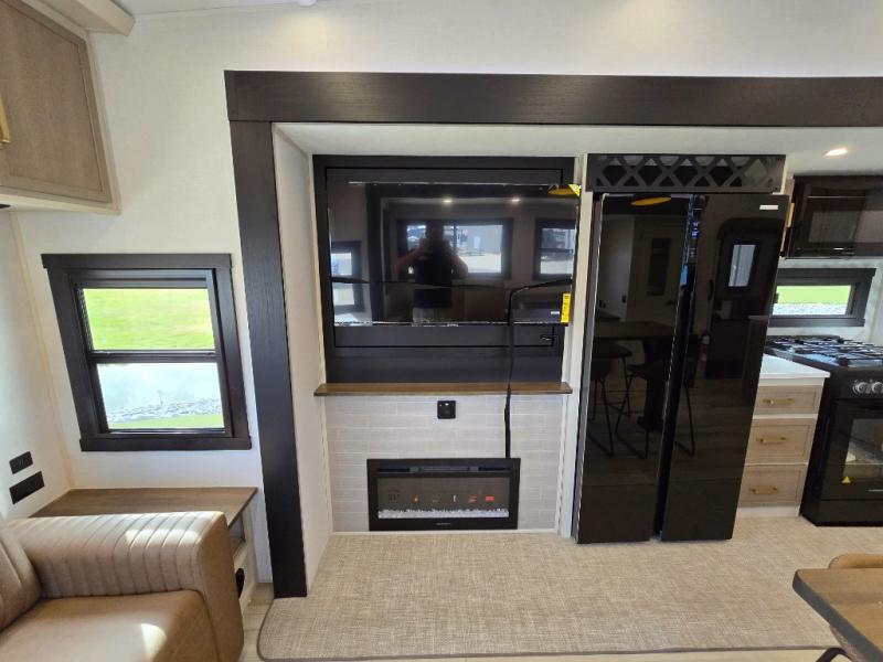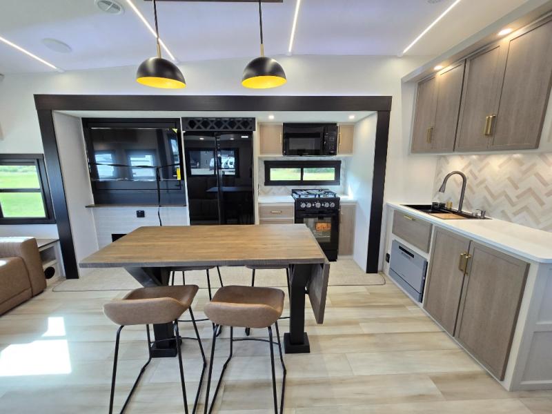 One look at this fifth wheel and you'll be sold! You can wake up each morning in the master bedroom that includes a custom king bed and a dresser with an ottoman. The front full bath has two bath sinks so you both can get ready at once, and you're going to love the walk-in wardrobe with wrap-around hanging rod. A half bath includes a floating shelf with a hanging rod plus washer/dryer prep, giving you the option to make this a laundry room! The back of this unit is where you can cook meals with full kitchen amenities, dine at the kitchen island with four chairs, and relax on the theater seating and tri-fold sofa. A 50" TV and fireplace is also found here, complete with hidden storage behind for board games, movies, and snacks!