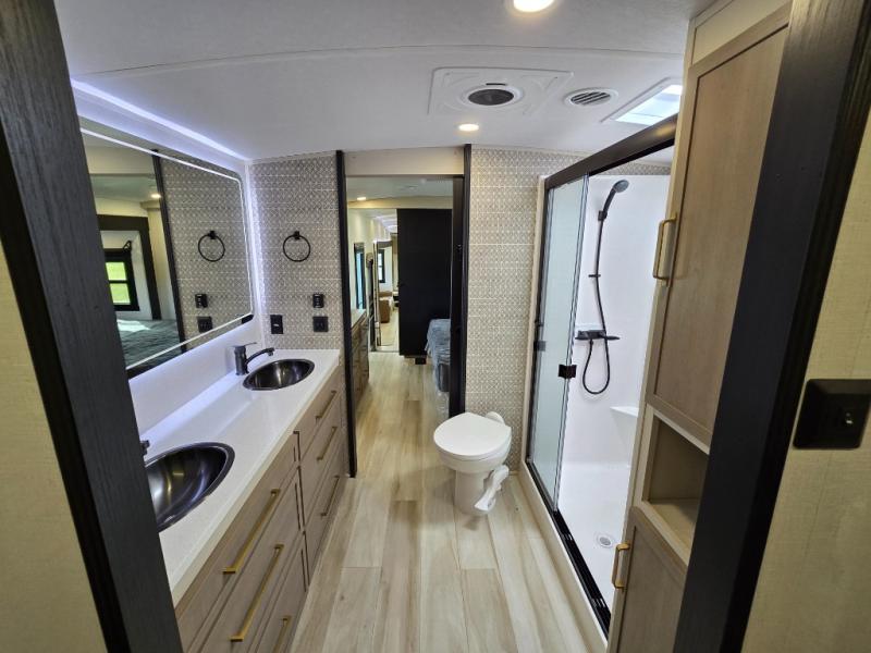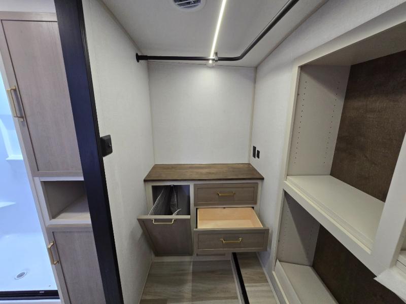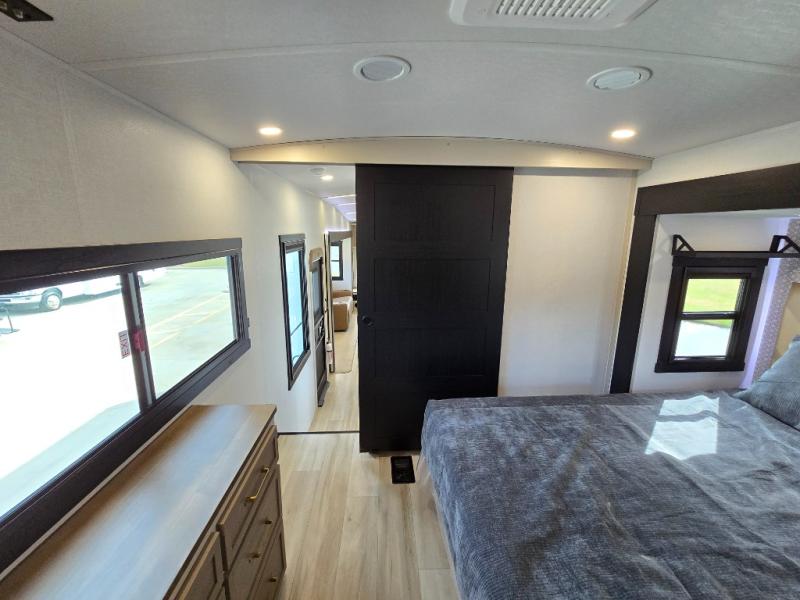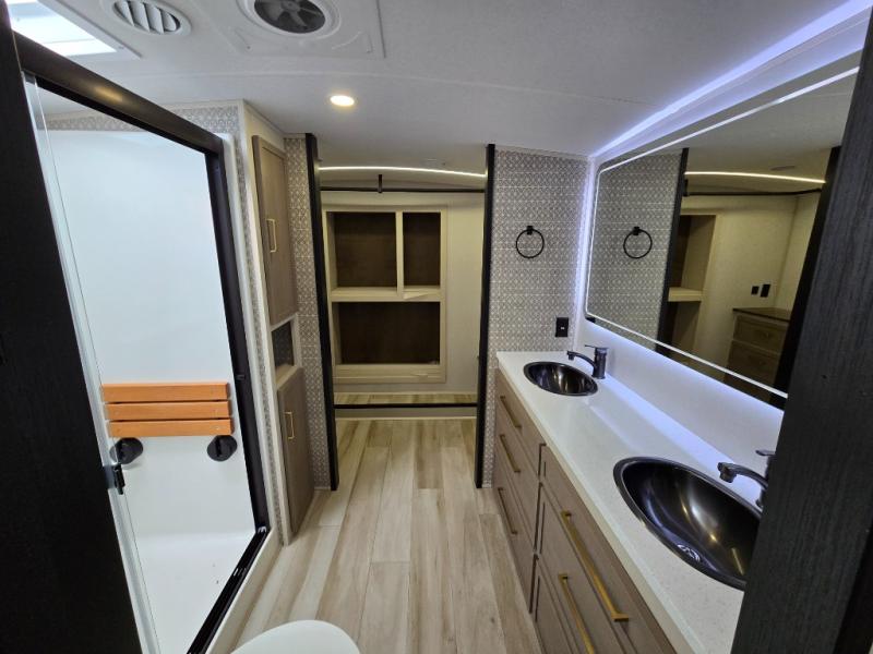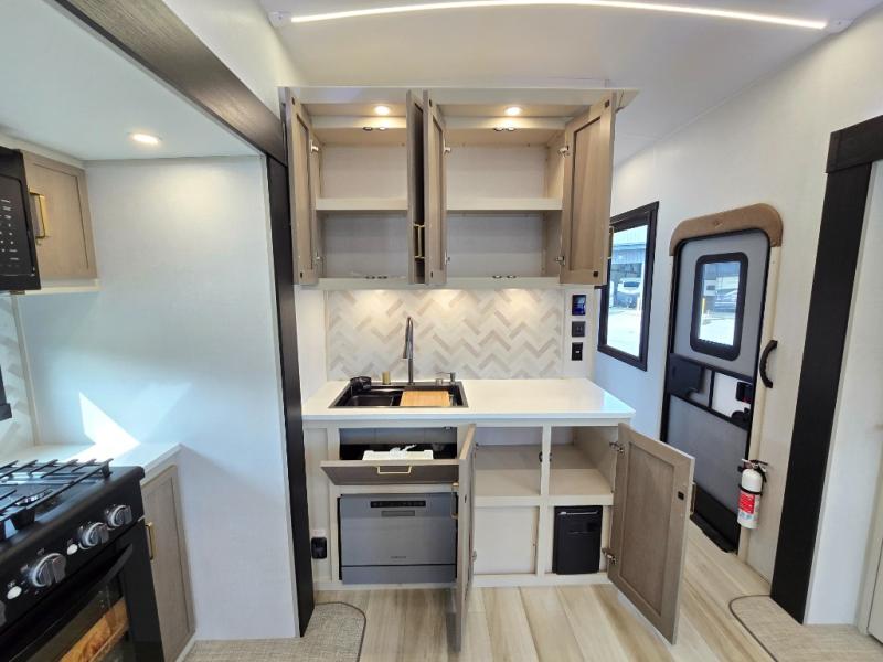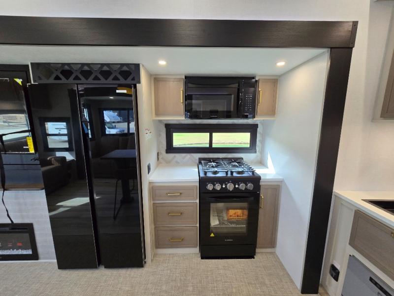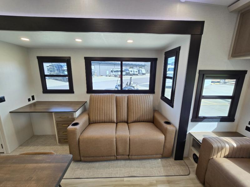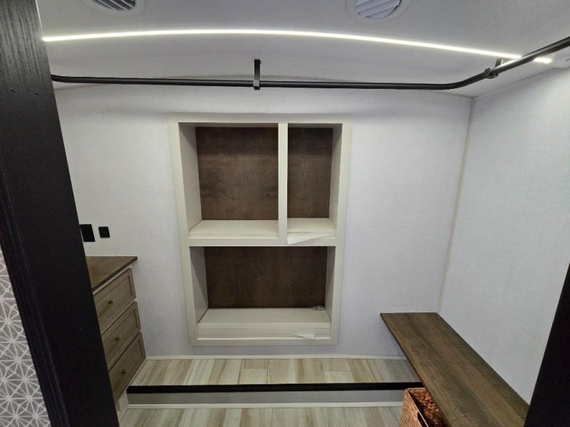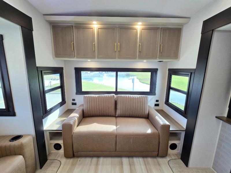 One look at this fifth wheel and you'll be sold! You can wake up each morning in the master bedroom that includes a custom king bed and a dresser with an ottoman. The front full bath has two bath sinks so you both can get ready at once, and you're going to love the walk-in wardrobe with wrap-around hanging rod. A half bath includes a floating shelf with a hanging rod plus washer/dryer prep, giving you the option to make this a laundry room! The back of this unit is where you can cook meals with full kitchen amenities, dine at the kitchen island with four chairs, and relax on the theater seating and tri-fold sofa. A 50" TV and fireplace is also found here, complete with hidden storage behind for board games, movies, and snacks!