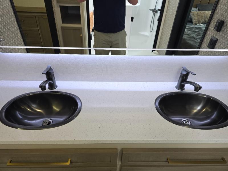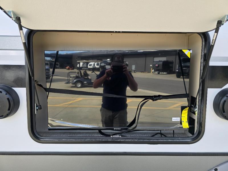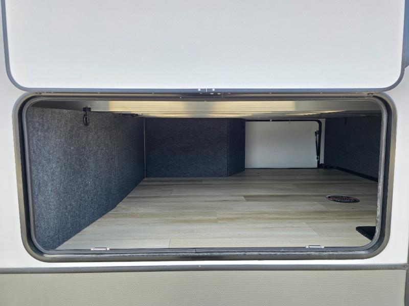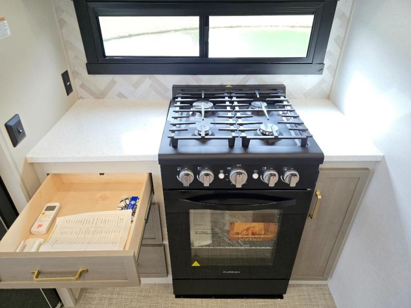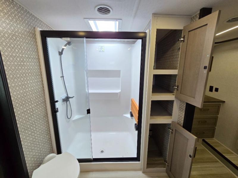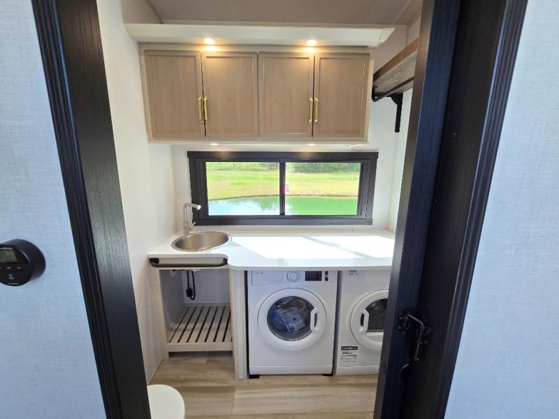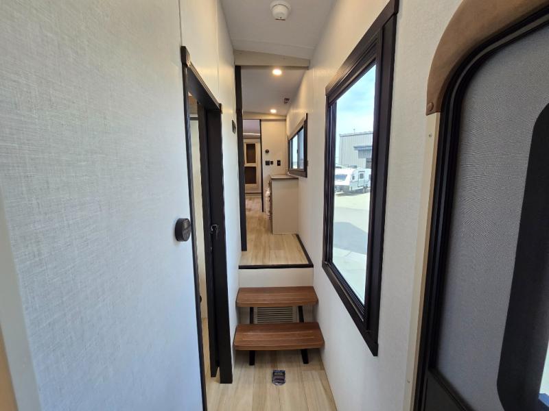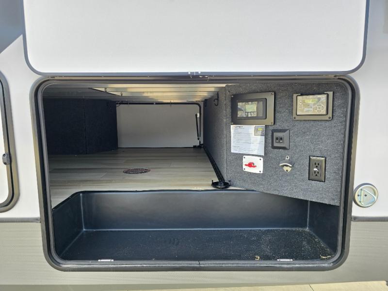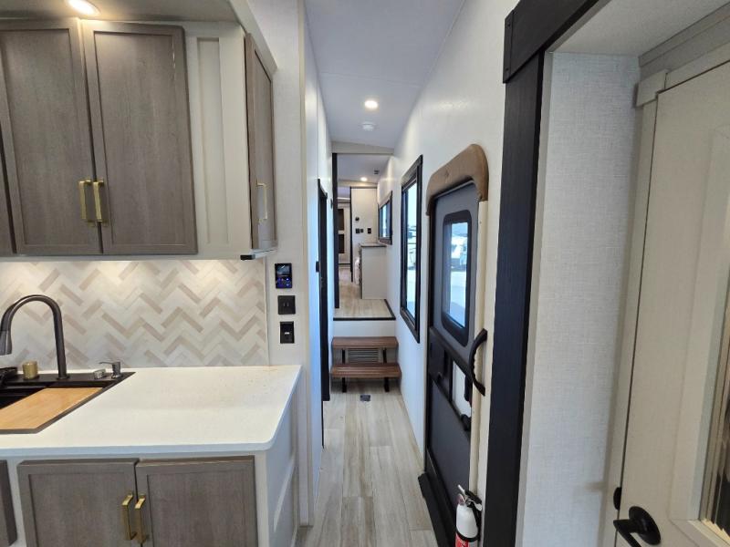 One look at this fifth wheel and you'll be sold! You can wake up each morning in the master bedroom that includes a custom king bed and a dresser with an ottoman. The front full bath has two bath sinks so you both can get ready at once, and you're going to love the walk-in wardrobe with wrap-around hanging rod. A half bath includes a floating shelf with a hanging rod plus washer/dryer prep, giving you the option to make this a laundry room! The back of this unit is where you can cook meals with full kitchen amenities, dine at the kitchen island with four chairs, and relax on the theater seating and tri-fold sofa. A 50" TV and fireplace is also found here, complete with hidden storage behind for board games, movies, and snacks!