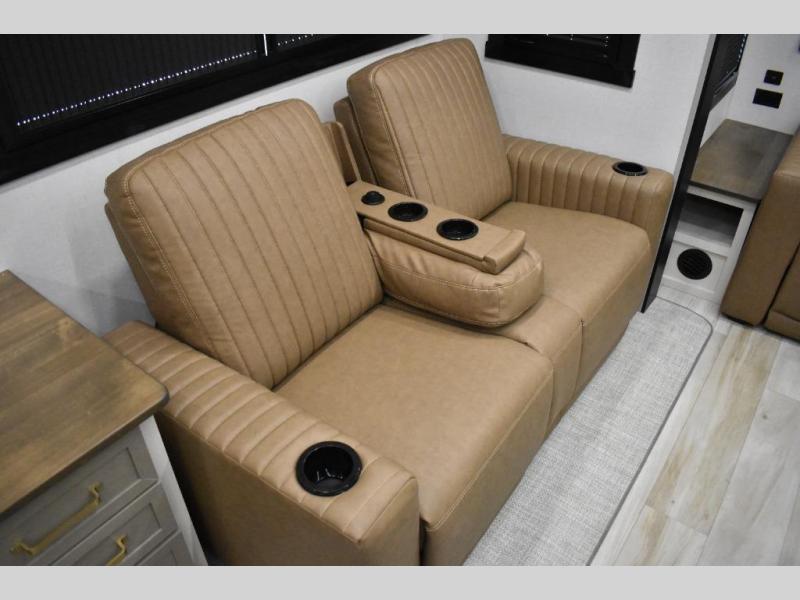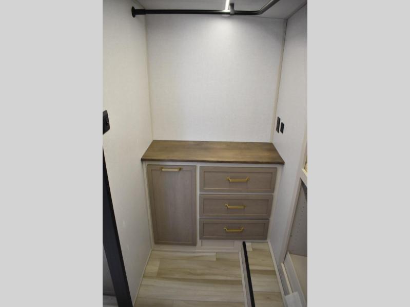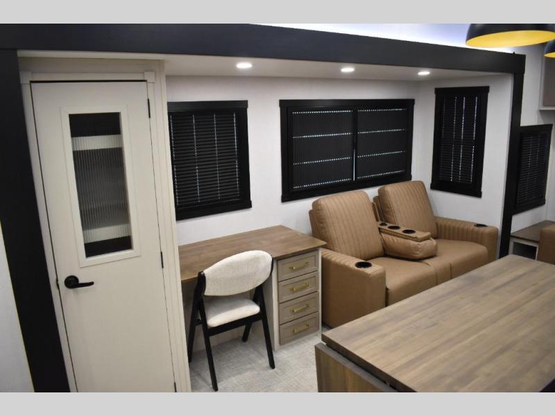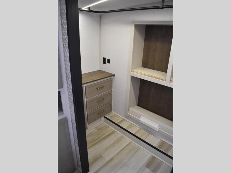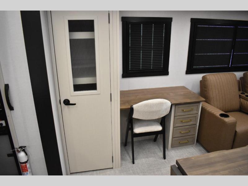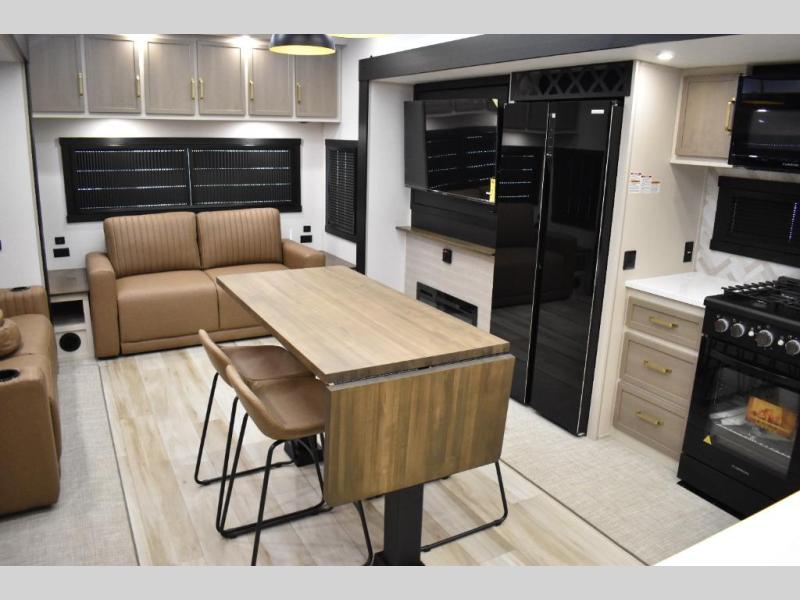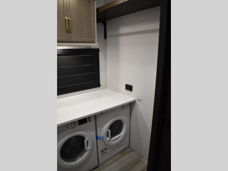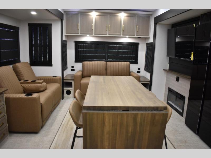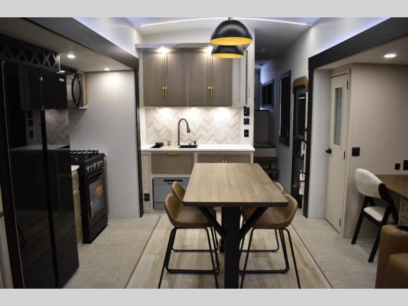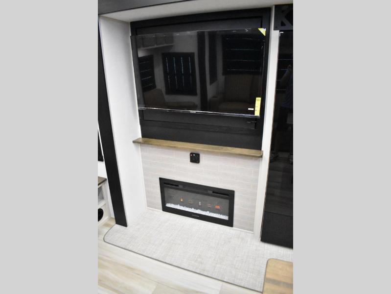 One look at this fifth wheel and you'll be sold! You can wake up each morning in the master bedroom that includes a custom king bed and a dresser with an ottoman. The front full bath has two bath sinks so you both can get ready at once, and you're going to love the walk-in wardrobe with a wrap-around hanging rod. A half bath includes a floating shelf with a hanging rod plus washer/dryer prep, giving you the option to make this a laundry room! The back of this unit is where you can cook meals with full kitchen amenities, dine at the kitchen island with four chairs, and relax on the theater seating and tri-fold sofa. A 50" TV and fireplace is also found here, complete with hidden storage behind for board games, movies, and snacks!