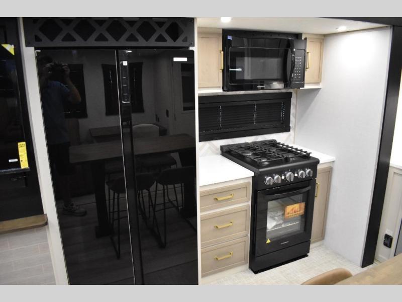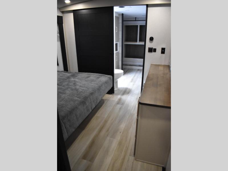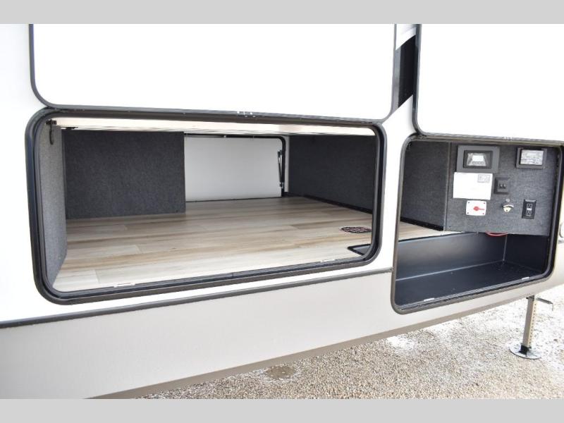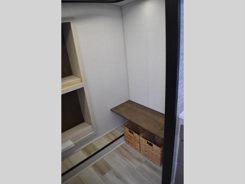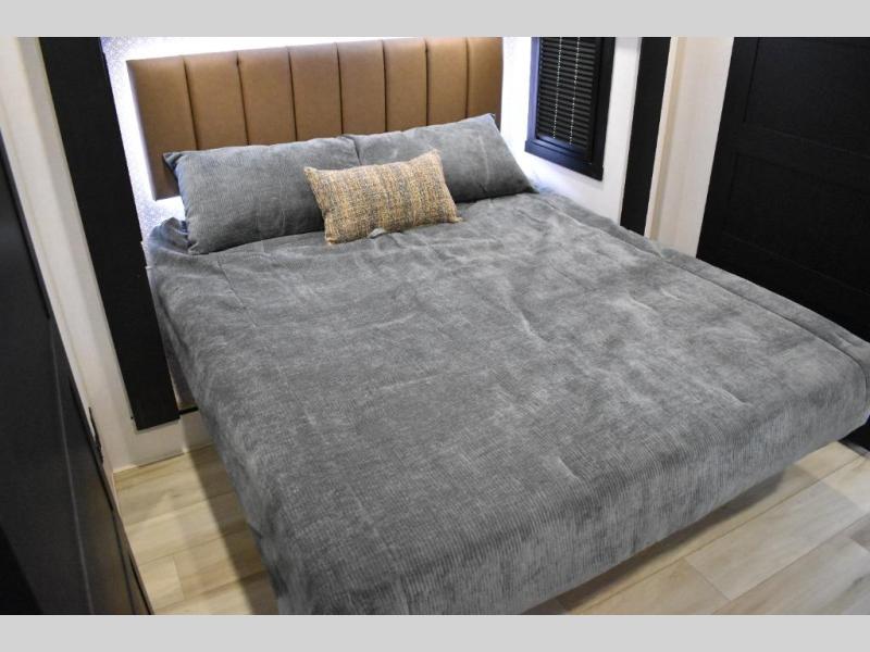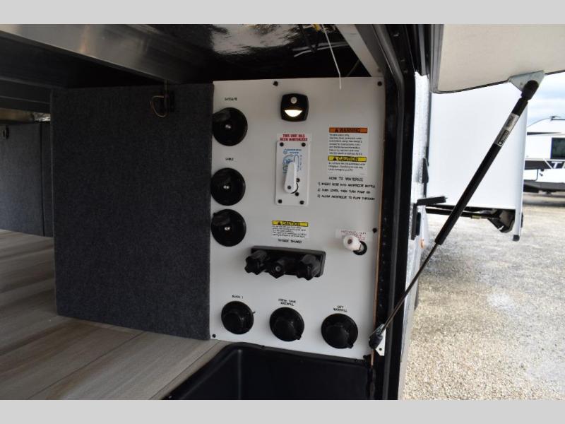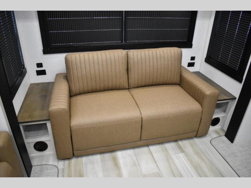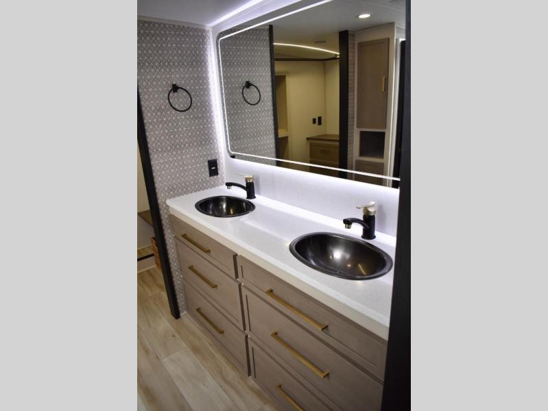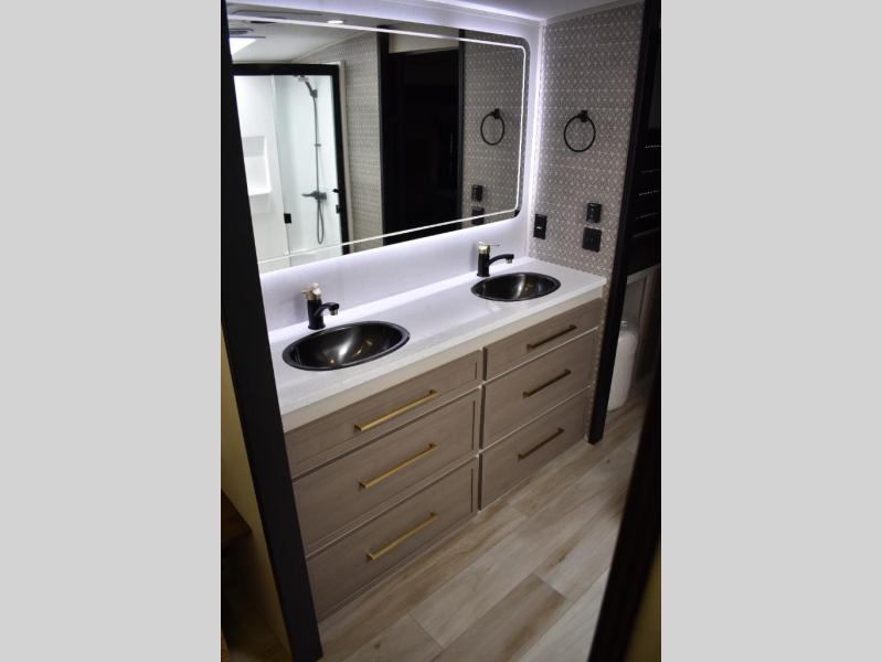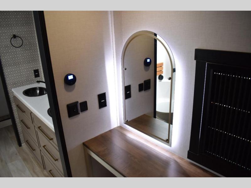 One look at this fifth wheel and you'll be sold! You can wake up each morning in the master bedroom that includes a custom king bed and a dresser with an ottoman. The front full bath has two bath sinks so you both can get ready at once, and you're going to love the walk-in wardrobe with a wrap-around hanging rod. A half bath includes a floating shelf with a hanging rod plus washer/dryer prep, giving you the option to make this a laundry room! The back of this unit is where you can cook meals with full kitchen amenities, dine at the kitchen island with four chairs, and relax on the theater seating and tri-fold sofa. A 50" TV and fireplace is also found here, complete with hidden storage behind for board games, movies, and snacks!