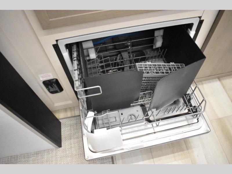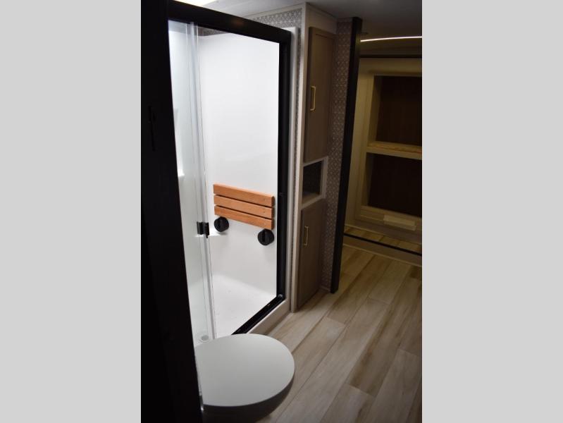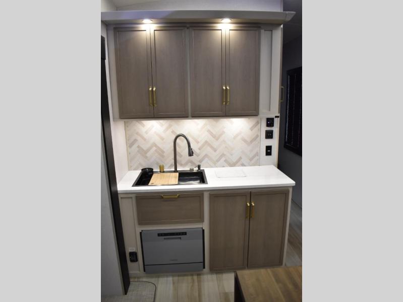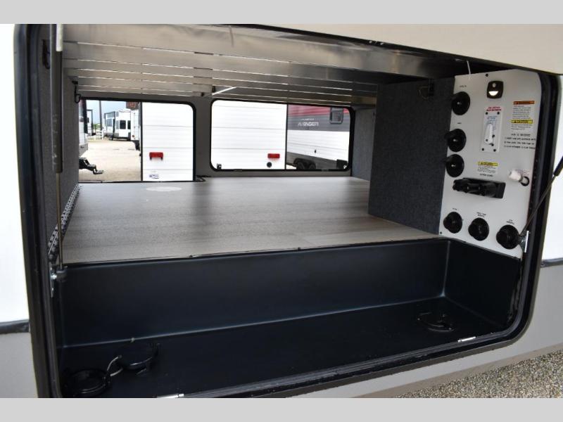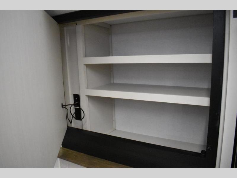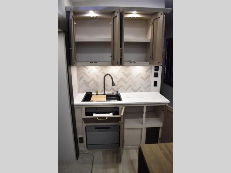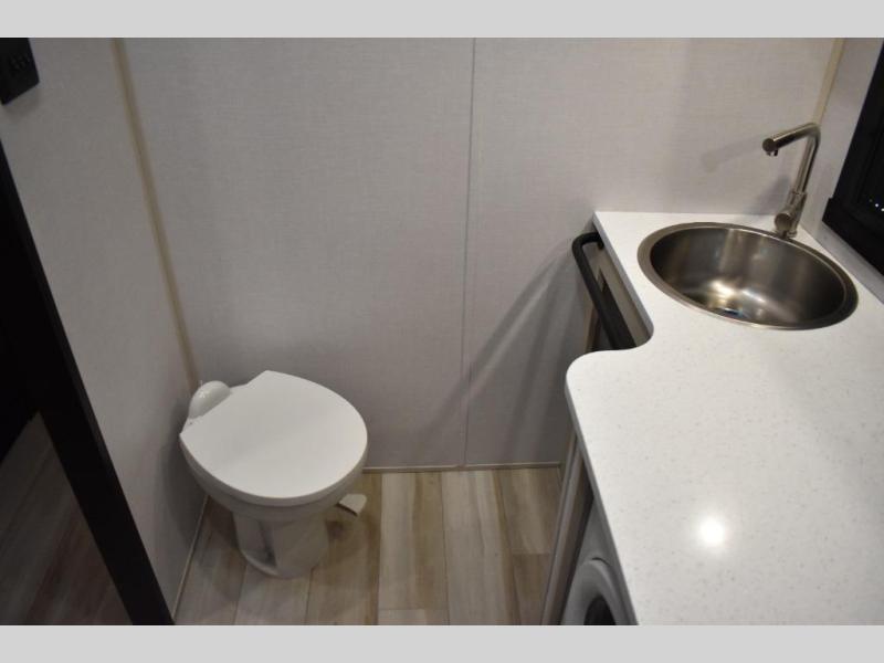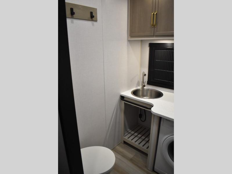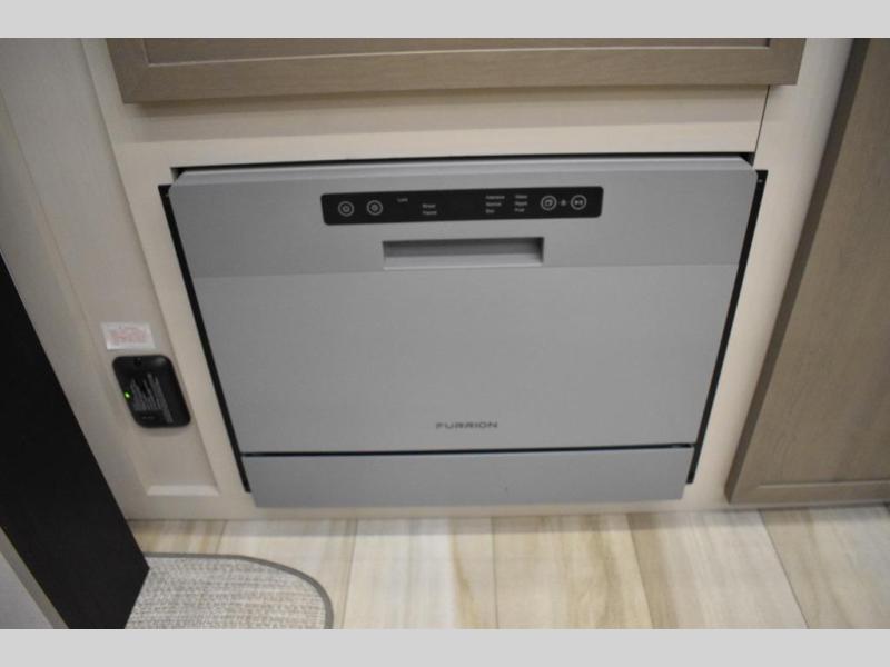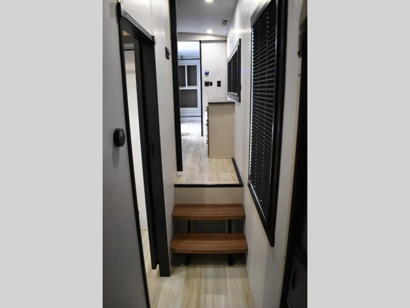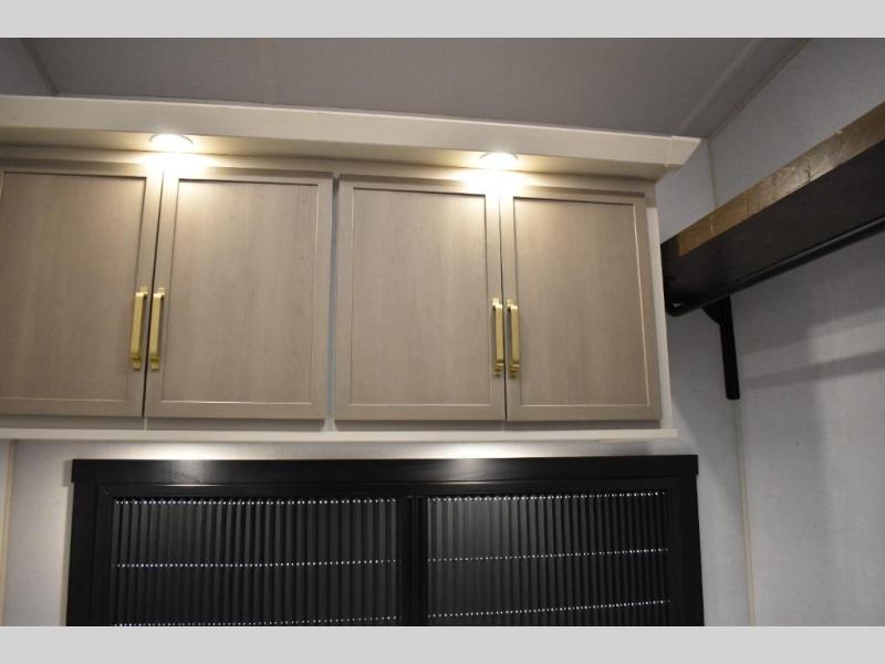 One look at this fifth wheel and you'll be sold! You can wake up each morning in the master bedroom that includes a custom king bed and a dresser with an ottoman. The front full bath has two bath sinks so you both can get ready at once, and you're going to love the walk-in wardrobe with a wrap-around hanging rod. A half bath includes a floating shelf with a hanging rod plus washer/dryer prep, giving you the option to make this a laundry room! The back of this unit is where you can cook meals with full kitchen amenities, dine at the kitchen island with four chairs, and relax on the theater seating and tri-fold sofa. A 50" TV and fireplace is also found here, complete with hidden storage behind for board games, movies, and snacks!