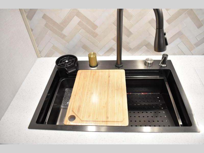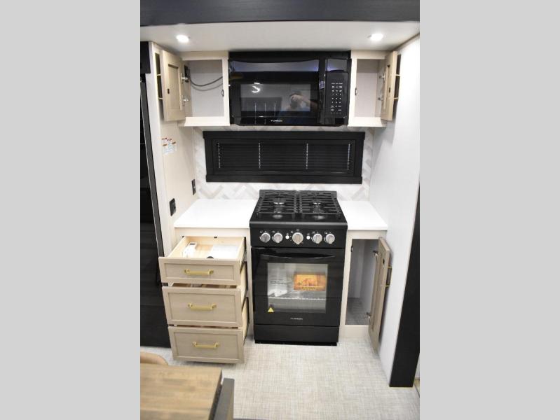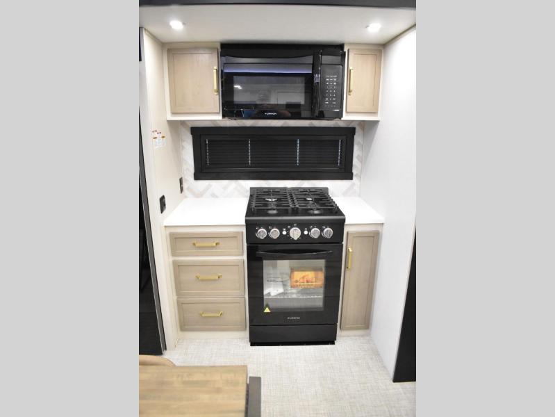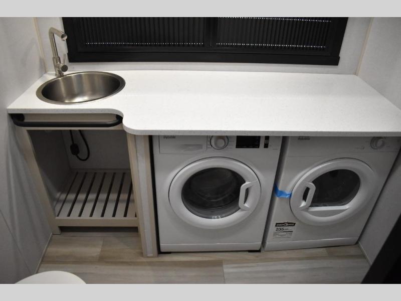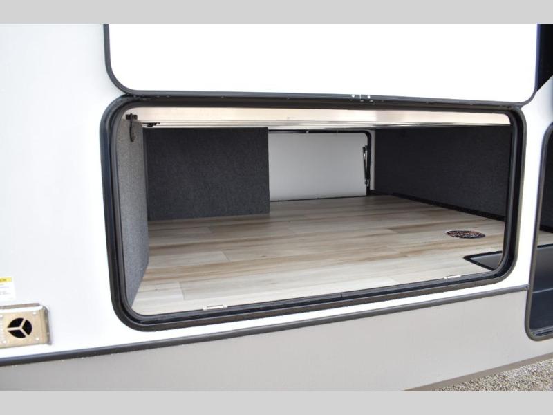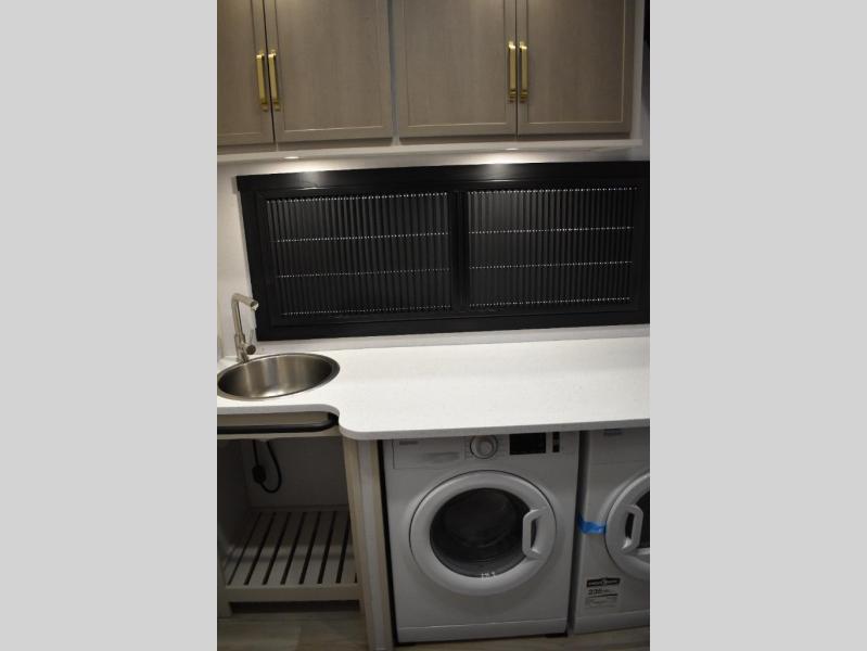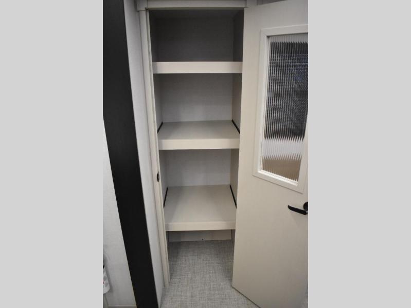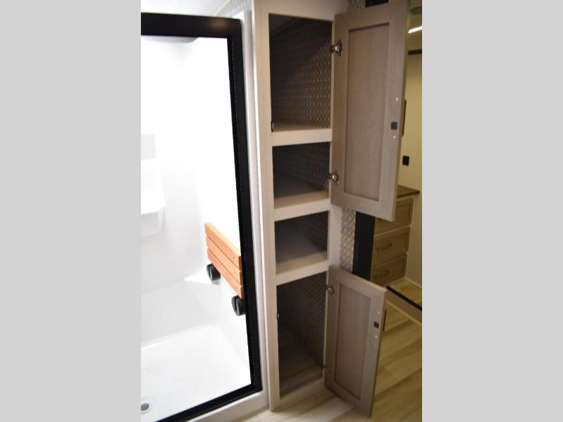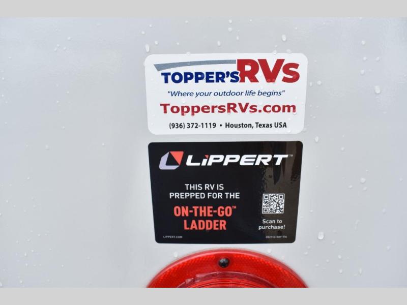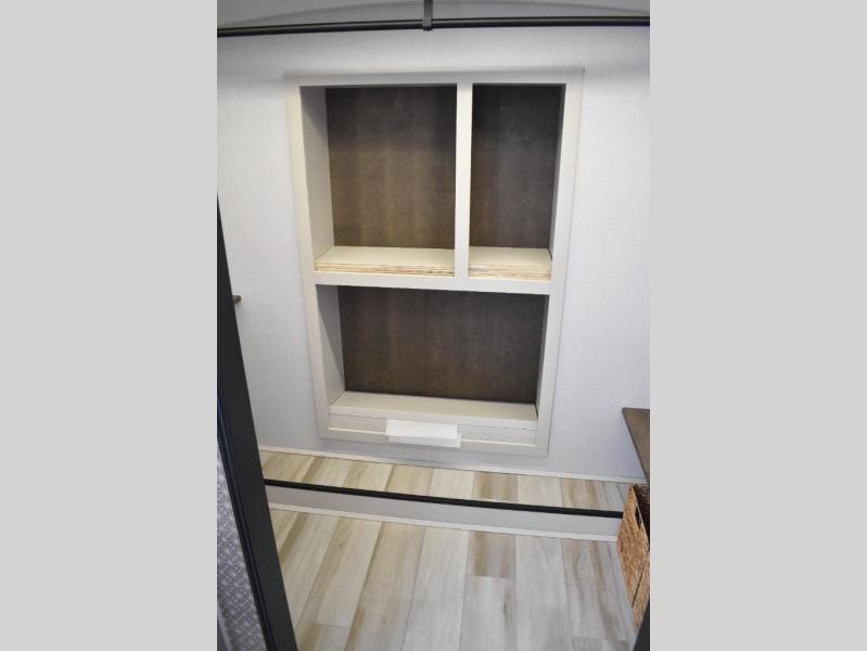 One look at this fifth wheel and you'll be sold! You can wake up each morning in the master bedroom that includes a custom king bed and a dresser with an ottoman. The front full bath has two bath sinks so you both can get ready at once, and you're going to love the walk-in wardrobe with a wrap-around hanging rod. A half bath includes a floating shelf with a hanging rod plus washer/dryer prep, giving you the option to make this a laundry room! The back of this unit is where you can cook meals with full kitchen amenities, dine at the kitchen island with four chairs, and relax on the theater seating and tri-fold sofa. A 50" TV and fireplace is also found here, complete with hidden storage behind for board games, movies, and snacks!