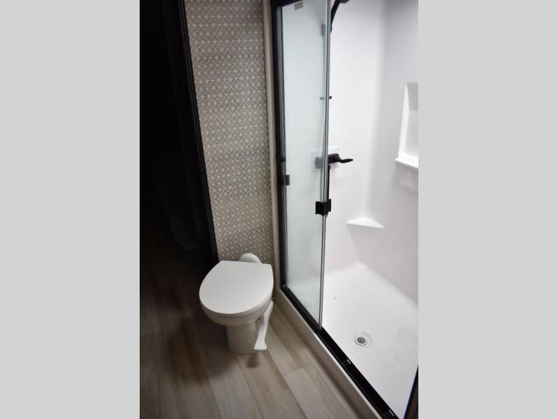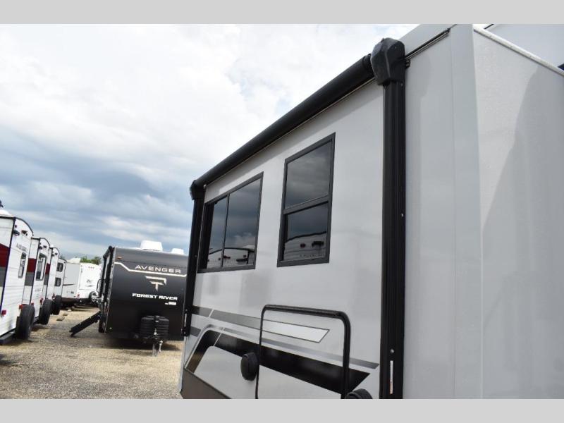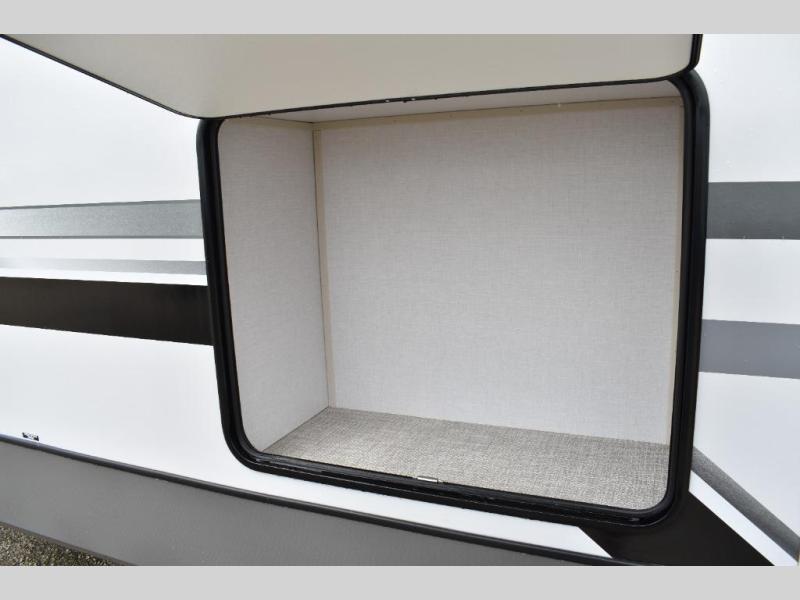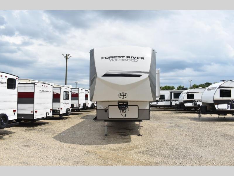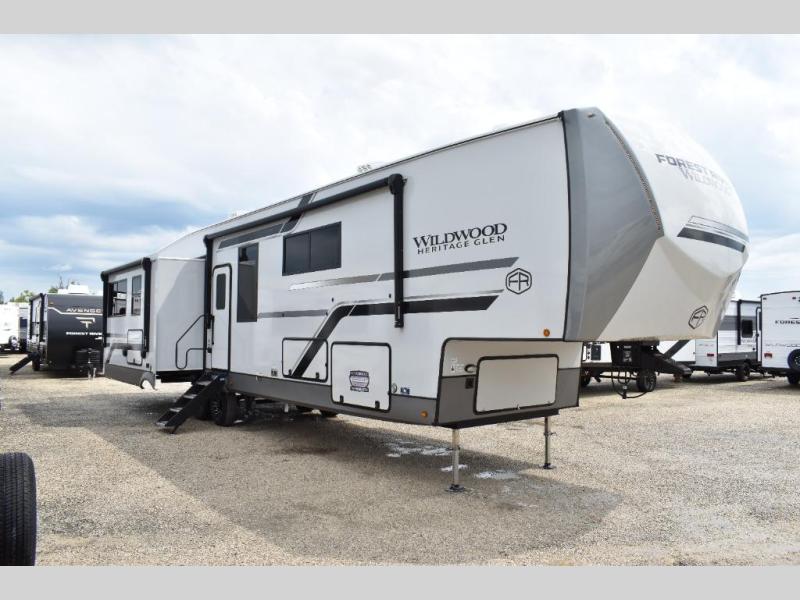 With any Wildwood Heritage Glen fifth wheel by Forest River, the quality construction, attention to detail and design along with a bright and welcoming interior allows you to relax in comfort. You'll love the high-end solid surface countertops included in the Elevated Value Package, along with a JBL sound system, full-length barreled ceilings, and an ultimate interior lighting upgrade. The included Expedition Package features an Accesibelly underbelly panel with 12V tank heaters, nitrogen-filled tires with aluminum rims, and a spacious 30" wide main entry door with a window. The Lippert On-The-Go ladder prep and back-up camera prep let you customize your fifth wheel even more, and the LED awning, front cap, marker and taillights will make it easier than ever to set up camp!