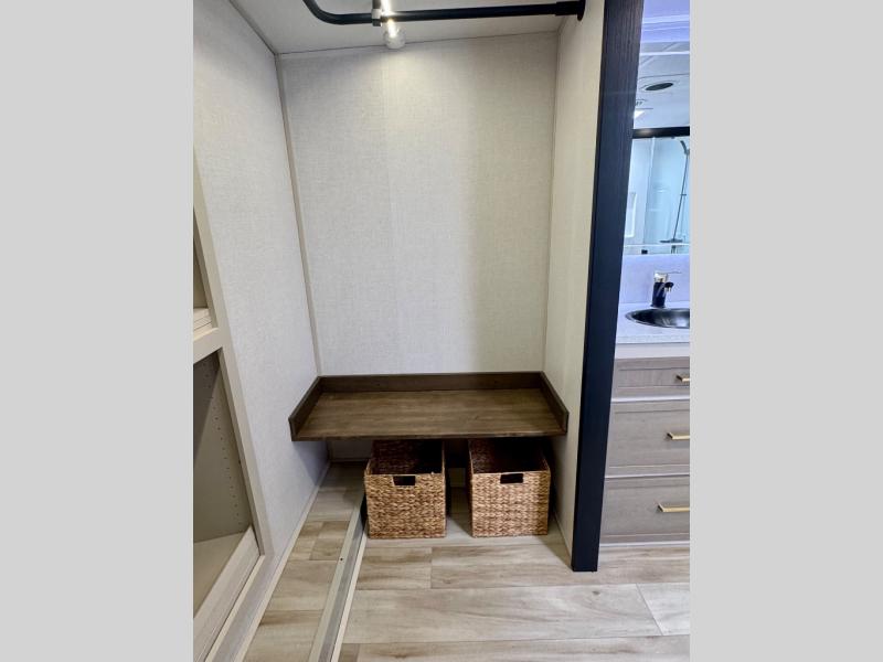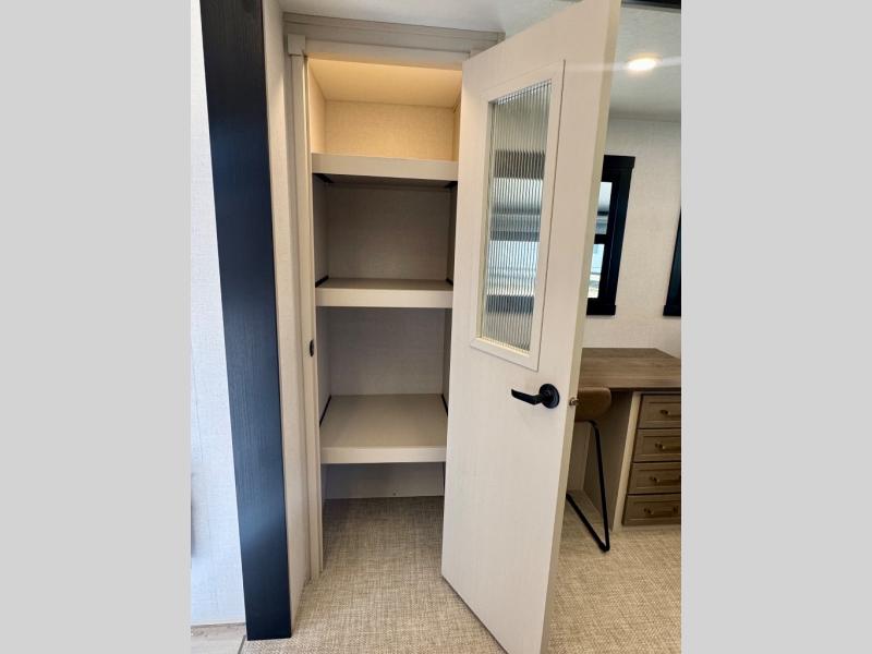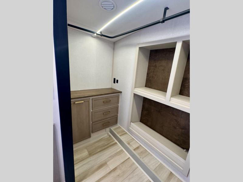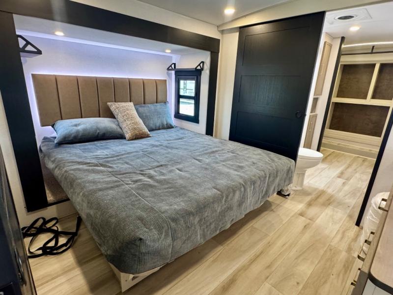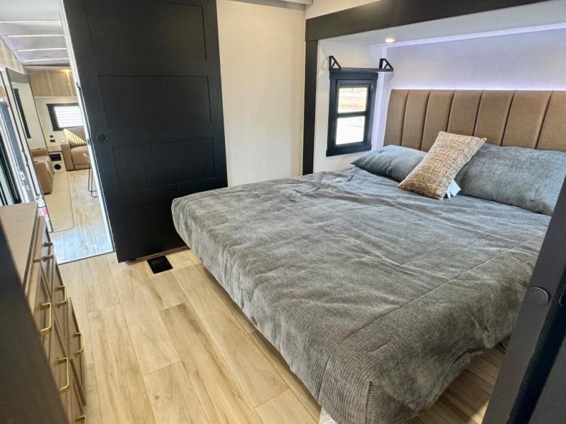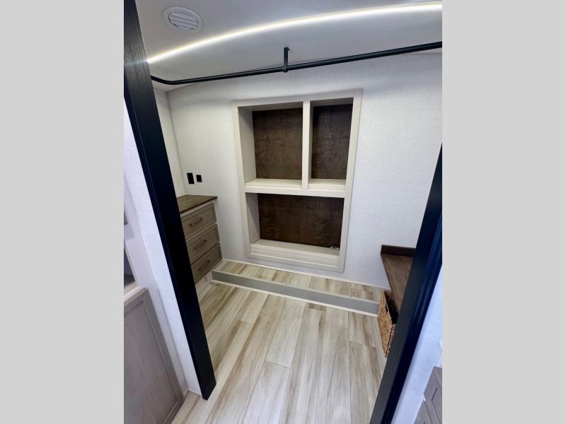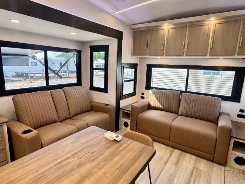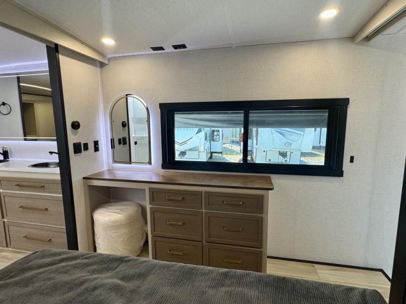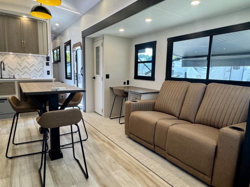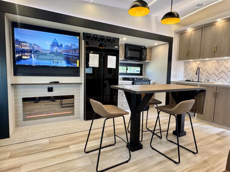 One look at this fifth wheel and you'll be sold! You can wake up each morning in the master bedroom that includes a custom king bed and a dresser with an ottoman. The front full bath has two bath sinks so you both can get ready at once, and you're going to love the walk-in wardrobe with a wrap-around hanging rod. A half bath includes a floating shelf with a hanging rod plus washer/dryer prep, giving you the option to make this a laundry room! The back of this unit is where you can cook meals with full kitchen amenities, dine at the kitchen island with four chairs, and relax on the theater seating and tri-fold sofa. A 50" TV and fireplace is also found here, complete with hidden storage behind for board games, movies, and snacks!