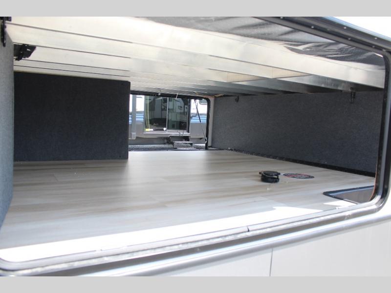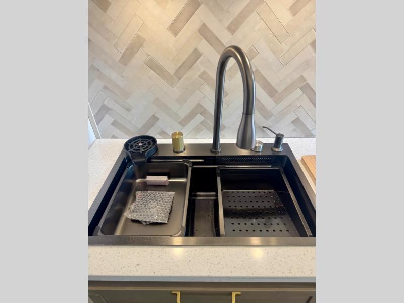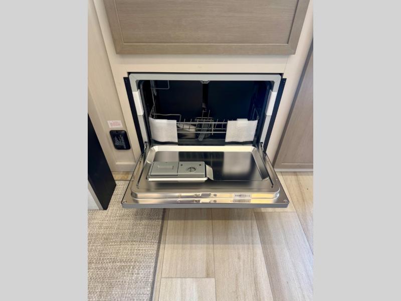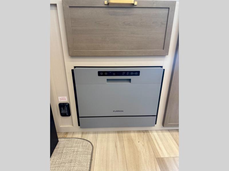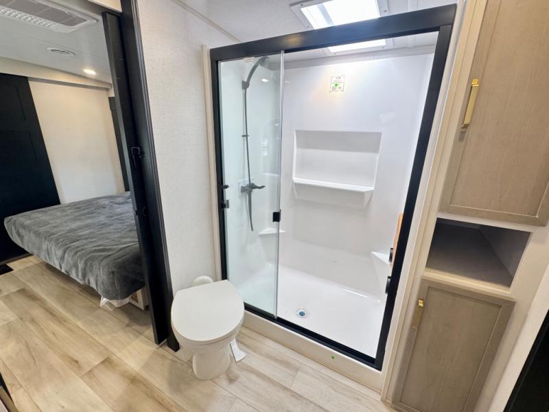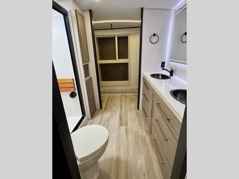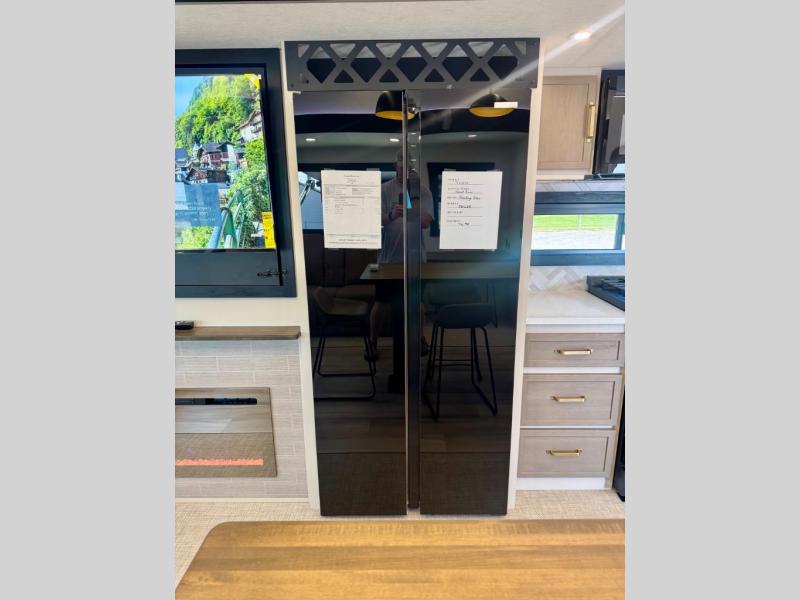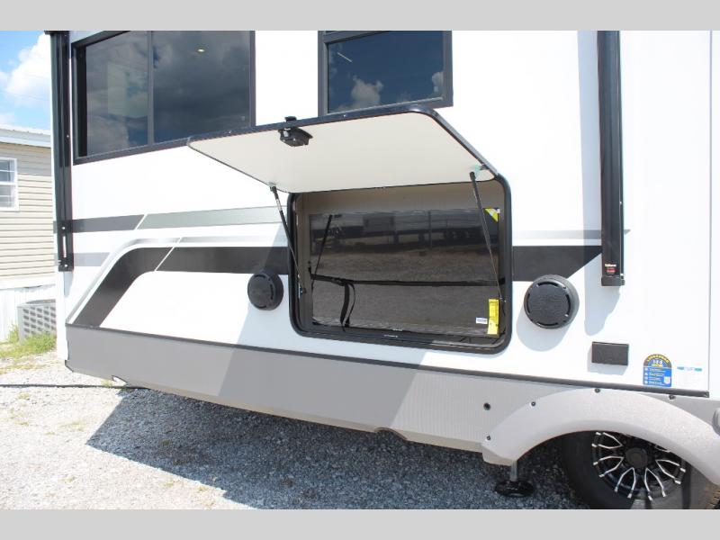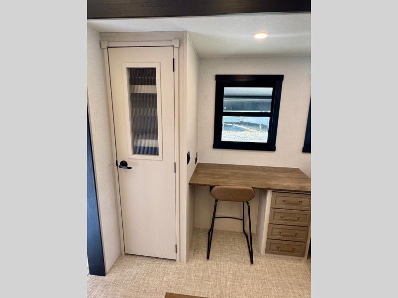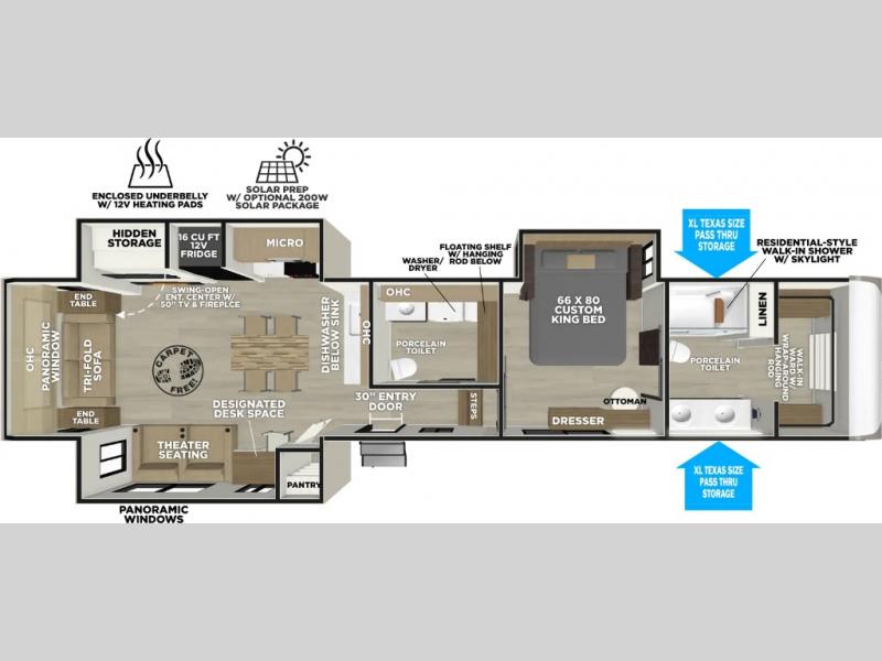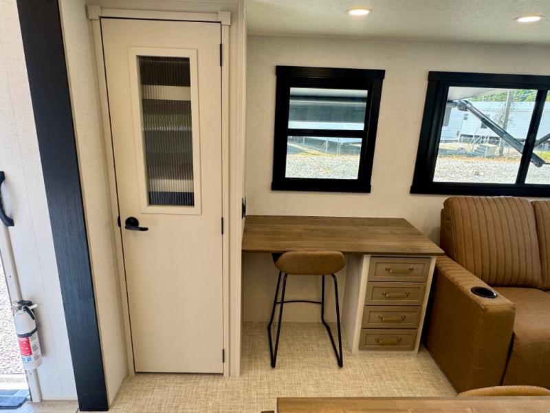 One look at this fifth wheel and you'll be sold! You can wake up each morning in the master bedroom that includes a custom king bed and a dresser with an ottoman. The front full bath has two bath sinks so you both can get ready at once, and you're going to love the walk-in wardrobe with a wrap-around hanging rod. A half bath includes a floating shelf with a hanging rod plus washer/dryer prep, giving you the option to make this a laundry room! The back of this unit is where you can cook meals with full kitchen amenities, dine at the kitchen island with four chairs, and relax on the theater seating and tri-fold sofa. A 50" TV and fireplace is also found here, complete with hidden storage behind for board games, movies, and snacks!