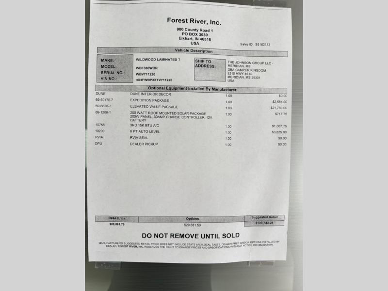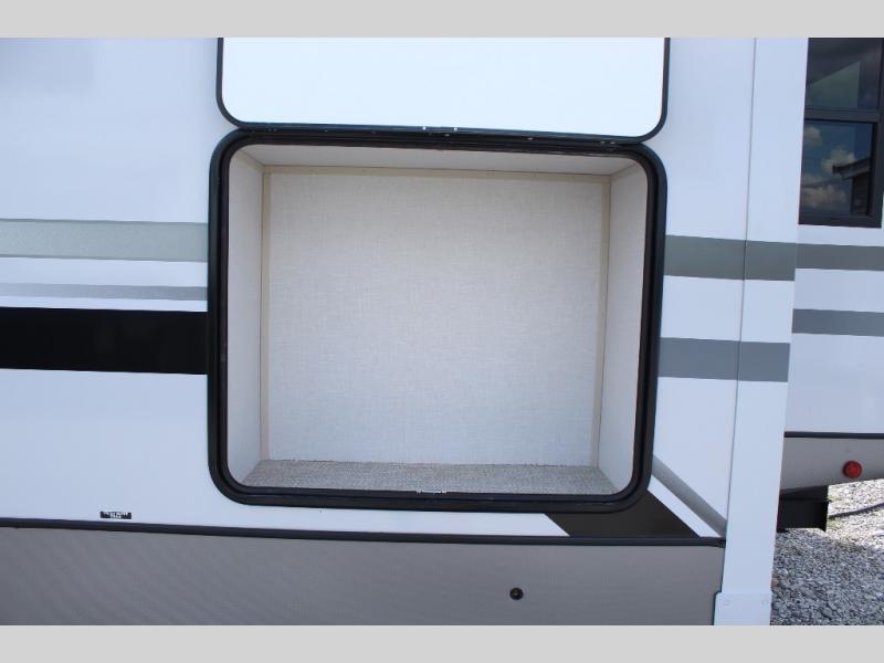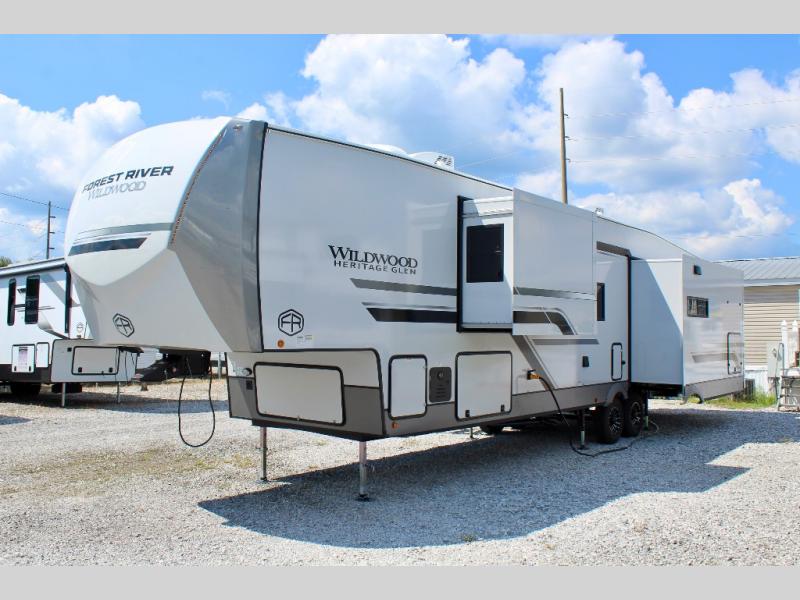 With any Wildwood Heritage Glen fifth wheel by Forest River, the quality construction, attention to detail and design along with a bright and welcoming interior allows you to relax in comfort. You'll love the high-end solid surface countertops included in the Elevated Value Package, along with a JBL sound system, full-length barreled ceilings, and an ultimate interior lighting upgrade. The included Expedition Package features an Accesibelly underbelly panel with 12V tank heaters, nitrogen-filled tires with aluminum rims, and a spacious 30" wide main entry door with a window. The Lippert On-The-Go ladder prep and back-up camera prep let you customize your fifth wheel even more, and the LED awning, front cap, marker and taillights will make it easier than ever to set up camp!