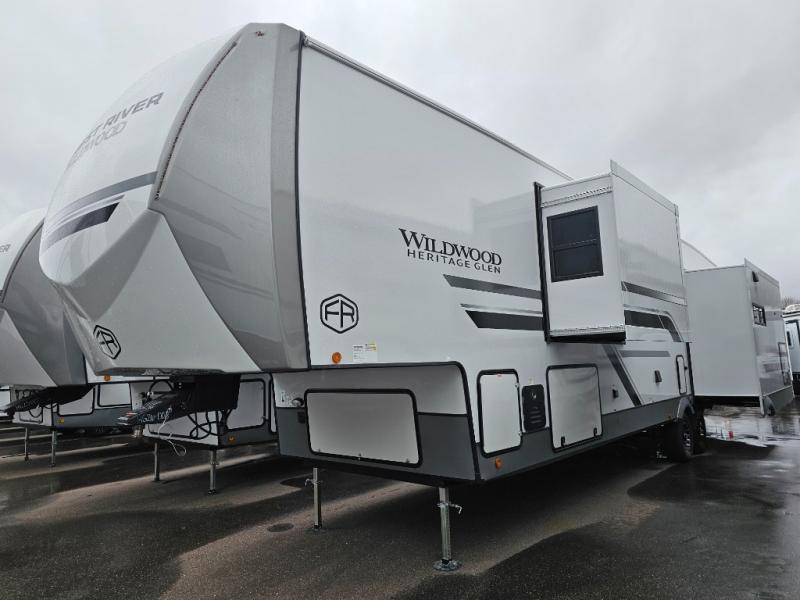 With any Wildwood Heritage Glen fifth wheel by Forest River, the quality construction, attention to detail and design along with a bright and welcoming interior allows you to relax in comfort. You'll love the high-end solid surface countertops included in the Elevated Value Package, along with a JBL sound system, full-length barreled ceilings, and an ultimate interior lighting upgrade. The included Expedition Package features an Accesibelly underbelly panel with 12V tank heaters, nitrogen-filled tires with aluminum rims, and a spacious 30" wide main entry door with a window. The Lippert On-The-Go ladder prep and back-up camera prep let you customize your fifth wheel even more, and the LED awning, front cap, marker and taillights will make it easier than ever to set up camp!