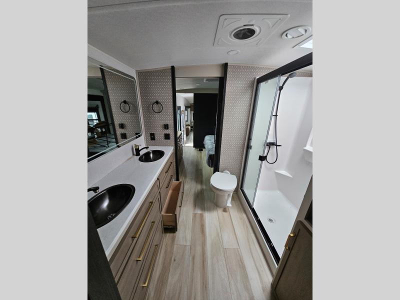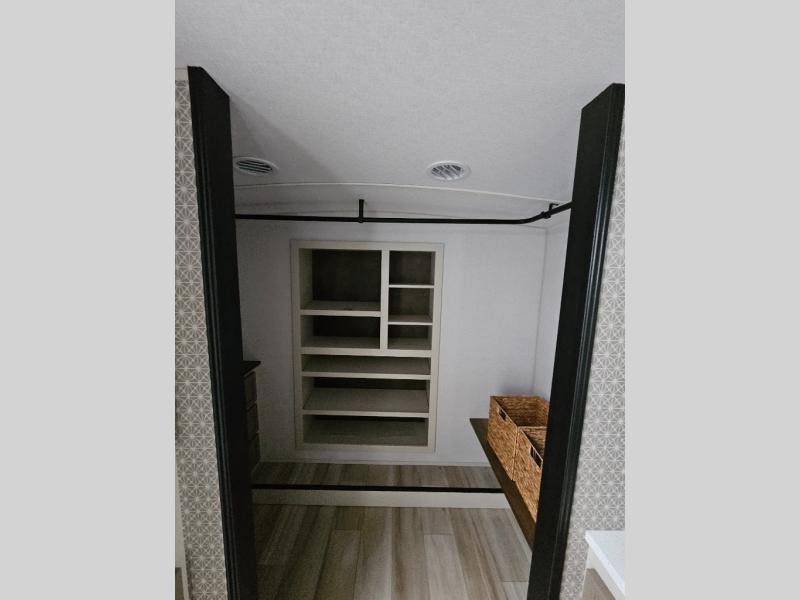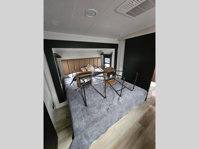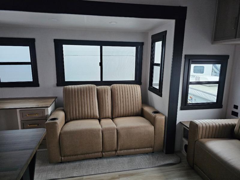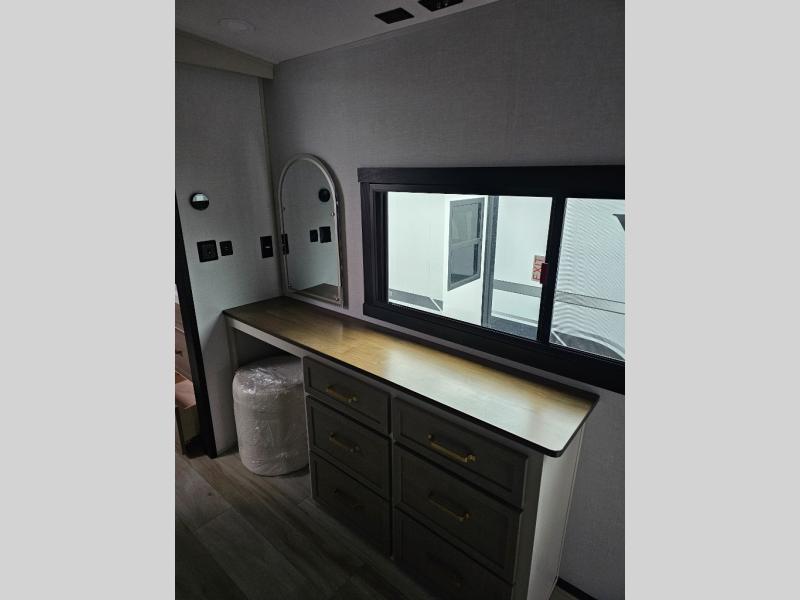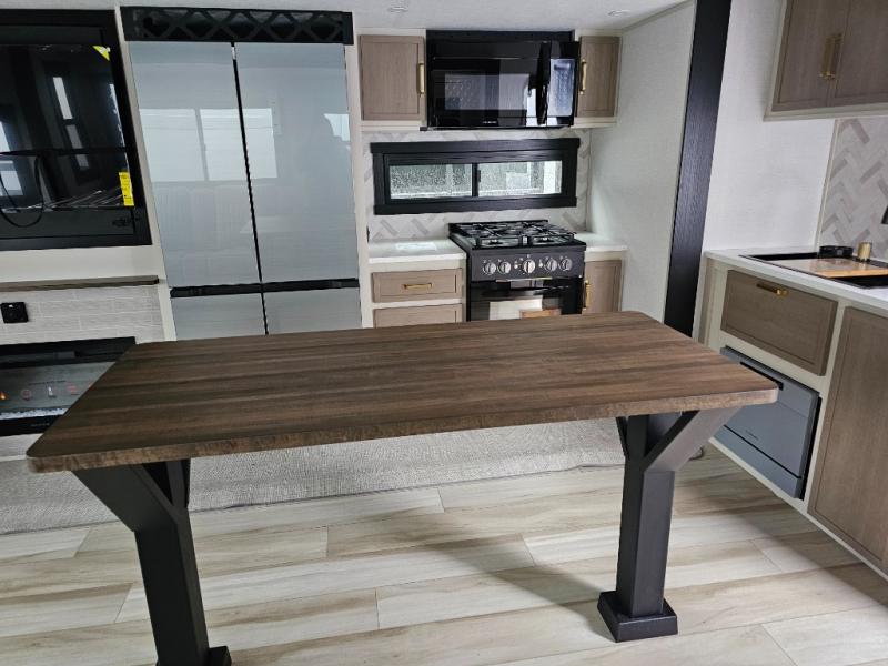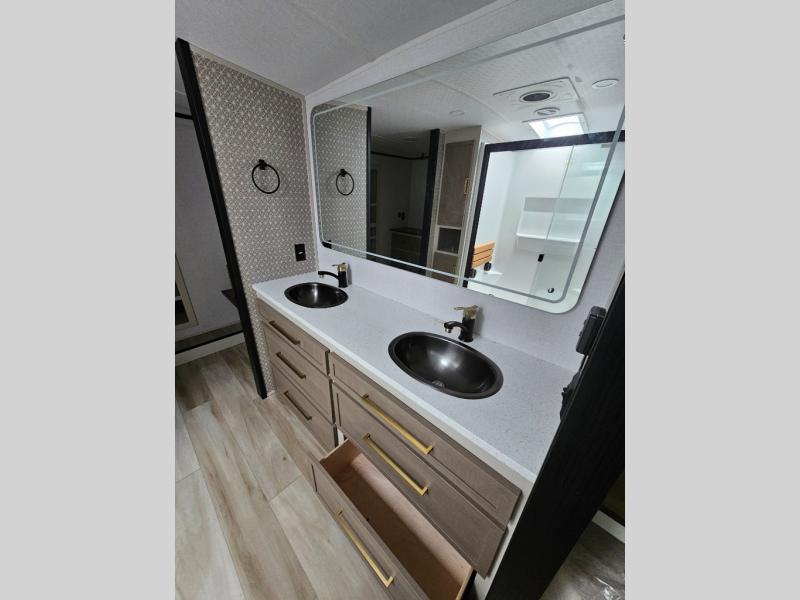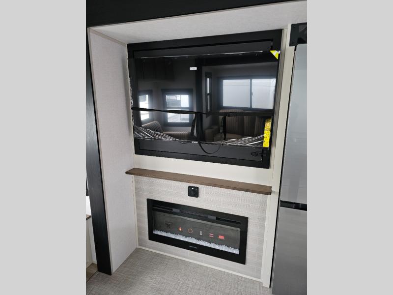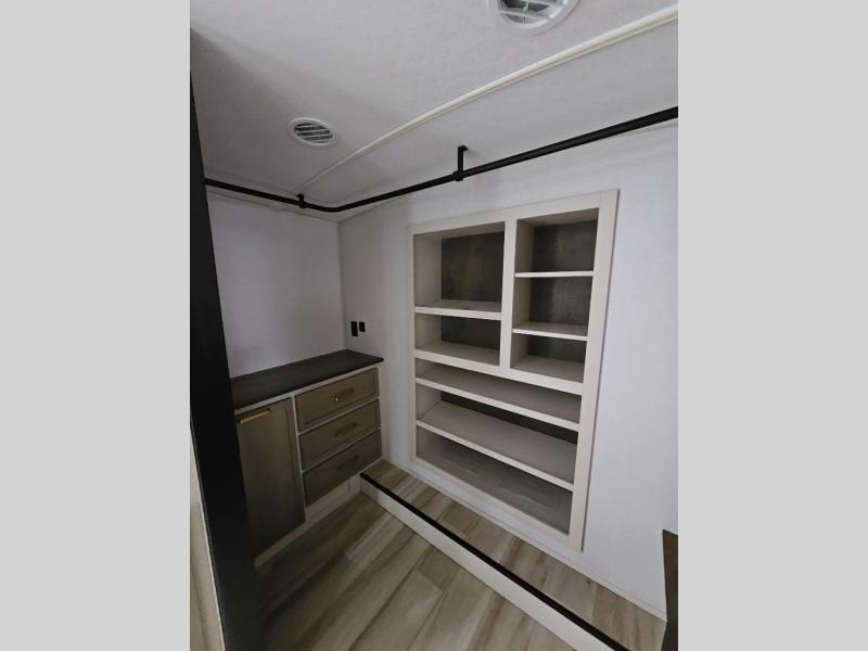 One look at this fifth wheel and you'll be sold! You can wake up each morning in the master bedroom that includes a custom king bed and a dresser with an ottoman. The front full bath has two bath sinks so you both can get ready at once, and you're going to love the walk-in wardrobe with a wrap-around hanging rod. A half bath includes a floating shelf with a hanging rod plus washer/dryer prep, giving you the option to make this a laundry room! The back of this unit is where you can cook meals with full kitchen amenities, dine at the kitchen island with four chairs, and relax on the theater seating and tri-fold sofa. A 50" TV and fireplace is also found here, complete with hidden storage behind for board games, movies, and snacks!