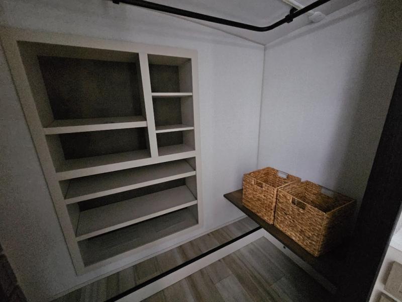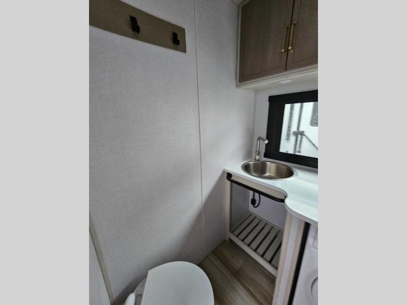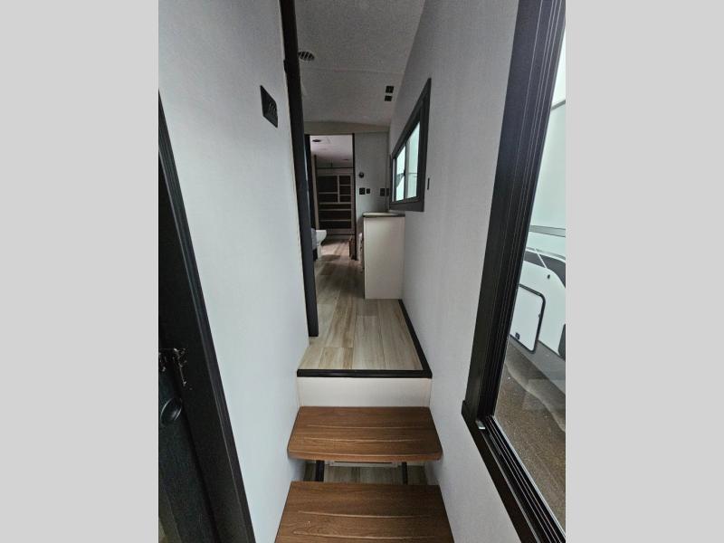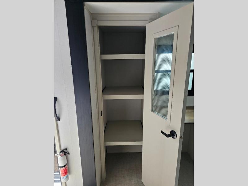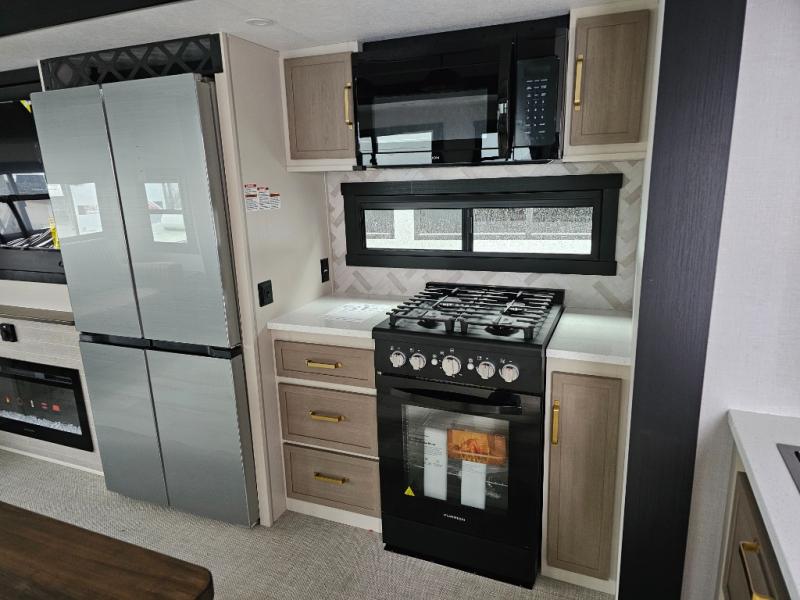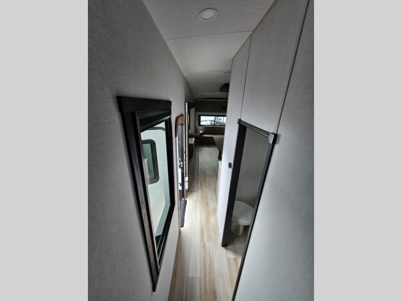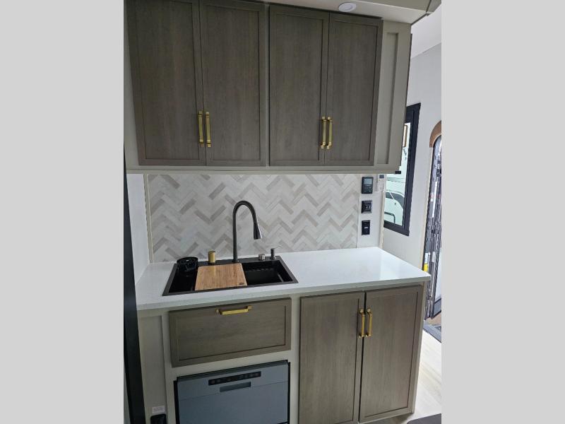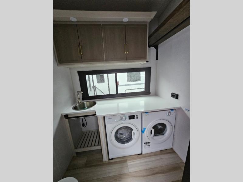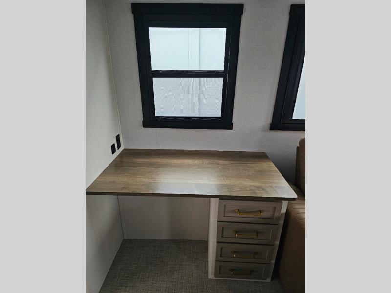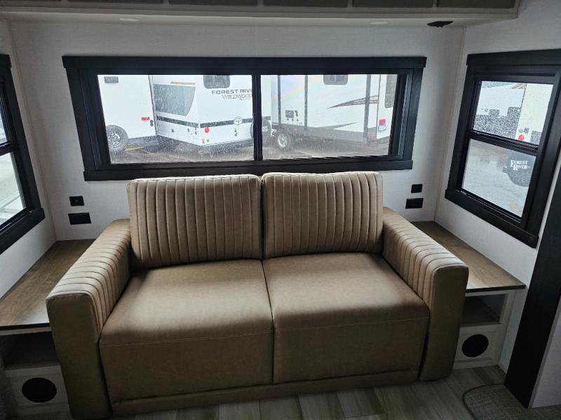 One look at this fifth wheel and you'll be sold! You can wake up each morning in the master bedroom that includes a custom king bed and a dresser with an ottoman. The front full bath has two bath sinks so you both can get ready at once, and you're going to love the walk-in wardrobe with a wrap-around hanging rod. A half bath includes a floating shelf with a hanging rod plus washer/dryer prep, giving you the option to make this a laundry room! The back of this unit is where you can cook meals with full kitchen amenities, dine at the kitchen island with four chairs, and relax on the theater seating and tri-fold sofa. A 50" TV and fireplace is also found here, complete with hidden storage behind for board games, movies, and snacks!