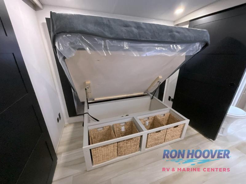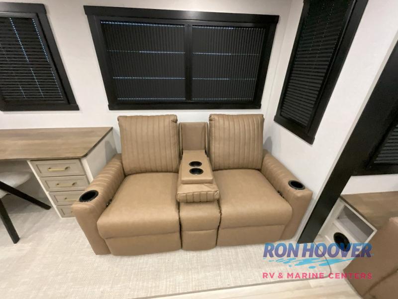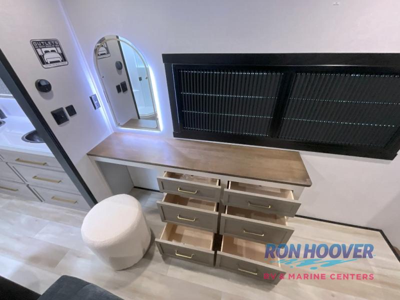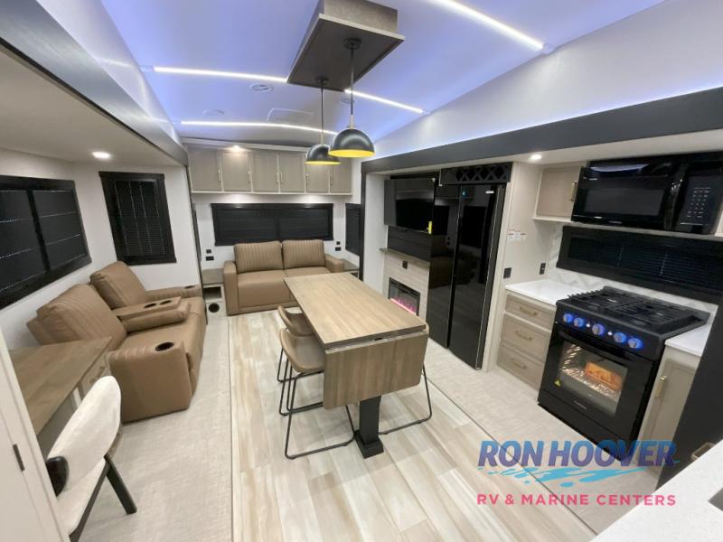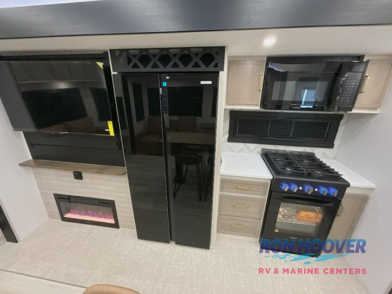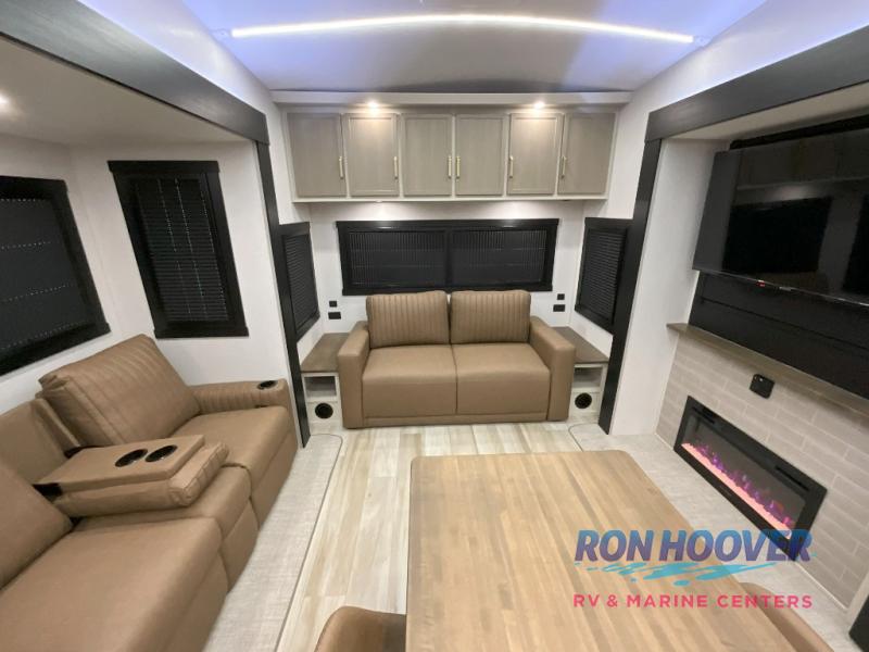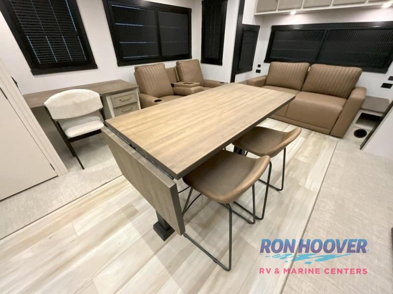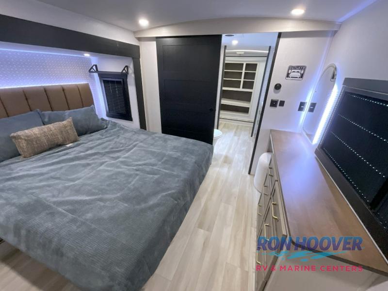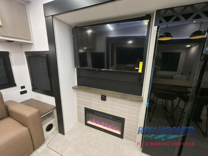 One look at this fifth wheel and you'll be sold! You can wake up each morning in the master bedroom that includes a custom king bed and a dresser with an ottoman. The front full bath has two bath sinks so you both can get ready at once, and you're going to love the walk-in wardrobe with a wrap-around hanging rod. A half bath includes a floating shelf with a hanging rod plus washer/dryer prep, giving you the option to make this a laundry room! The back of this unit is where you can cook meals with full kitchen amenities, dine at the kitchen island with four chairs, and relax on the theater seating and tri-fold sofa. A 50" TV and fireplace is also found here, complete with hidden storage behind for board games, movies, and snacks!