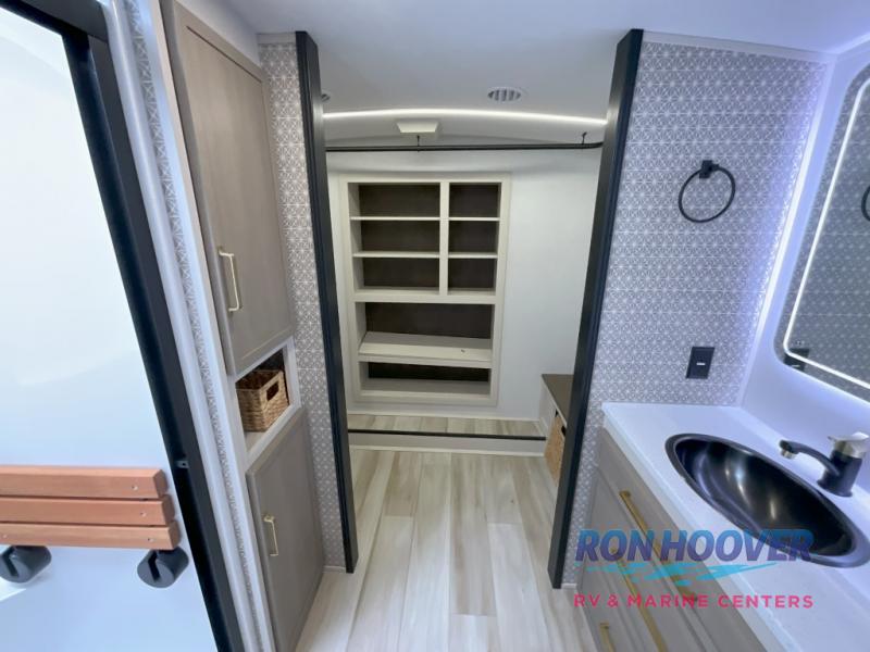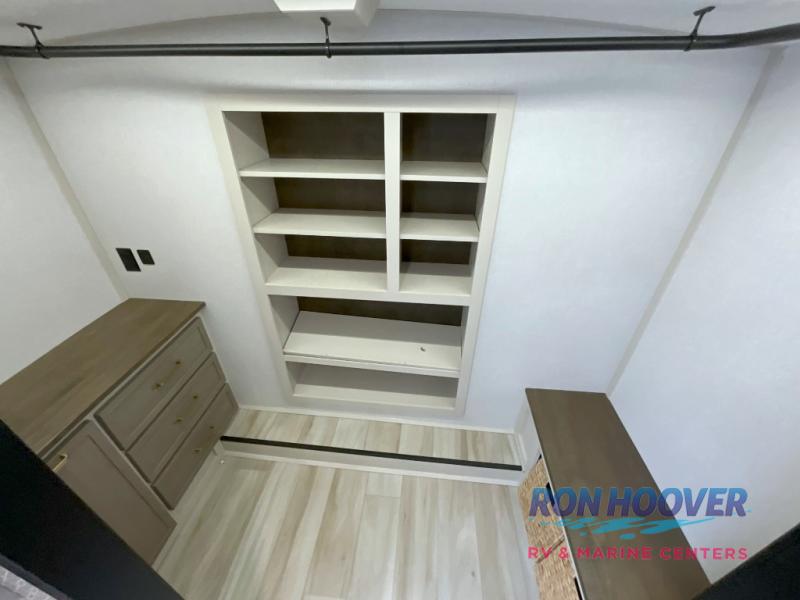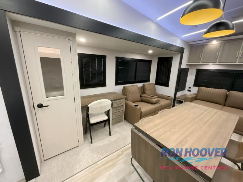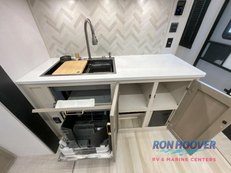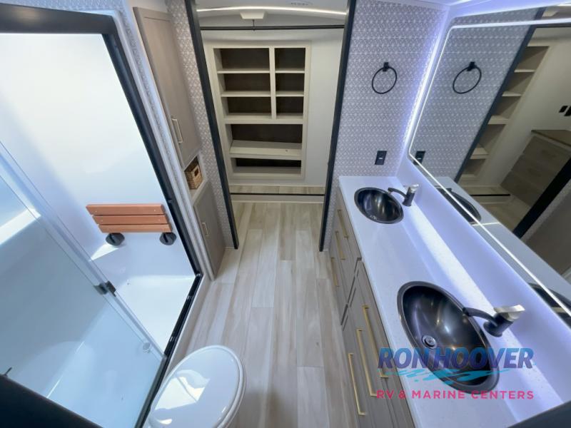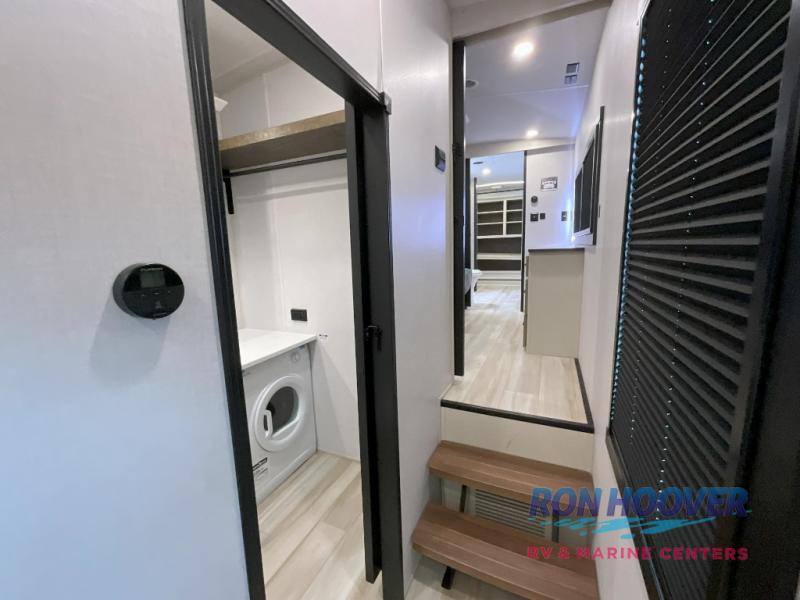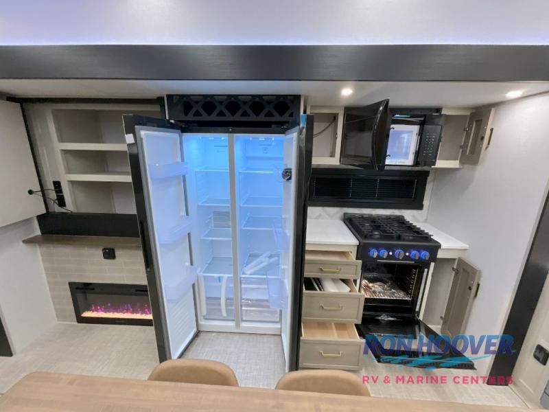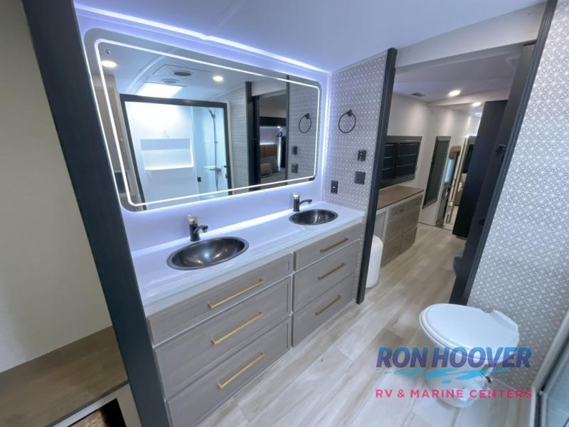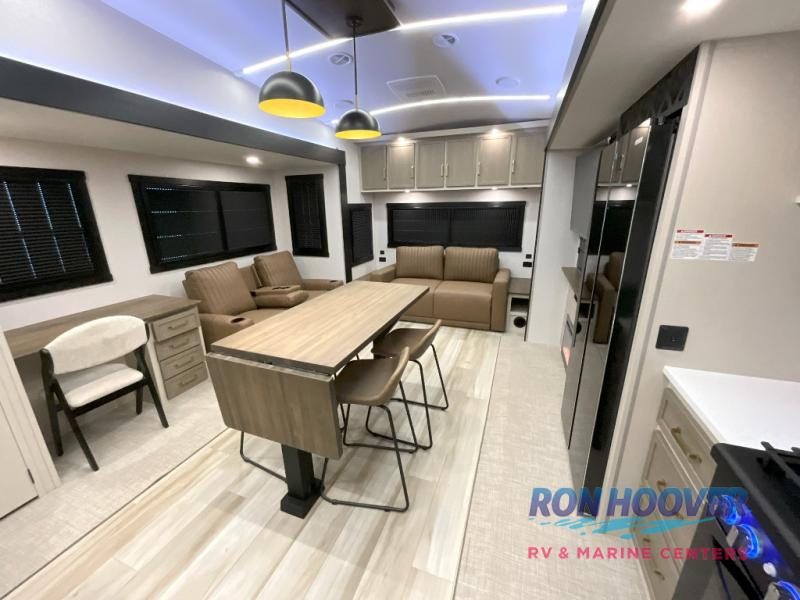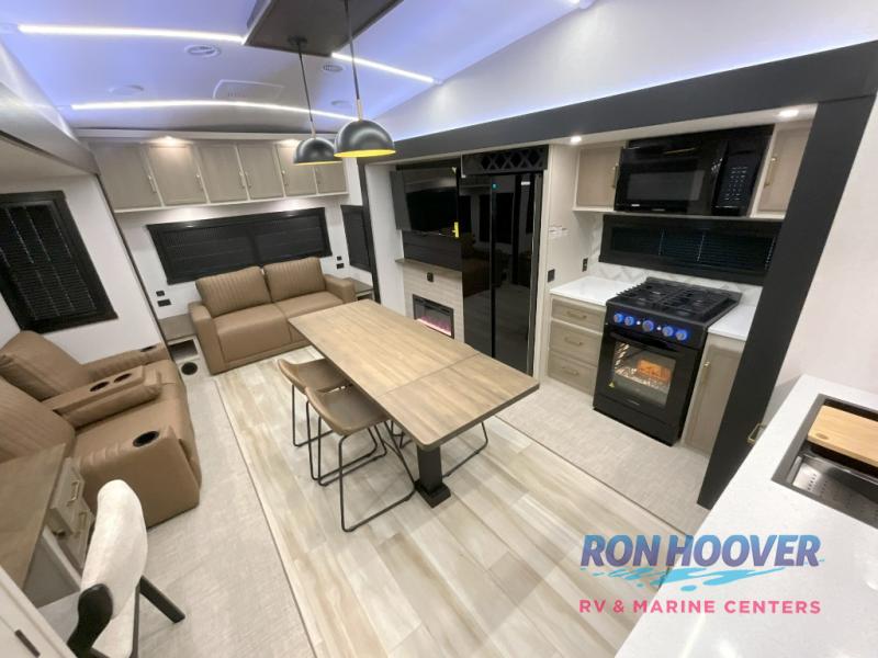One look at this fifth wheel and you'll be sold! You can wake up each morning in the master bedroom that includes a custom king bed and a dresser with an ottoman. The front full bath has two bath sinks so you both can get ready at once, and you're going to love the walk-in wardrobe with a wrap-around hanging rod. A half bath includes a floating shelf with a hanging rod plus washer/dryer prep, giving you the option to make this a laundry room! The back of this unit is where you can cook meals with full kitchen amenities, dine at the kitchen island with four chairs, and relax on the theater seating and tri-fold sofa. A 50" TV and fireplace is also found here, complete with hidden storage behind for board games, movies, and snacks!