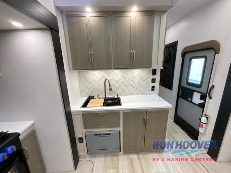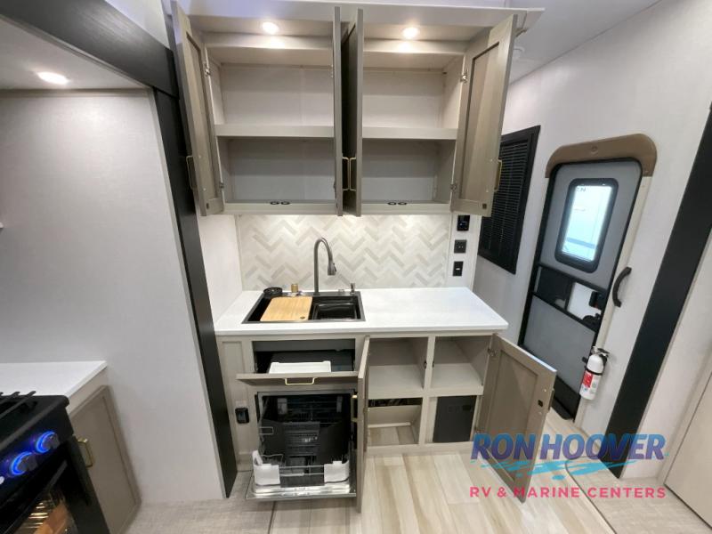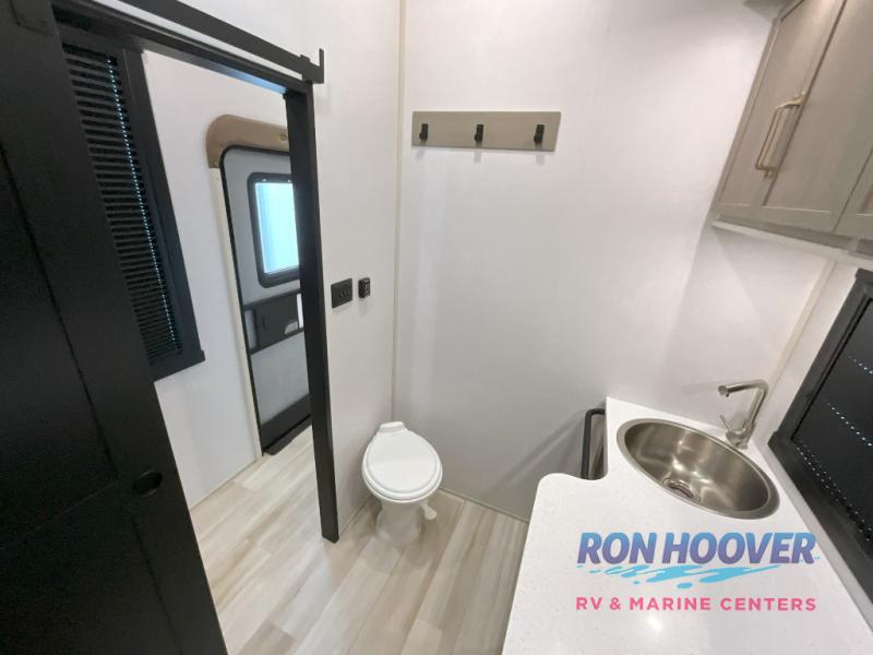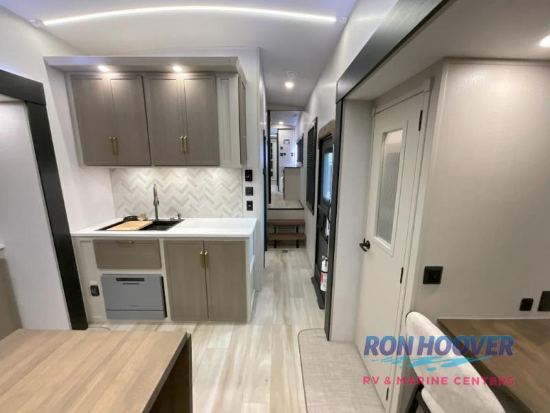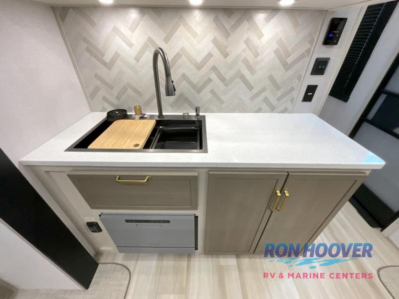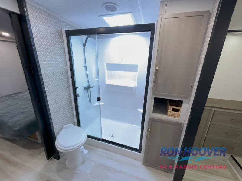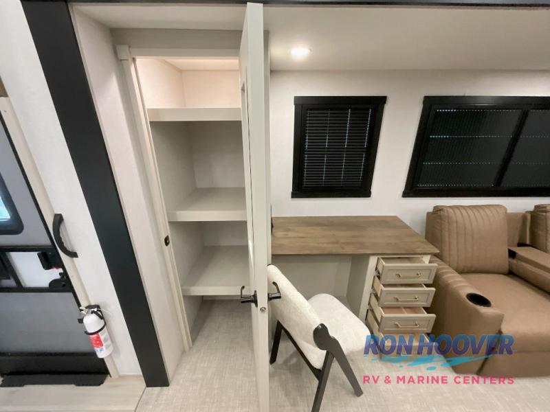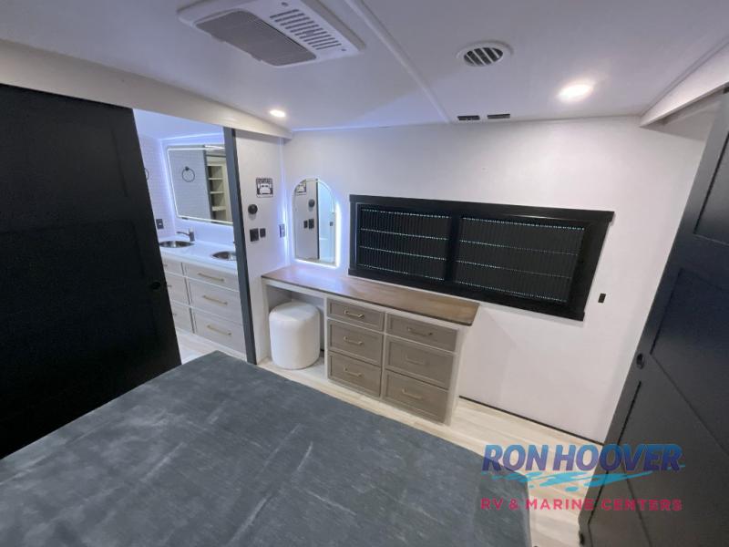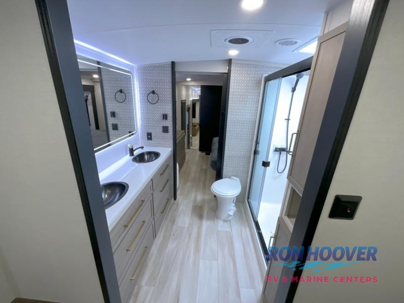 One look at this fifth wheel and you'll be sold! You can wake up each morning in the master bedroom that includes a custom king bed and a dresser with an ottoman. The front full bath has two bath sinks so you both can get ready at once, and you're going to love the walk-in wardrobe with a wrap-around hanging rod. A half bath includes a floating shelf with a hanging rod plus washer/dryer prep, giving you the option to make this a laundry room! The back of this unit is where you can cook meals with full kitchen amenities, dine at the kitchen island with four chairs, and relax on the theater seating and tri-fold sofa. A 50" TV and fireplace is also found here, complete with hidden storage behind for board games, movies, and snacks!