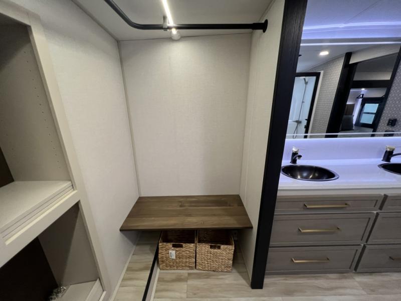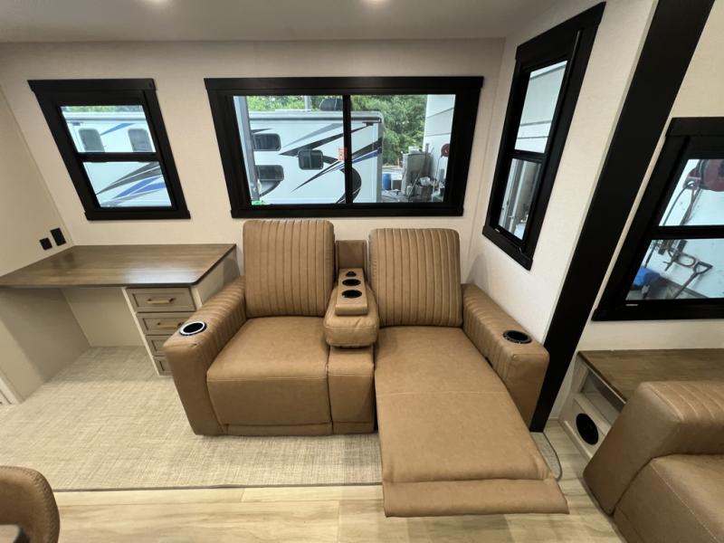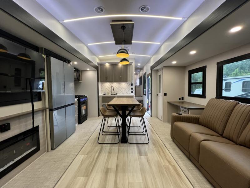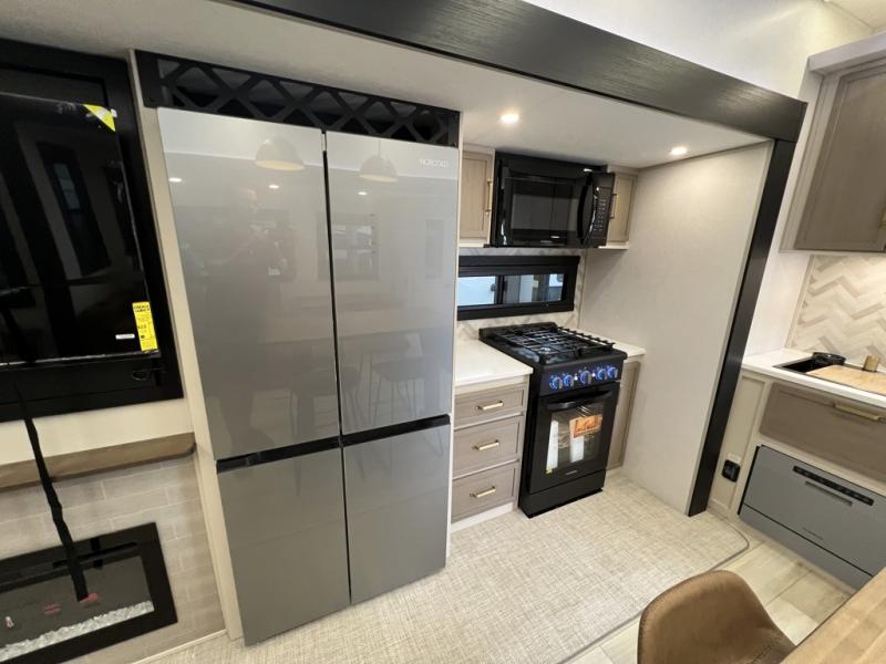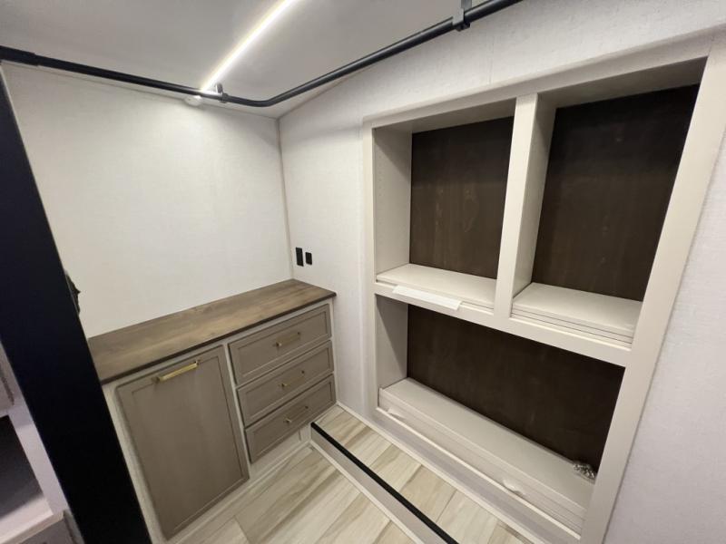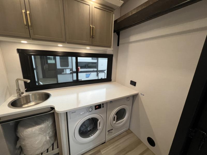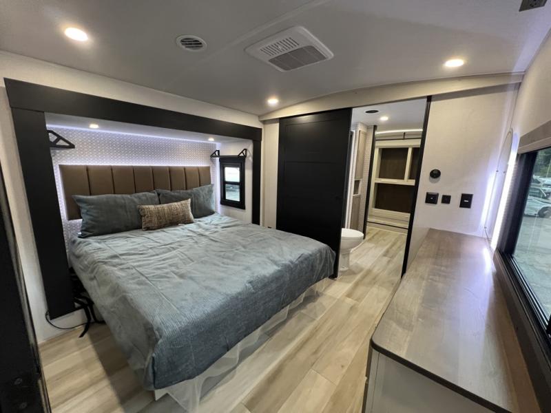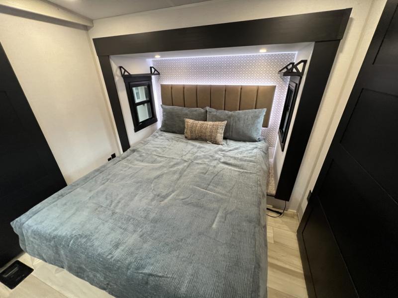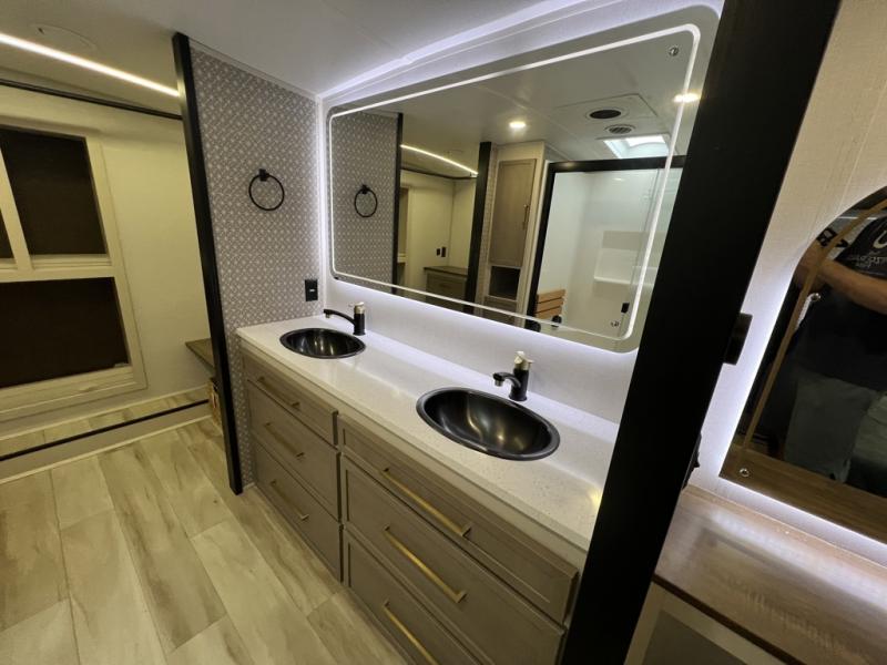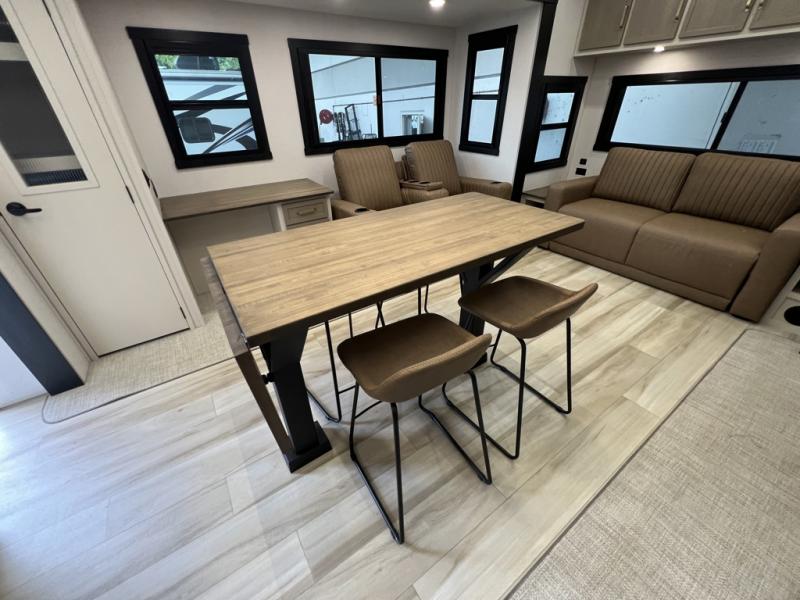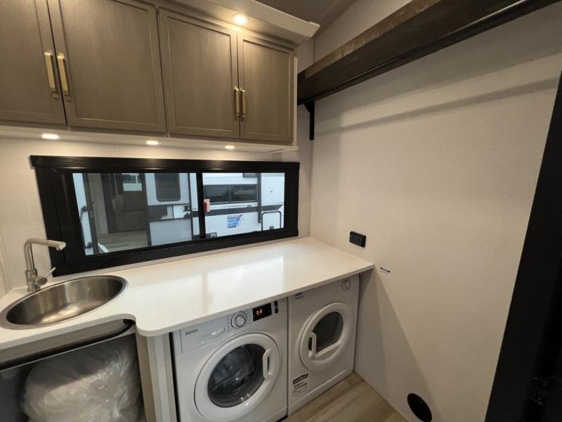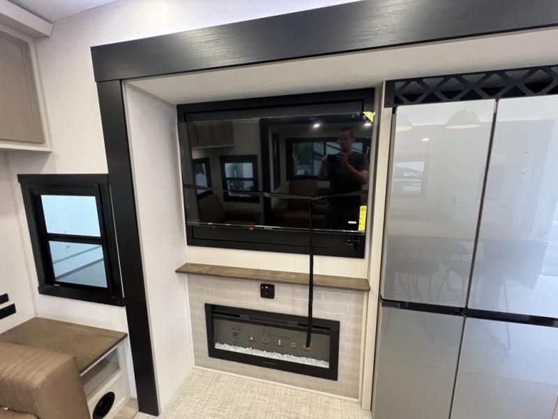 One look at this fifth wheel and you'll be sold! You can wake up each morning in the master bedroom that includes a custom king bed and a dresser with an ottoman. The front full bath has two bath sinks so you both can get ready at once, and you're going to love the walk-in wardrobe with a wrap-around hanging rod. A half bath includes a floating shelf with a hanging rod plus washer/dryer prep, giving you the option to make this a laundry room! The back of this unit is where you can cook meals with full kitchen amenities, dine at the kitchen island with four chairs, and relax on the theater seating and tri-fold sofa. A 50" TV and fireplace is also found here, complete with hidden storage behind for board games, movies, and snacks!