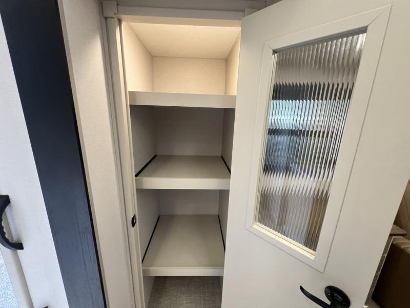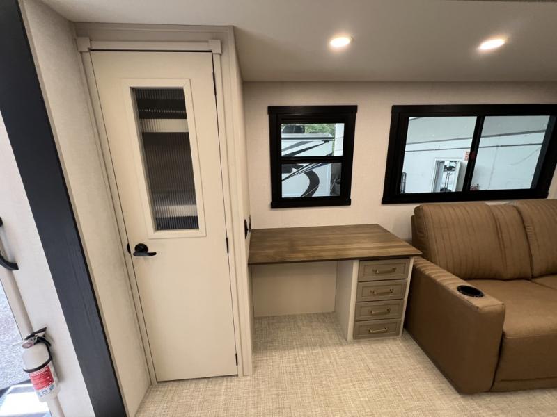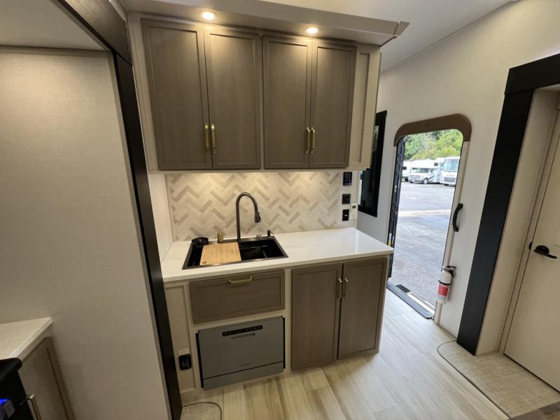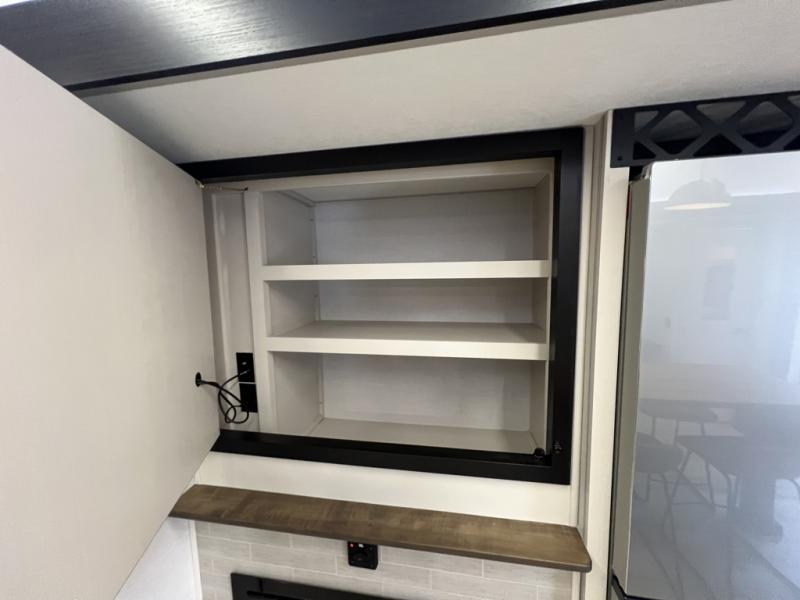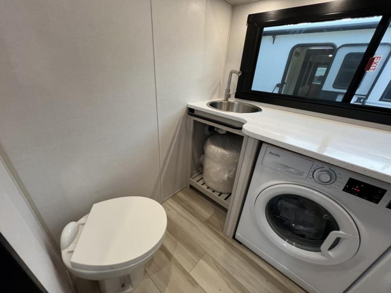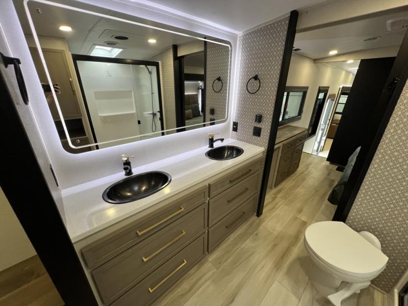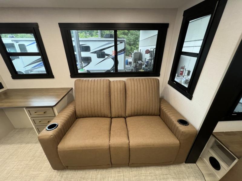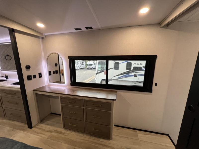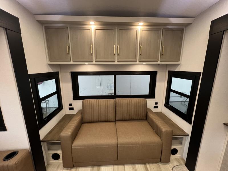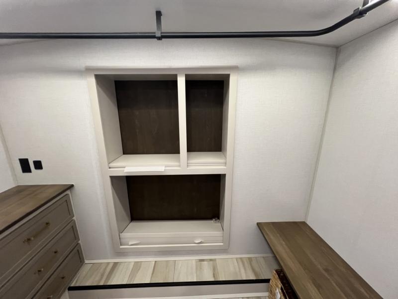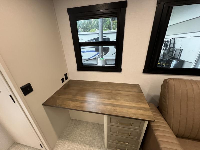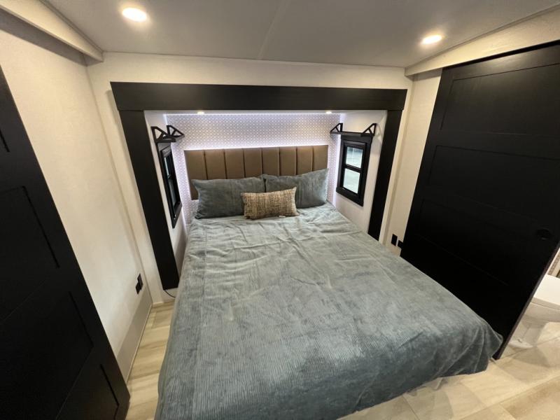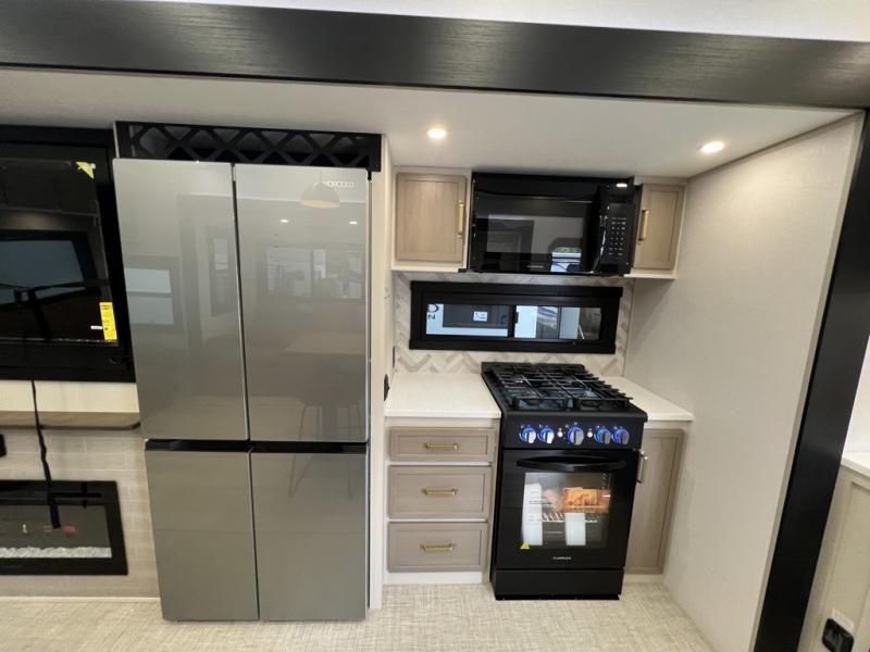 One look at this fifth wheel and you'll be sold! You can wake up each morning in the master bedroom that includes a custom king bed and a dresser with an ottoman. The front full bath has two bath sinks so you both can get ready at once, and you're going to love the walk-in wardrobe with a wrap-around hanging rod. A half bath includes a floating shelf with a hanging rod plus washer/dryer prep, giving you the option to make this a laundry room! The back of this unit is where you can cook meals with full kitchen amenities, dine at the kitchen island with four chairs, and relax on the theater seating and tri-fold sofa. A 50" TV and fireplace is also found here, complete with hidden storage behind for board games, movies, and snacks!