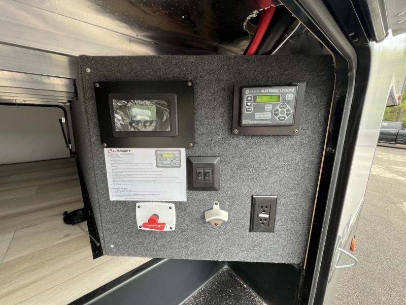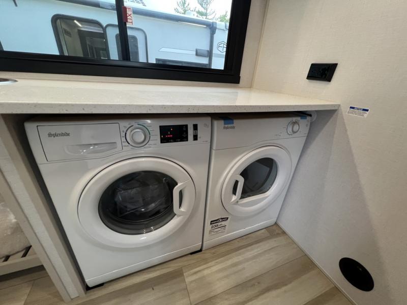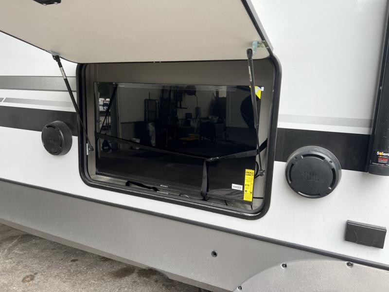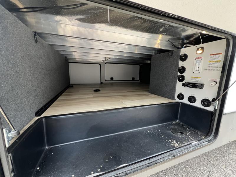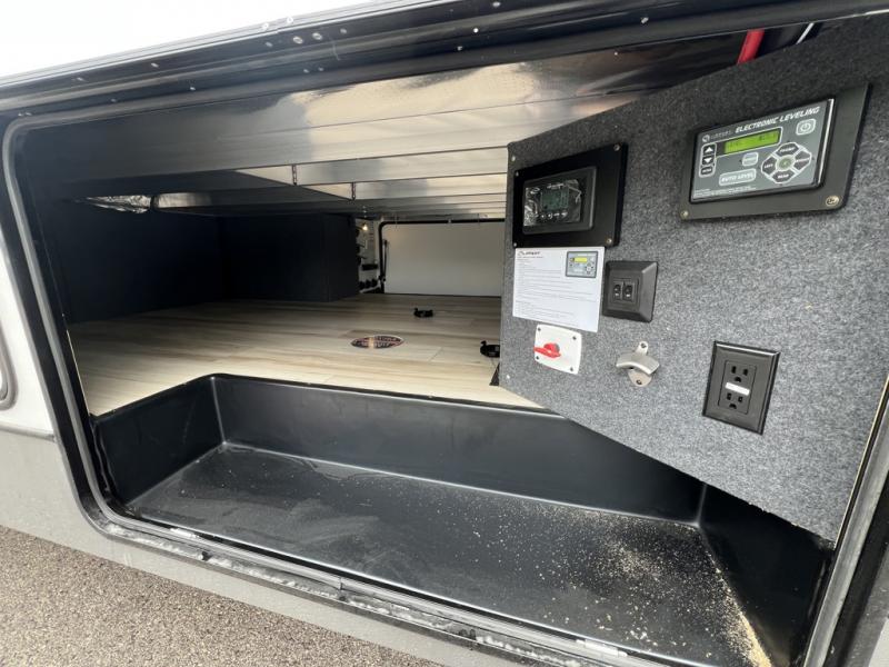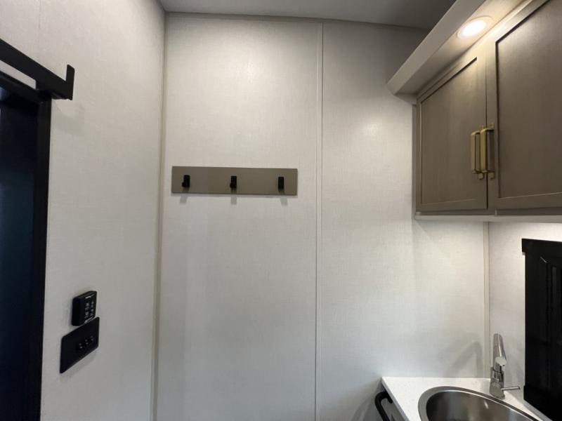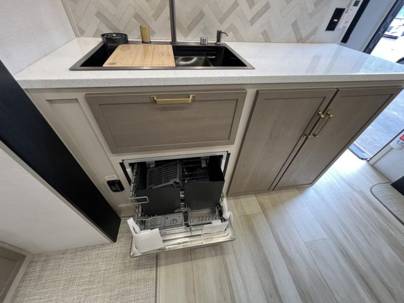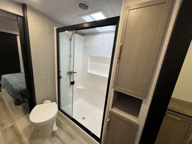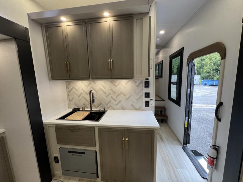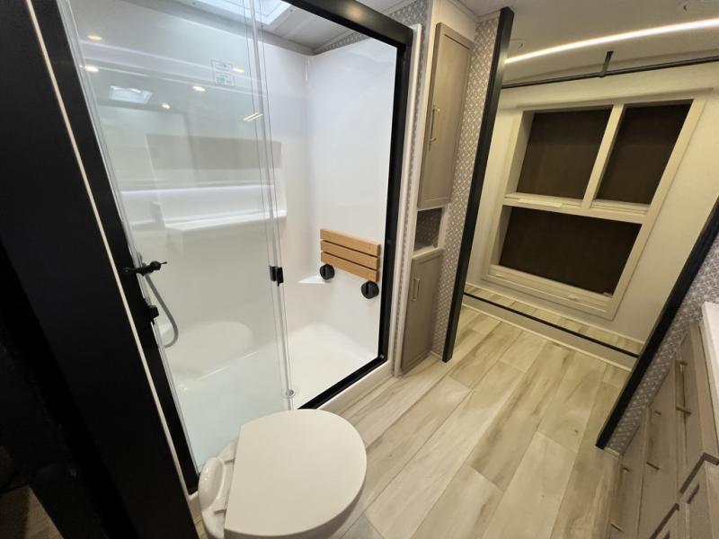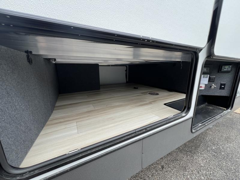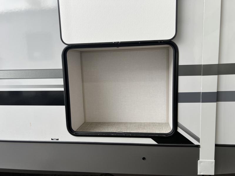 One look at this fifth wheel and you'll be sold! You can wake up each morning in the master bedroom that includes a custom king bed and a dresser with an ottoman. The front full bath has two bath sinks so you both can get ready at once, and you're going to love the walk-in wardrobe with a wrap-around hanging rod. A half bath includes a floating shelf with a hanging rod plus washer/dryer prep, giving you the option to make this a laundry room! The back of this unit is where you can cook meals with full kitchen amenities, dine at the kitchen island with four chairs, and relax on the theater seating and tri-fold sofa. A 50" TV and fireplace is also found here, complete with hidden storage behind for board games, movies, and snacks!