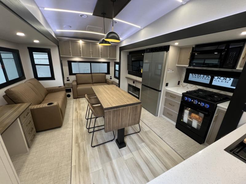 With any Wildwood Heritage Glen fifth wheel by Forest River, the quality construction, attention to detail and design along with a bright and welcoming interior allows you to relax in comfort. You'll love the high-end solid surface countertops included in the Elevated Value Package, along with a JBL sound system, full-length barreled ceilings, and an ultimate interior lighting upgrade. The included Expedition Package features an Accesibelly underbelly panel with 12V tank heaters, nitrogen-filled tires with aluminum rims, and a spacious 30" wide main entry door with a window. The Lippert On-The-Go ladder prep and back-up camera prep let you customize your fifth wheel even more, and the LED awning, front cap, marker and taillights will make it easier than ever to set up camp!