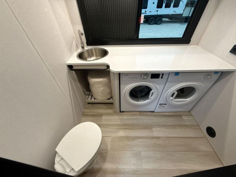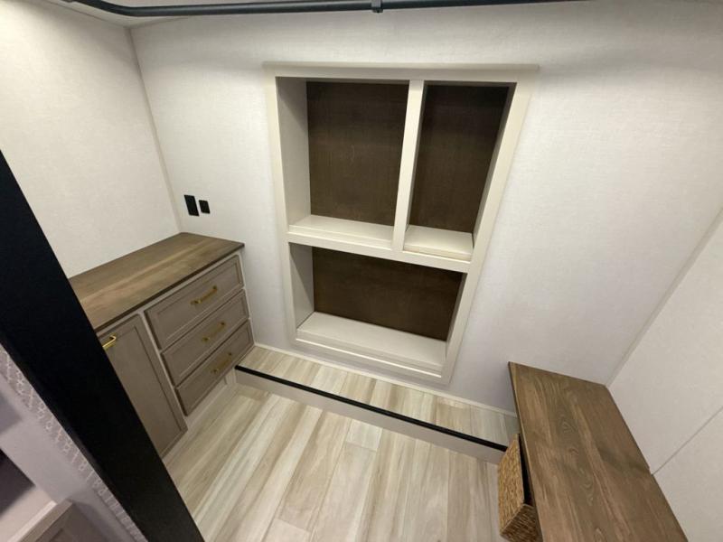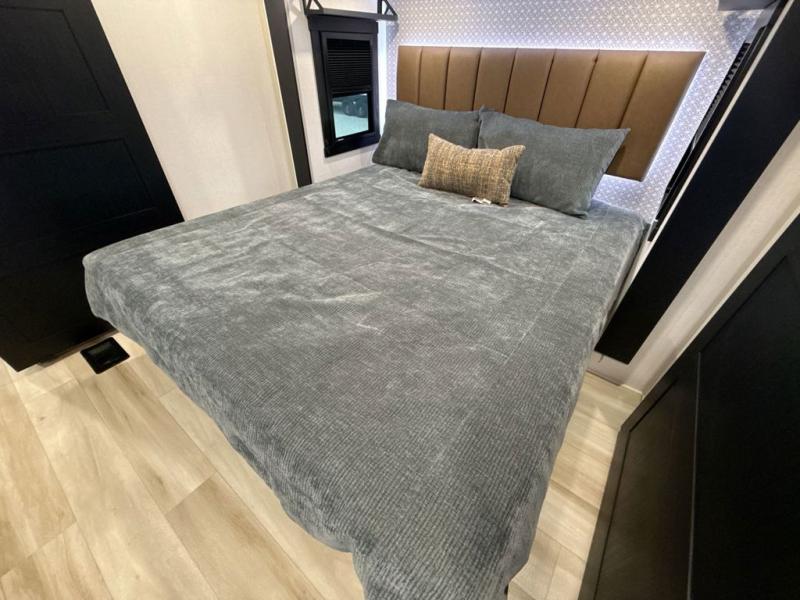 One look at this fifth wheel and you'll be sold! You can wake up each morning in the master bedroom that includes a custom king bed and a dresser with an ottoman. The front full bath has two bath sinks so you both can get ready at once, and you're going to love the walk-in wardrobe with a wrap-around hanging rod. A half bath includes a floating shelf with a hanging rod plus washer/dryer prep, giving you the option to make this a laundry room! The back of this unit is where you can cook meals with full kitchen amenities, dine at the kitchen island with four chairs, and relax on the theater seating and tri-fold sofa. A 50" TV and fireplace is also found here, complete with hidden storage behind for board games, movies, and snacks!