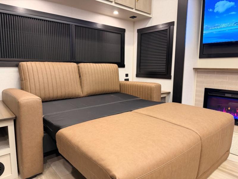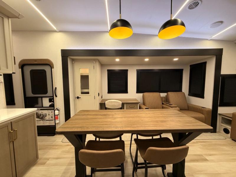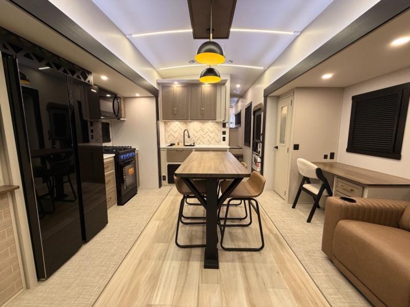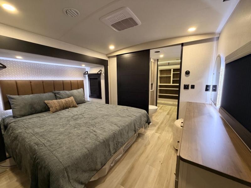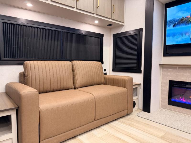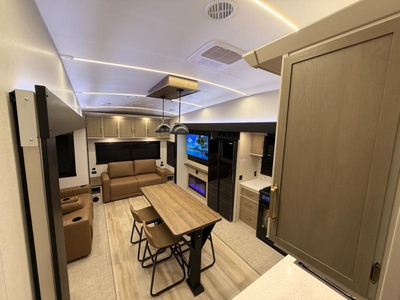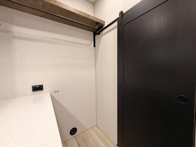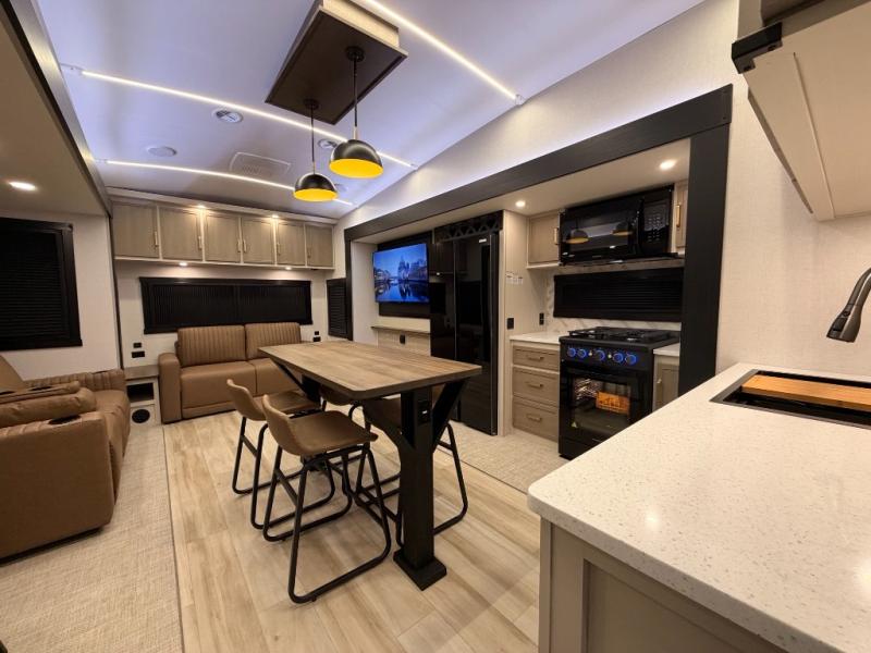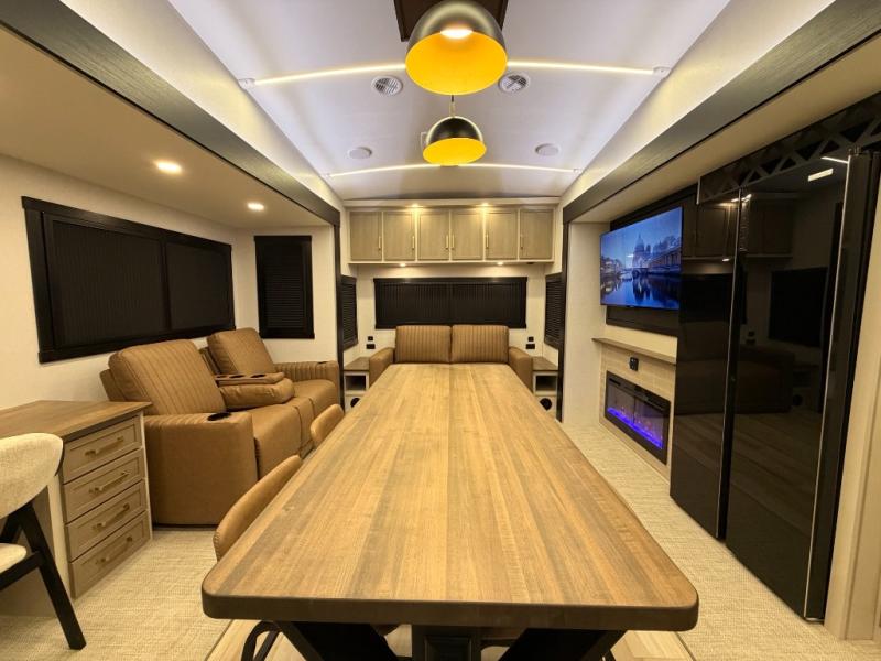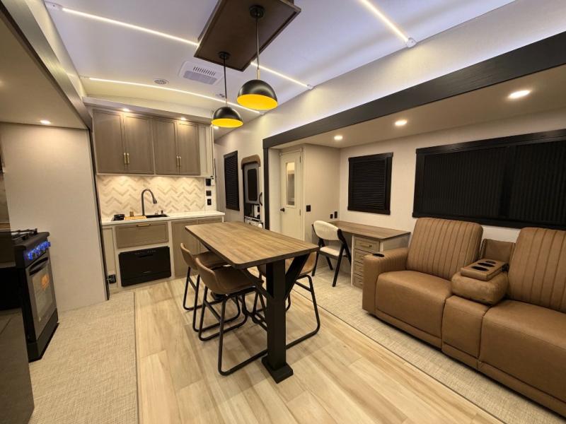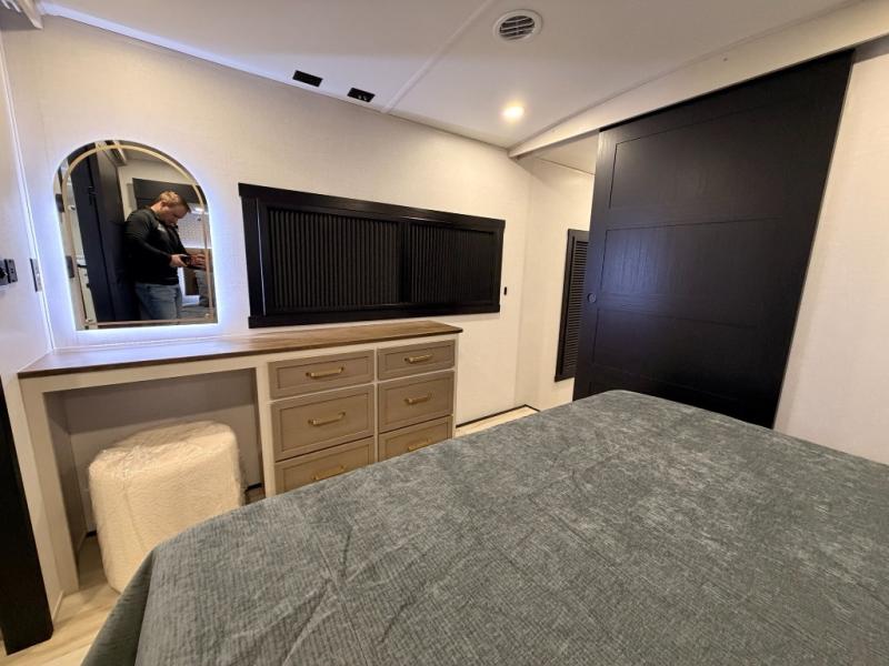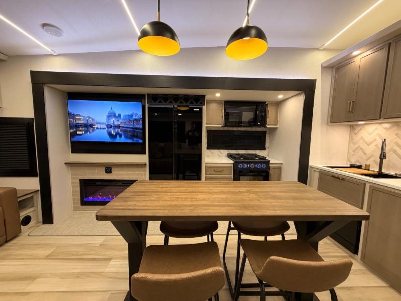 One look at this fifth wheel and you'll be sold! You can wake up each morning in the master bedroom that includes a custom king bed and a dresser with an ottoman. The front full bath has two bath sinks so you both can get ready at once, and you're going to love the walk-in wardrobe with a wrap-around hanging rod. A half bath includes a floating shelf with a hanging rod plus washer/dryer prep, giving you the option to make this a laundry room! The back of this unit is where you can cook meals with full kitchen amenities, dine at the kitchen island with four chairs, and relax on the theater seating and tri-fold sofa. A 50" TV and fireplace is also found here, complete with hidden storage behind for board games, movies, and snacks!