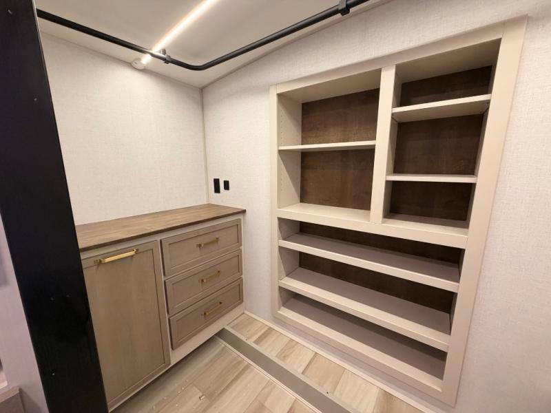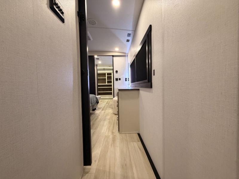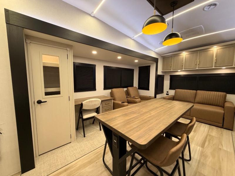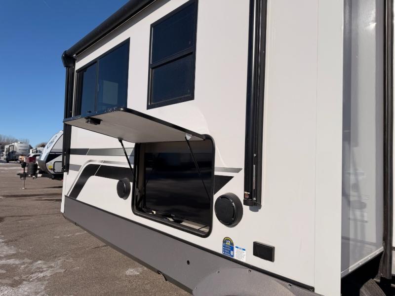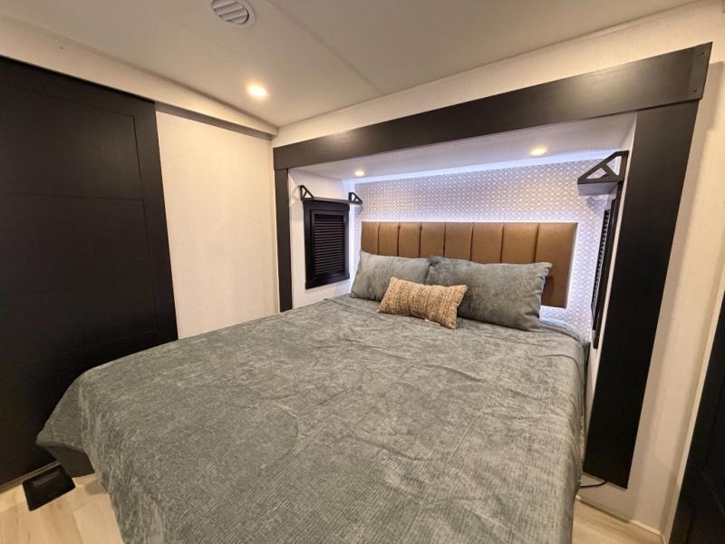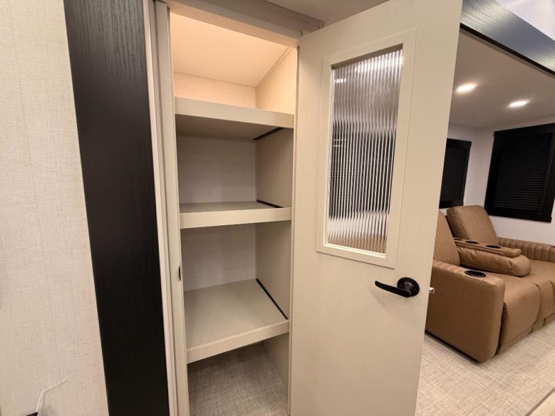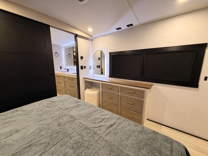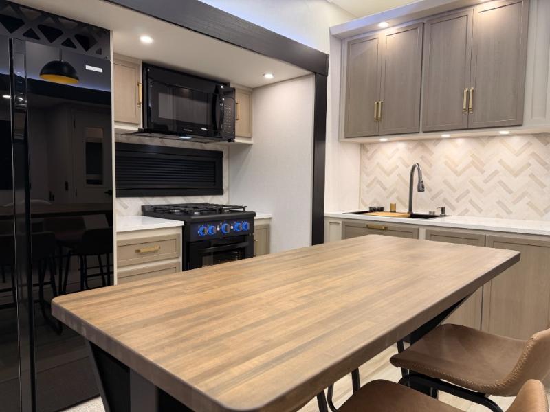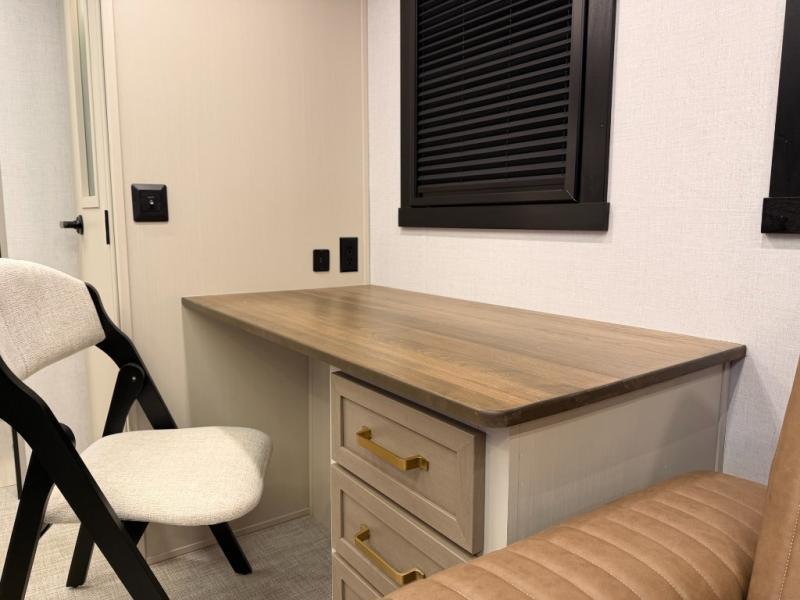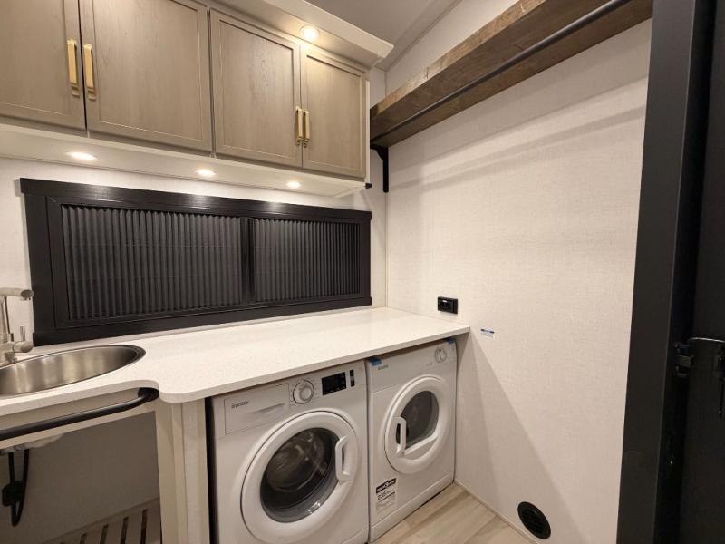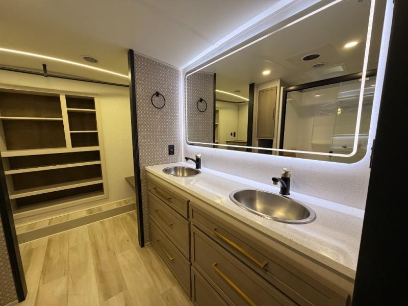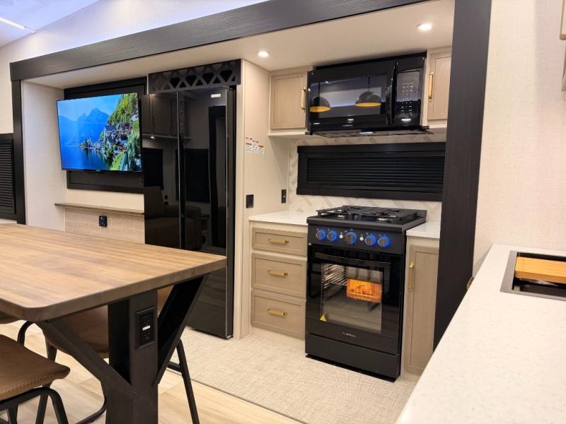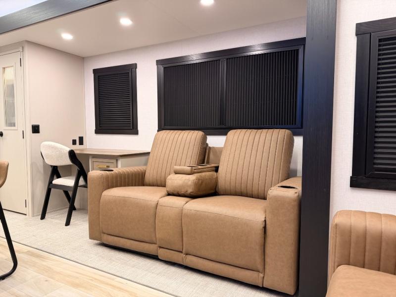One look at this fifth wheel and you'll be sold! You can wake up each morning in the master bedroom that includes a custom king bed and a dresser with an ottoman. The front full bath has two bath sinks so you both can get ready at once, and you're going to love the walk-in wardrobe with a wrap-around hanging rod. A half bath includes a floating shelf with a hanging rod plus washer/dryer prep, giving you the option to make this a laundry room! The back of this unit is where you can cook meals with full kitchen amenities, dine at the kitchen island with four chairs, and relax on the theater seating and tri-fold sofa. A 50" TV and fireplace is also found here, complete with hidden storage behind for board games, movies, and snacks!
