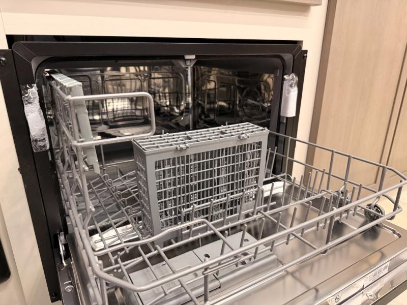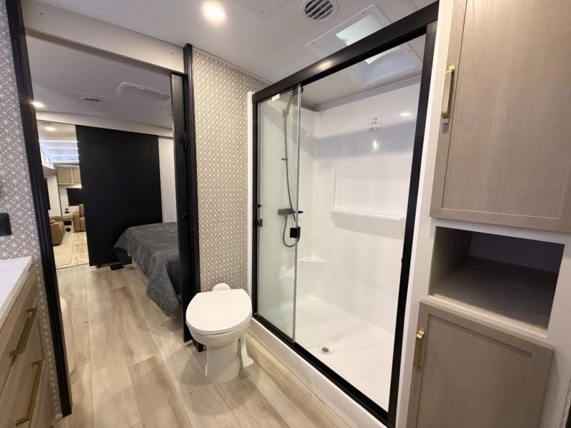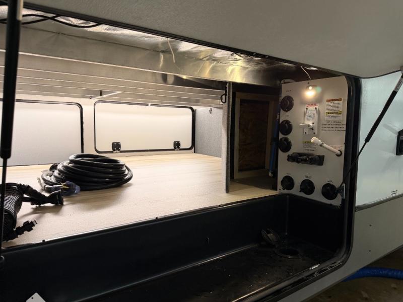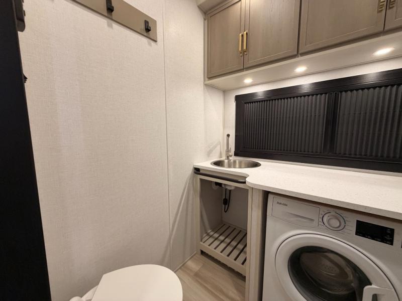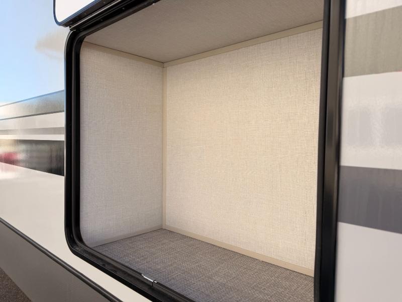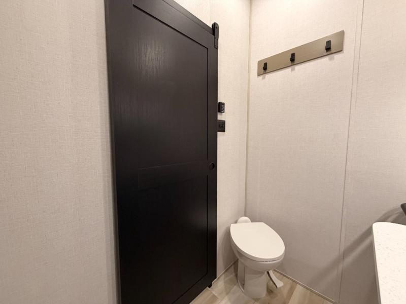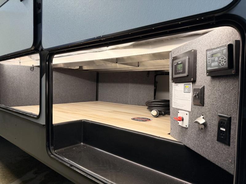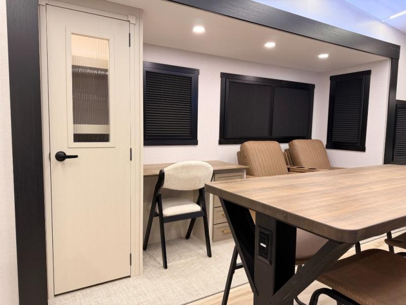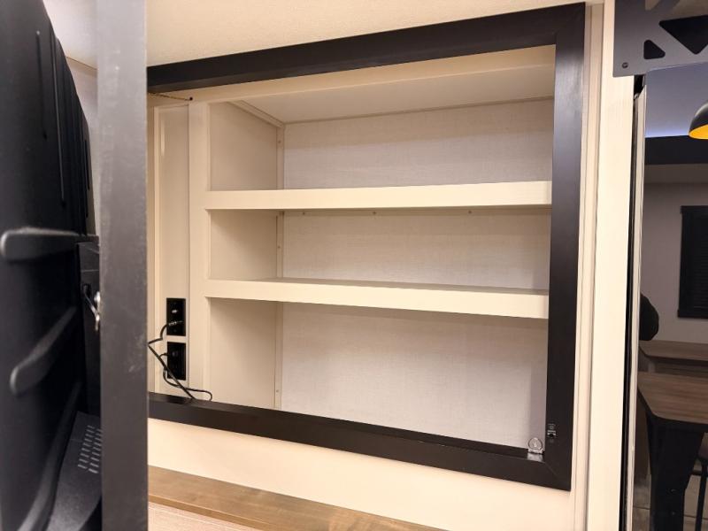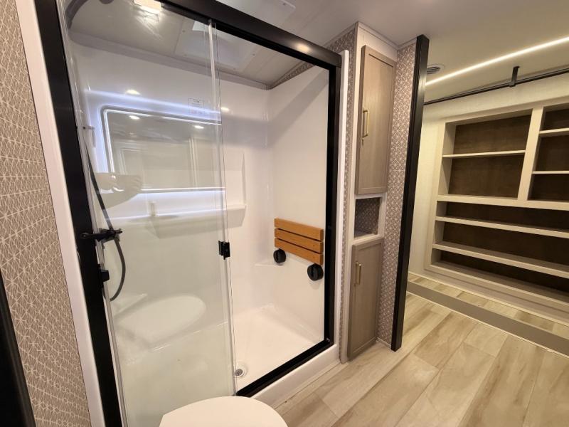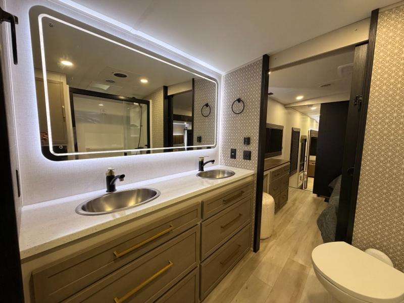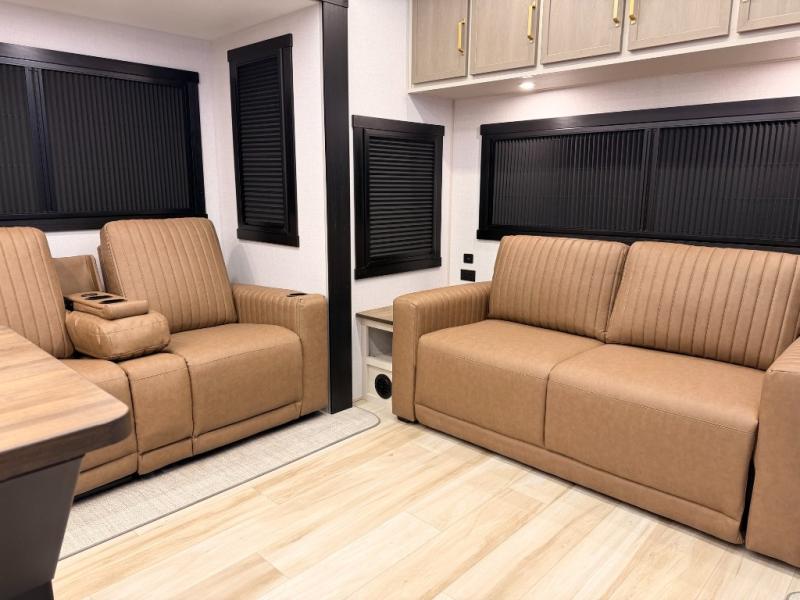 One look at this fifth wheel and you'll be sold! You can wake up each morning in the master bedroom that includes a custom king bed and a dresser with an ottoman. The front full bath has two bath sinks so you both can get ready at once, and you're going to love the walk-in wardrobe with a wrap-around hanging rod. A half bath includes a floating shelf with a hanging rod plus washer/dryer prep, giving you the option to make this a laundry room! The back of this unit is where you can cook meals with full kitchen amenities, dine at the kitchen island with four chairs, and relax on the theater seating and tri-fold sofa. A 50" TV and fireplace is also found here, complete with hidden storage behind for board games, movies, and snacks!