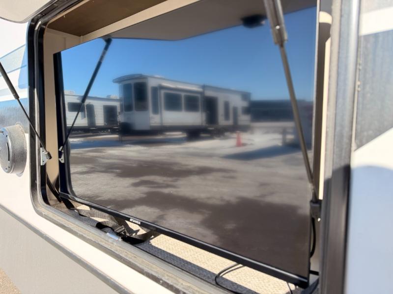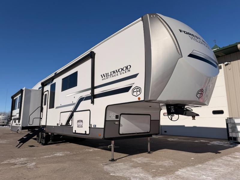 With any Wildwood Heritage Glen fifth wheel by Forest River, the quality construction, attention to detail and design along with a bright and welcoming interior allows you to relax in comfort. You'll love the high-end solid surface countertops included in the Elevated Value Package, along with a JBL sound system, full-length barreled ceilings, and an ultimate interior lighting upgrade. The included Expedition Package features an Accesibelly underbelly panel with 12V tank heaters, nitrogen-filled tires with aluminum rims, and a spacious 30" wide main entry door with a window. The Lippert On-The-Go ladder prep and back-up camera prep let you customize your fifth wheel even more, and the LED awning, front cap, marker and taillights will make it easier than ever to set up camp!