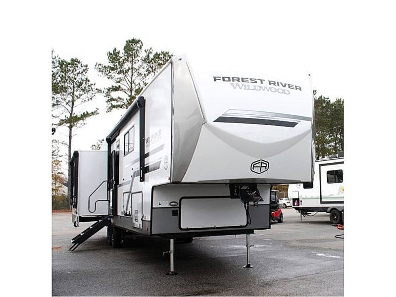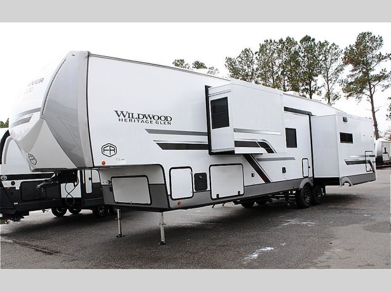 With any Wildwood Heritage Glen fifth wheel by Forest River, the quality construction, attention to detail and design along with a bright and welcoming interior allows you to relax in comfort. You'll love the high-end solid surface countertops included in the Elevated Value Package, along with a JBL sound system, full-length barreled ceilings, and an ultimate interior lighting upgrade. The included Expedition Package features an Accesibelly underbelly panel with 12V tank heaters, nitrogen-filled tires with aluminum rims, and a spacious 30" wide main entry door with a window. The Lippert On-The-Go ladder prep and back-up camera prep let you customize your fifth wheel even more, and the LED awning, front cap, marker and taillights will make it easier than ever to set up camp!