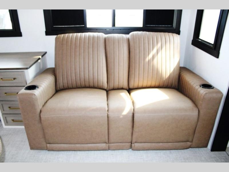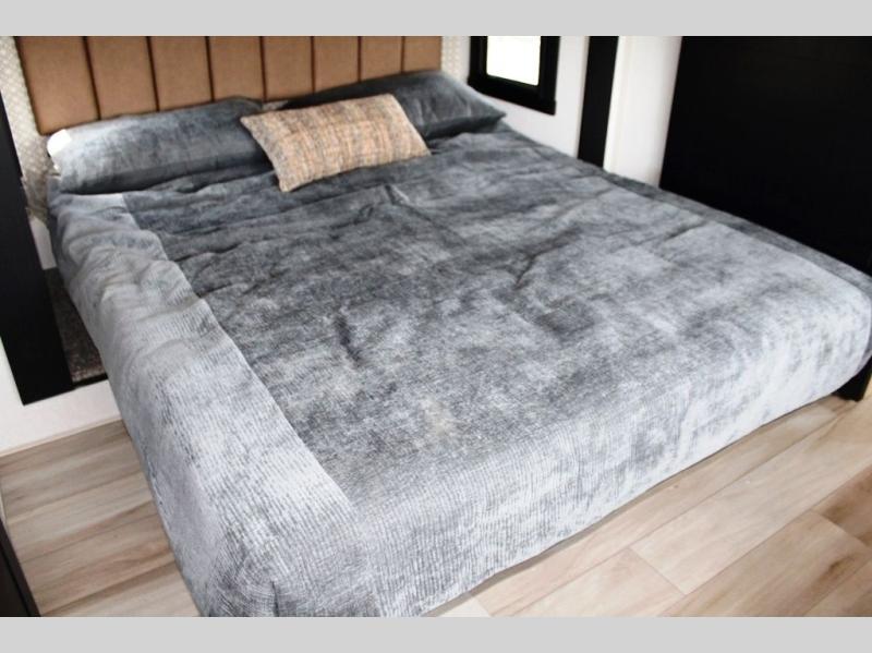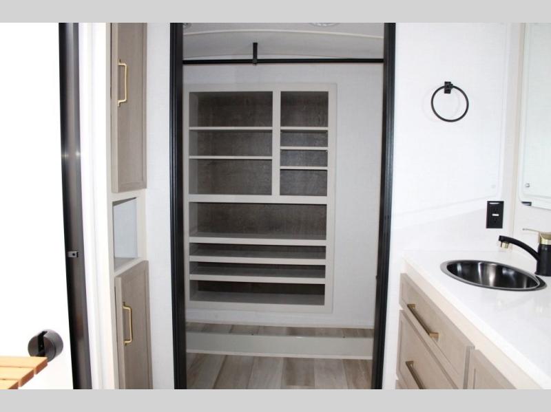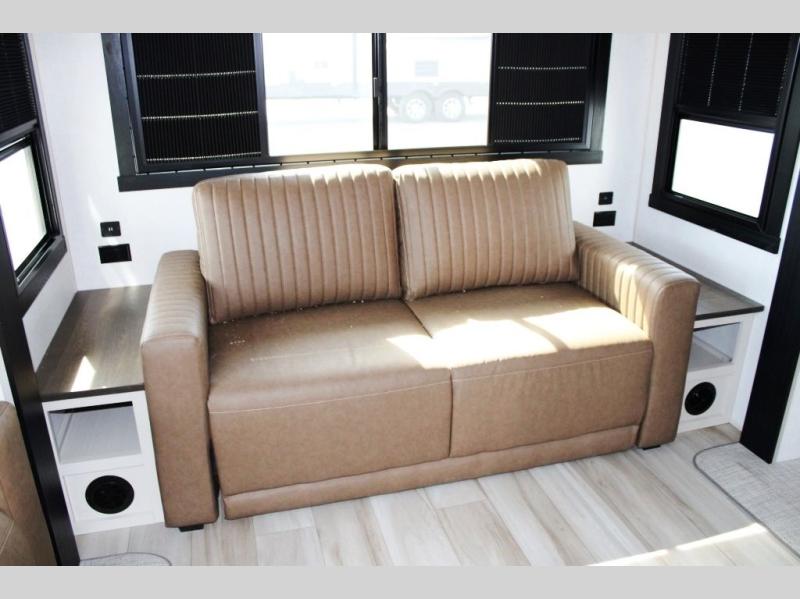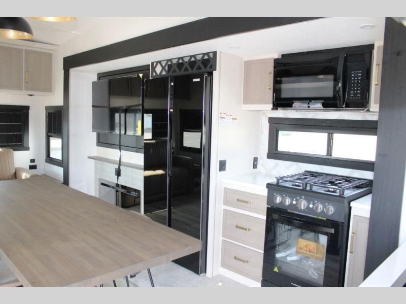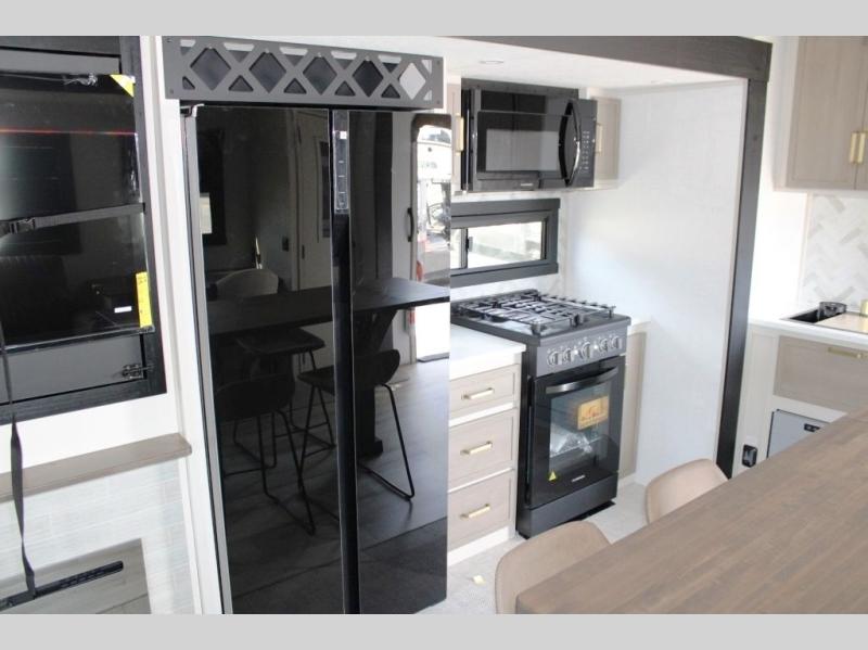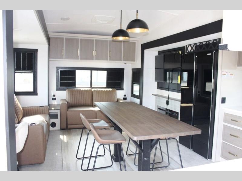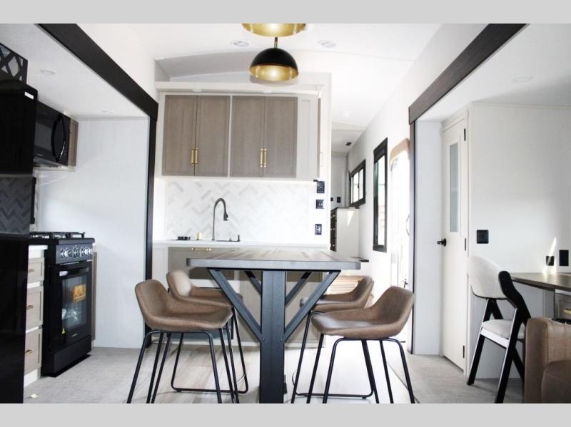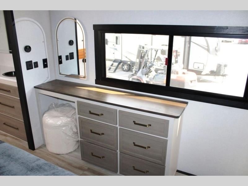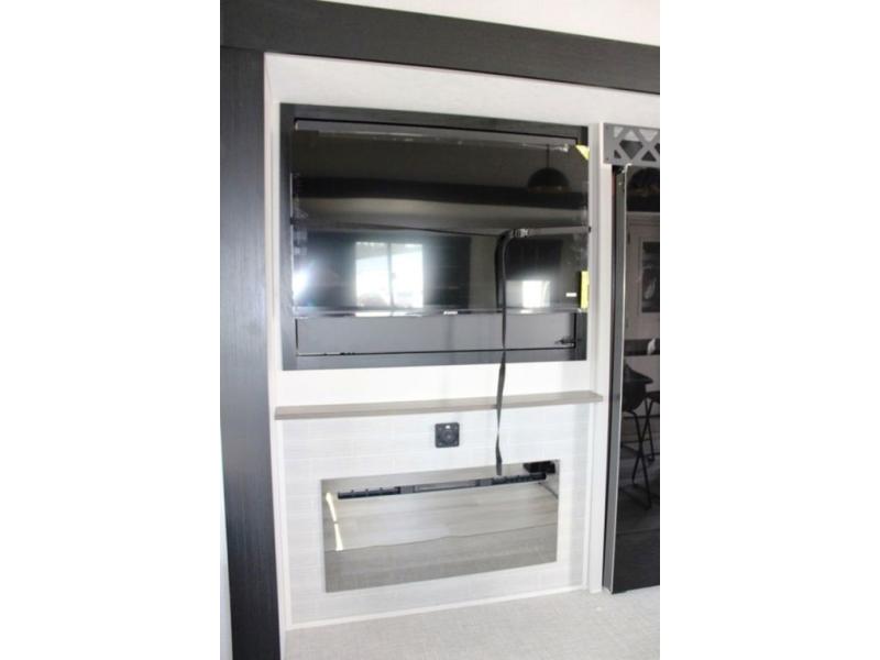 One look at this fifth wheel and you'll be sold! You can wake up each morning in the master bedroom that includes a custom king bed and a dresser with an ottoman. The front full bath has two bath sinks so you both can get ready at once, and you're going to love the walk-in wardrobe with a wrap-around hanging rod. A half bath includes a floating shelf with a hanging rod plus washer/dryer prep, giving you the option to make this a laundry room! The back of this unit is where you can cook meals with full kitchen amenities, dine at the kitchen island with four chairs, and relax on the theater seating and tri-fold sofa. A 50" TV and fireplace is also found here, complete with hidden storage behind for board games, movies, and snacks!