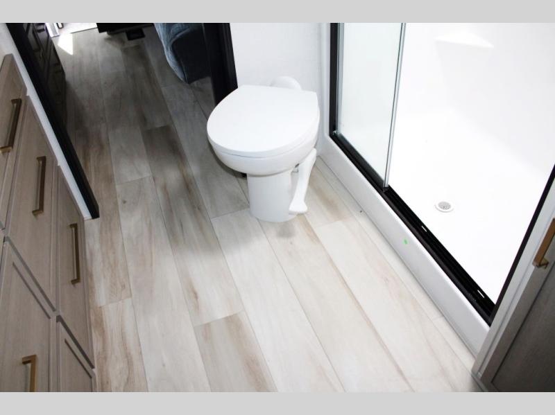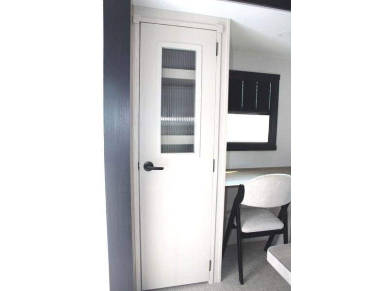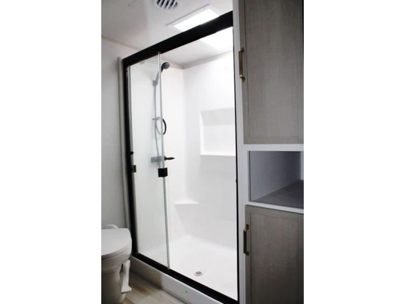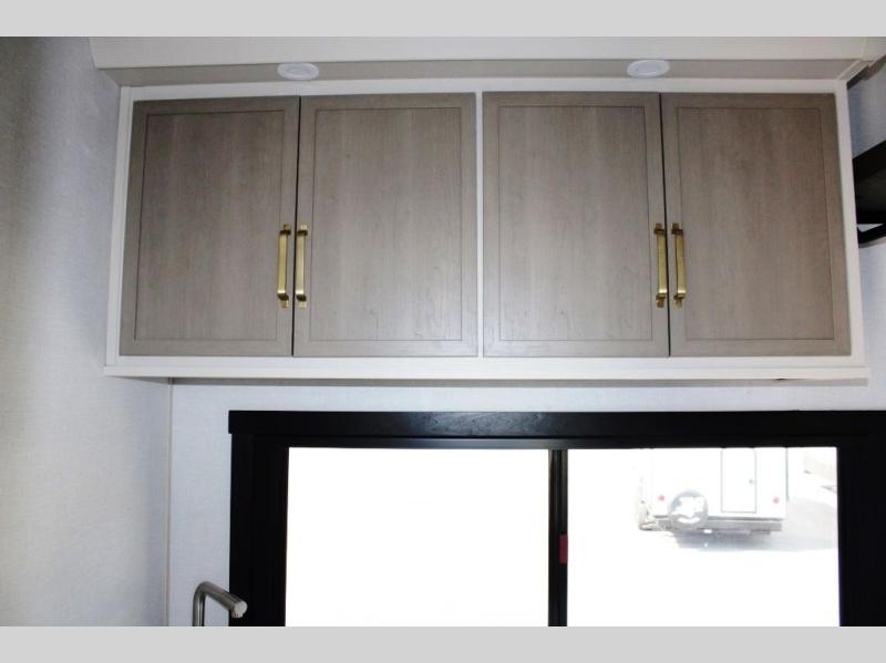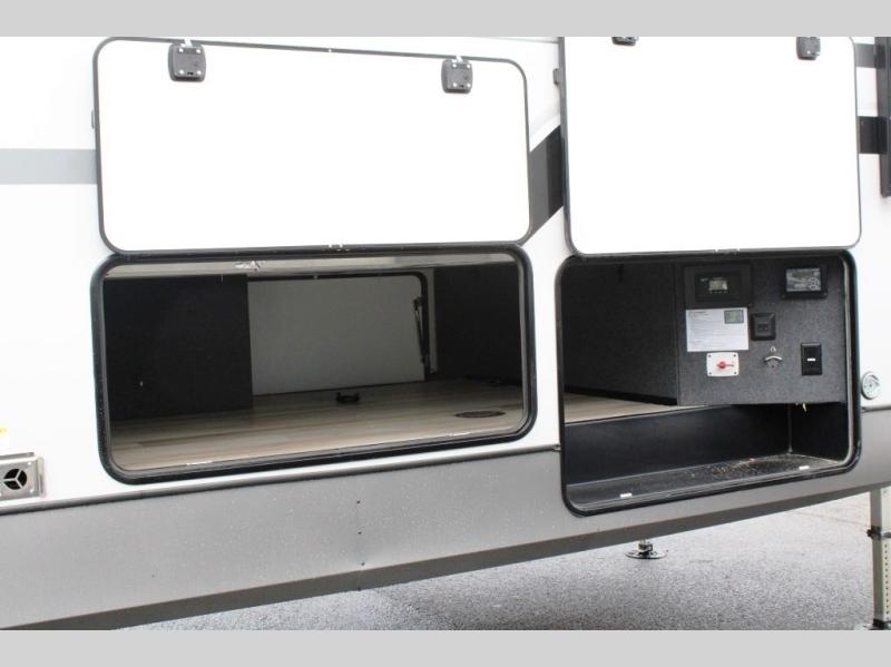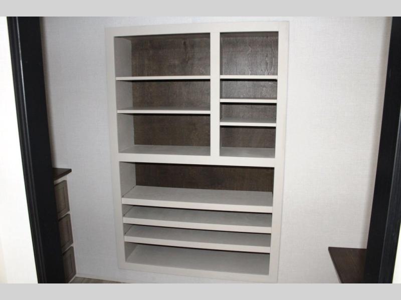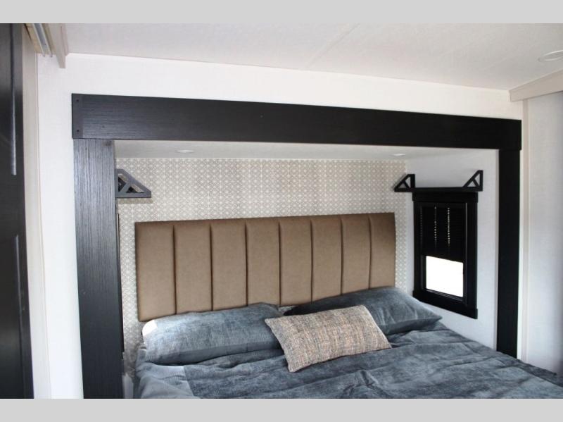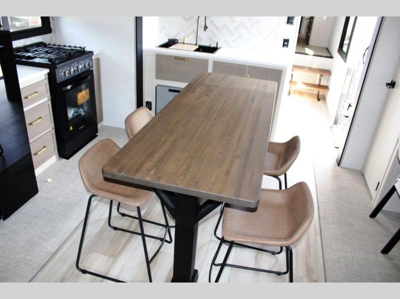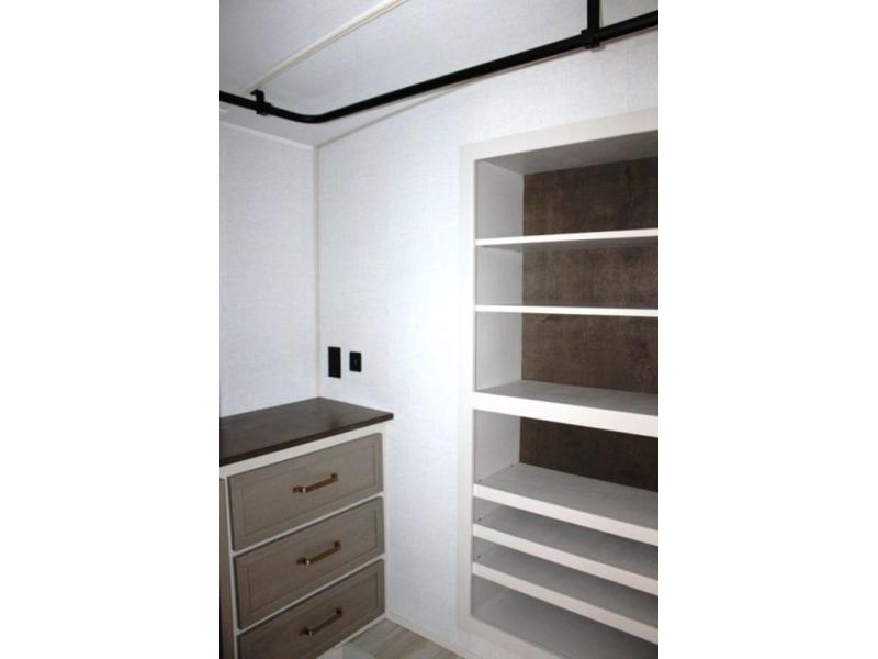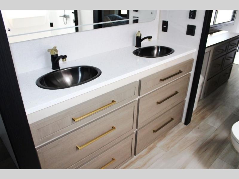 One look at this fifth wheel and you'll be sold! You can wake up each morning in the master bedroom that includes a custom king bed and a dresser with an ottoman. The front full bath has two bath sinks so you both can get ready at once, and you're going to love the walk-in wardrobe with a wrap-around hanging rod. A half bath includes a floating shelf with a hanging rod plus washer/dryer prep, giving you the option to make this a laundry room! The back of this unit is where you can cook meals with full kitchen amenities, dine at the kitchen island with four chairs, and relax on the theater seating and tri-fold sofa. A 50" TV and fireplace is also found here, complete with hidden storage behind for board games, movies, and snacks!