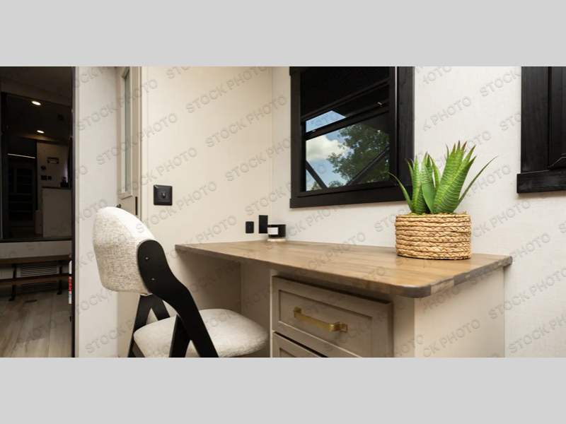One look at this fifth wheel and you'll be sold! You can wake up each morning in the master bedroom that includes a custom king bed and a dresser with an ottoman. The front full bath has two bath sinks so you both can get ready at once, and you're going to love the walk-in wardrobe with a wrap-around hanging rod. A half bath includes a floating shelf with a hanging rod plus washer/dryer prep, giving you the option to make this a laundry room! The back of this unit is where you can cook meals with full kitchen amenities, dine at the kitchen island with four chairs, and relax on the theater seating and tri-fold sofa. A 50" TV and fireplace is also found here, complete with hidden storage behind for board games, movies, and snacks!