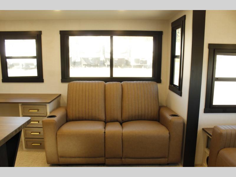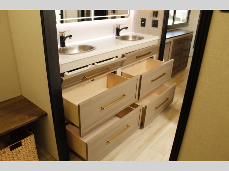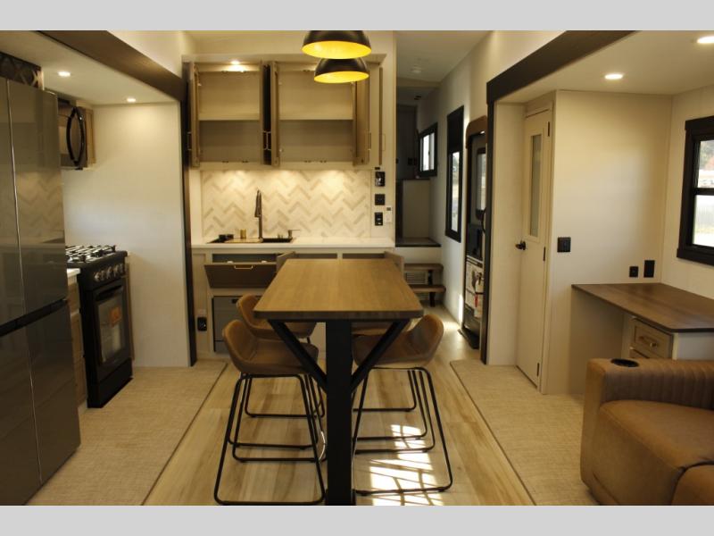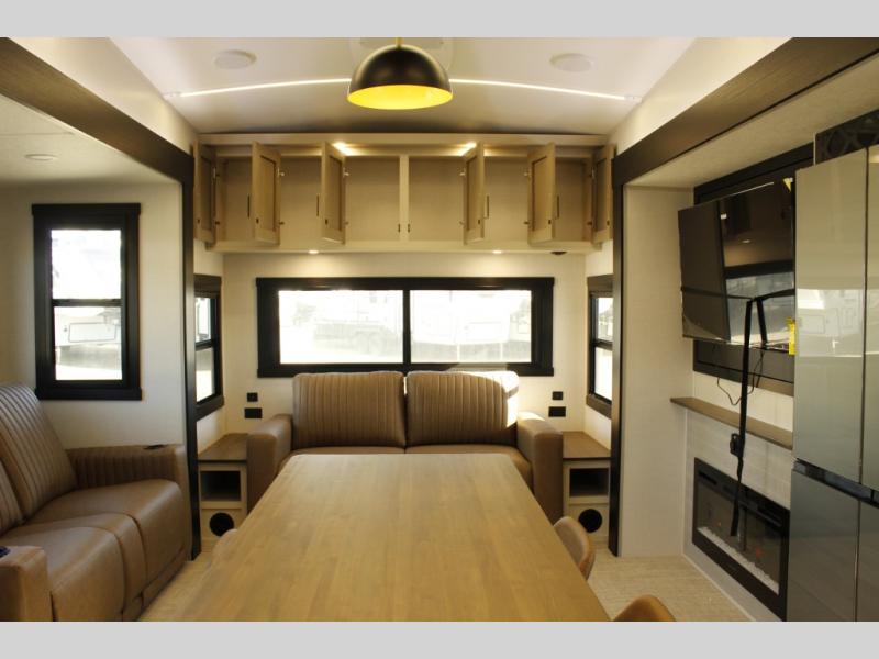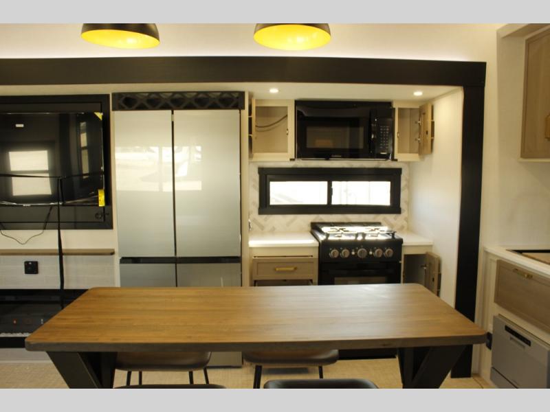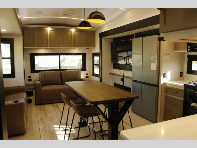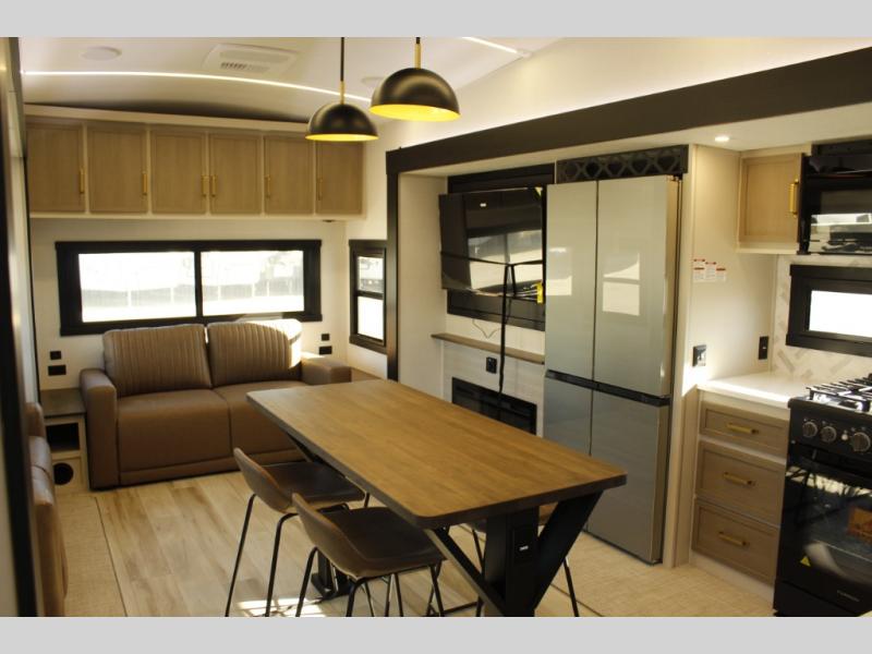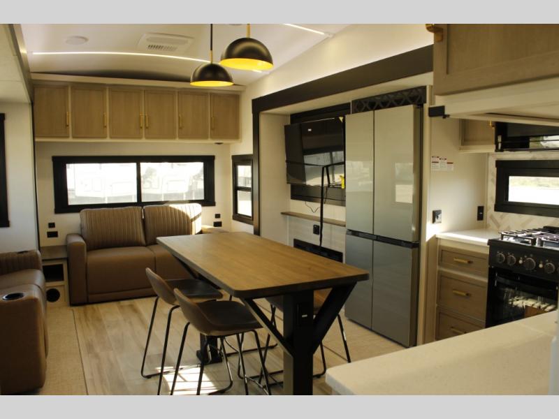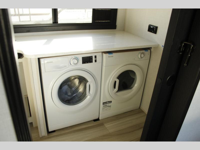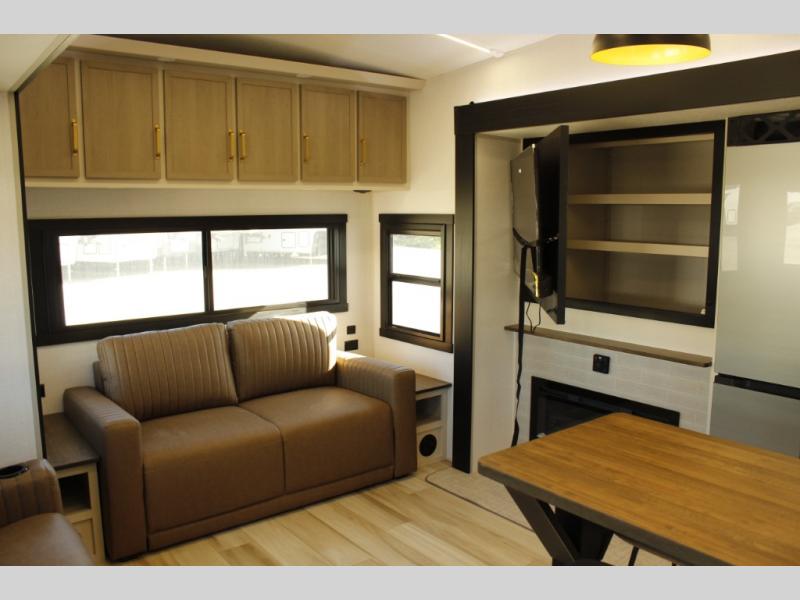 One look at this fifth wheel and you'll be sold! You can wake up each morning in the master bedroom that includes a custom king bed and a dresser with an ottoman. The front full bath has two bath sinks so you both can get ready at once, and you're going to love the walk-in wardrobe with a wrap-around hanging rod. A half bath includes a floating shelf with a hanging rod plus washer/dryer prep, giving you the option to make this a laundry room! The back of this unit is where you can cook meals with full kitchen amenities, dine at the kitchen island with four chairs, and relax on the theater seating and tri-fold sofa. A 50" TV and fireplace is also found here, complete with hidden storage behind for board games, movies, and snacks!