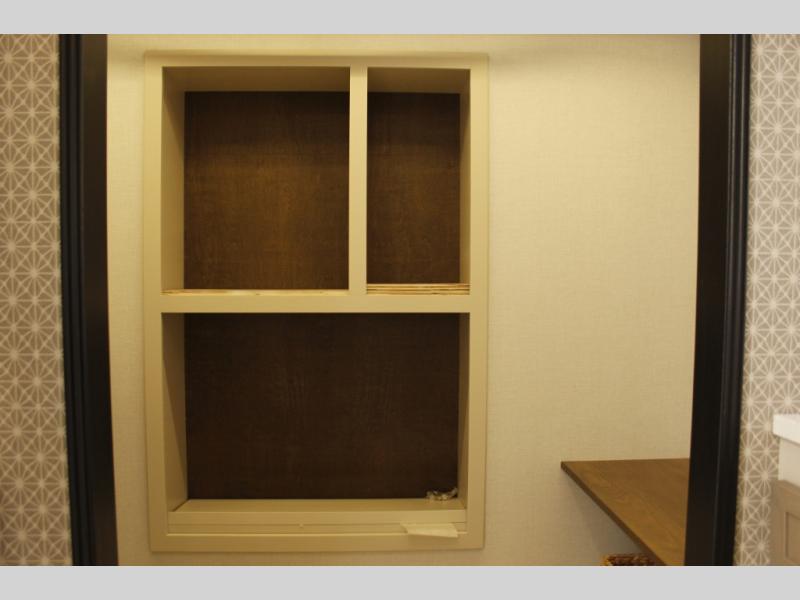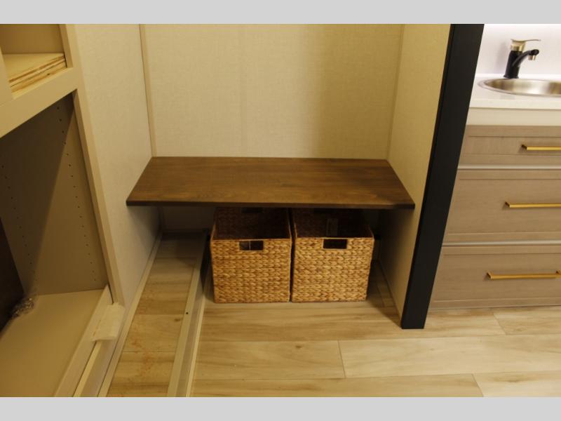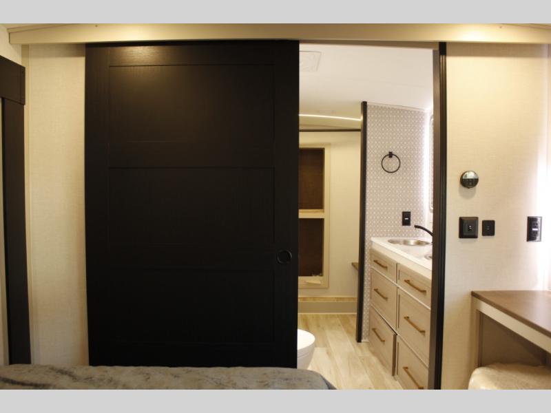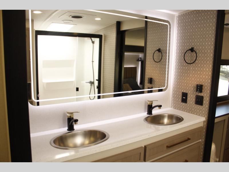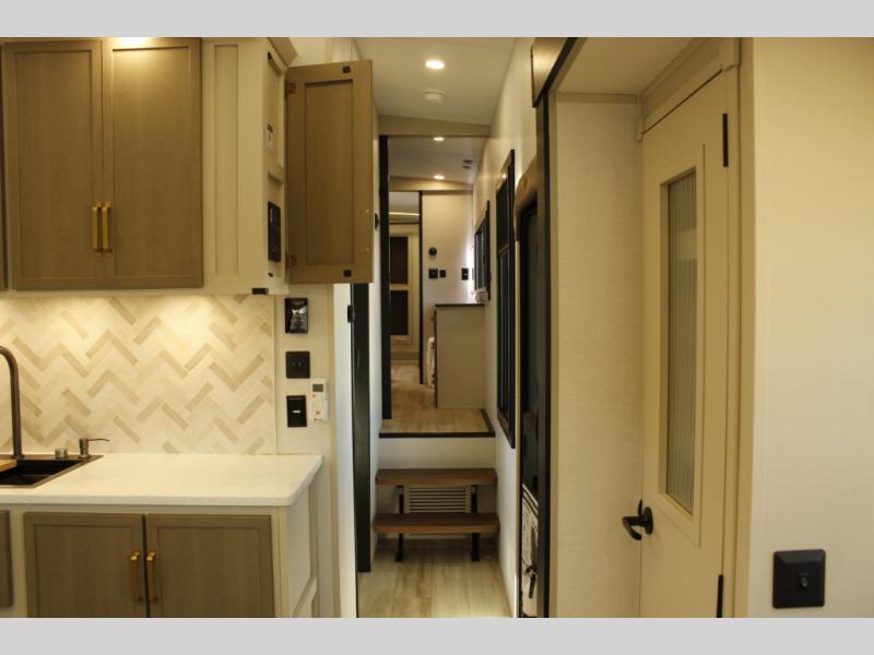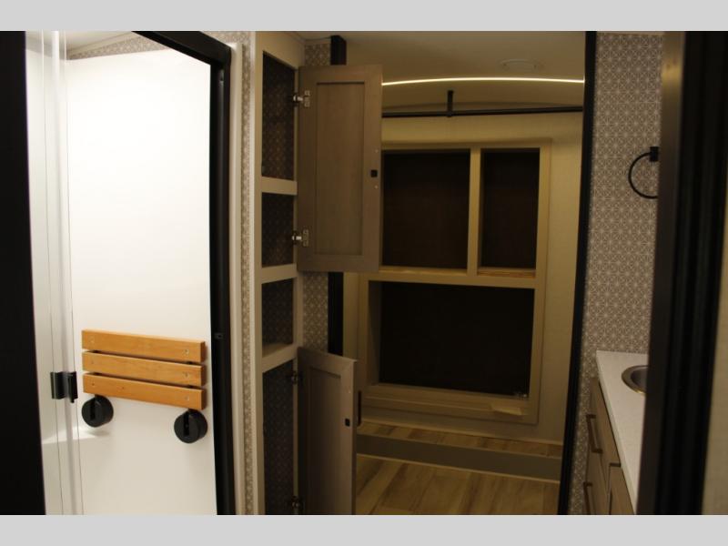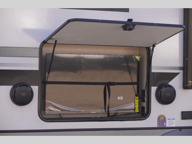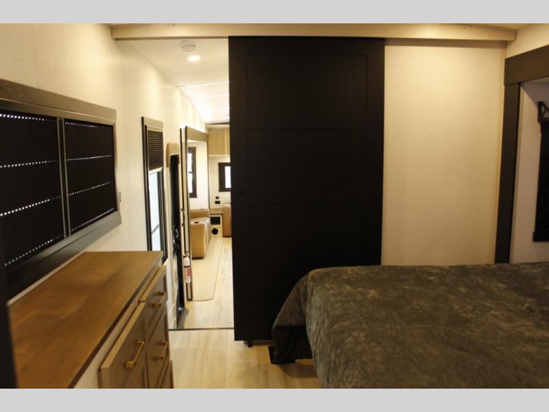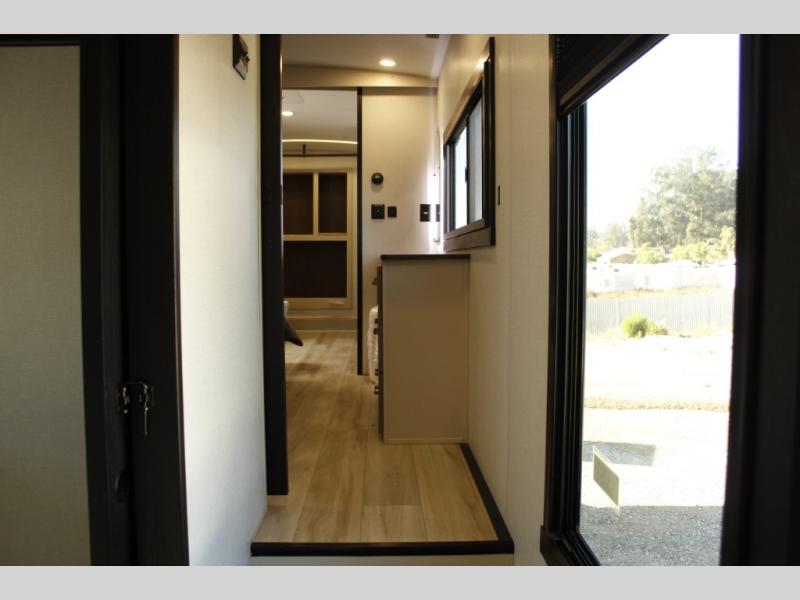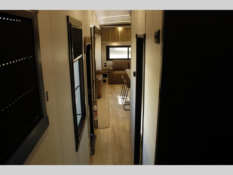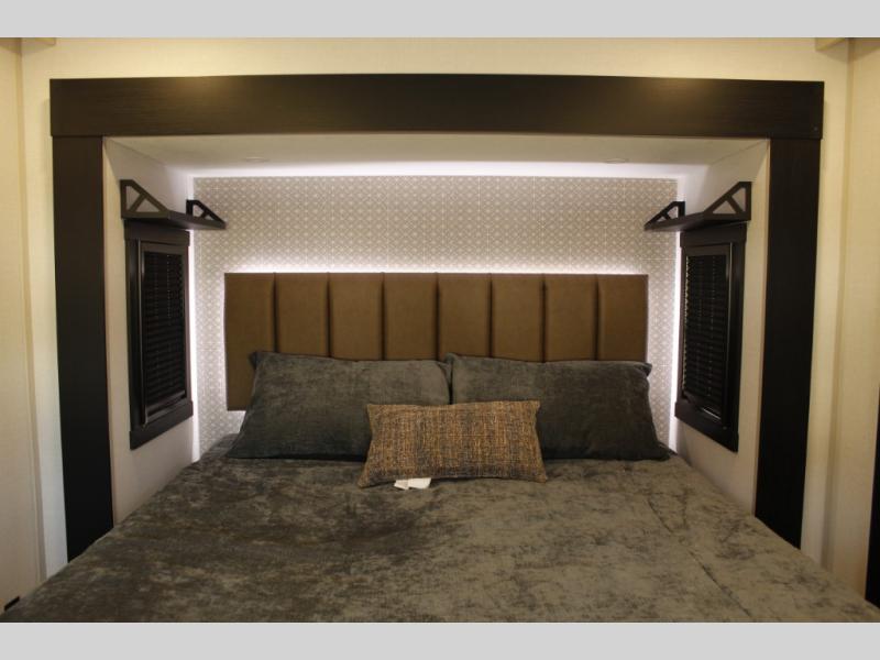 One look at this fifth wheel and you'll be sold! You can wake up each morning in the master bedroom that includes a custom king bed and a dresser with an ottoman. The front full bath has two bath sinks so you both can get ready at once, and you're going to love the walk-in wardrobe with a wrap-around hanging rod. A half bath includes a floating shelf with a hanging rod plus washer/dryer prep, giving you the option to make this a laundry room! The back of this unit is where you can cook meals with full kitchen amenities, dine at the kitchen island with four chairs, and relax on the theater seating and tri-fold sofa. A 50" TV and fireplace is also found here, complete with hidden storage behind for board games, movies, and snacks!