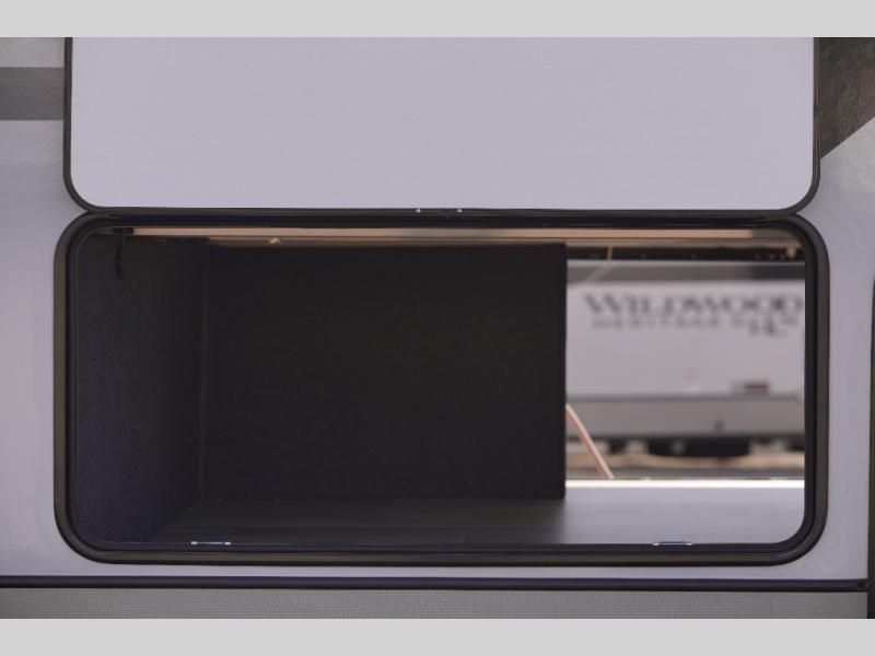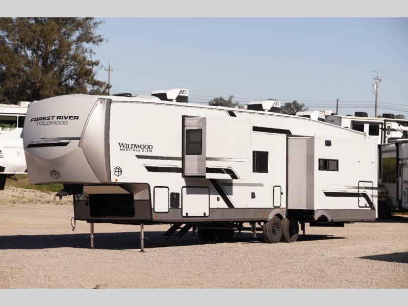 With any Wildwood Heritage Glen fifth wheel by Forest River, the quality construction, attention to detail and design along with a bright and welcoming interior allows you to relax in comfort. You'll love the high-end solid surface countertops included in the Elevated Value Package, along with a JBL sound system, full-length barreled ceilings, and an ultimate interior lighting upgrade. The included Expedition Package features an Accesibelly underbelly panel with 12V tank heaters, nitrogen-filled tires with aluminum rims, and a spacious 30" wide main entry door with a window. The Lippert On-The-Go ladder prep and back-up camera prep let you customize your fifth wheel even more, and the LED awning, front cap, marker and taillights will make it easier than ever to set up camp!