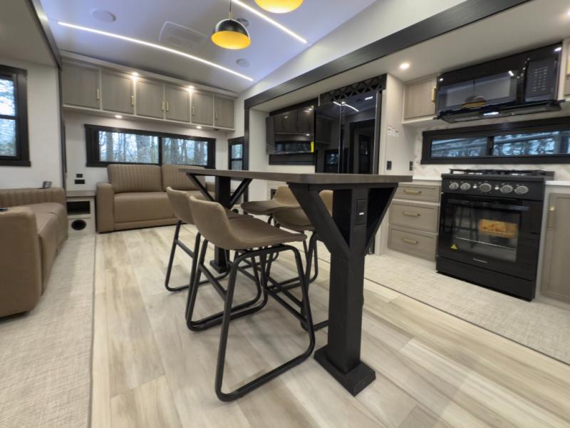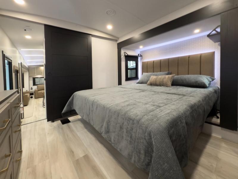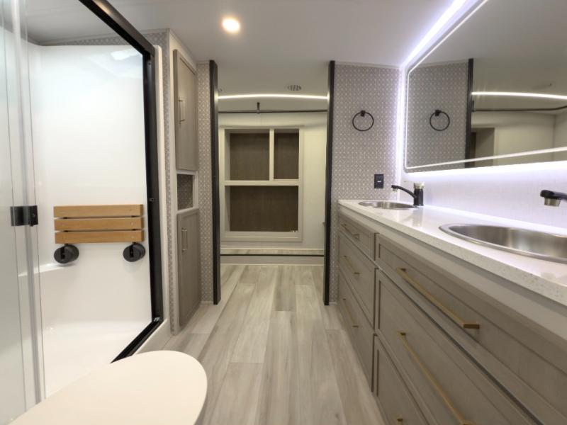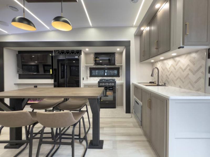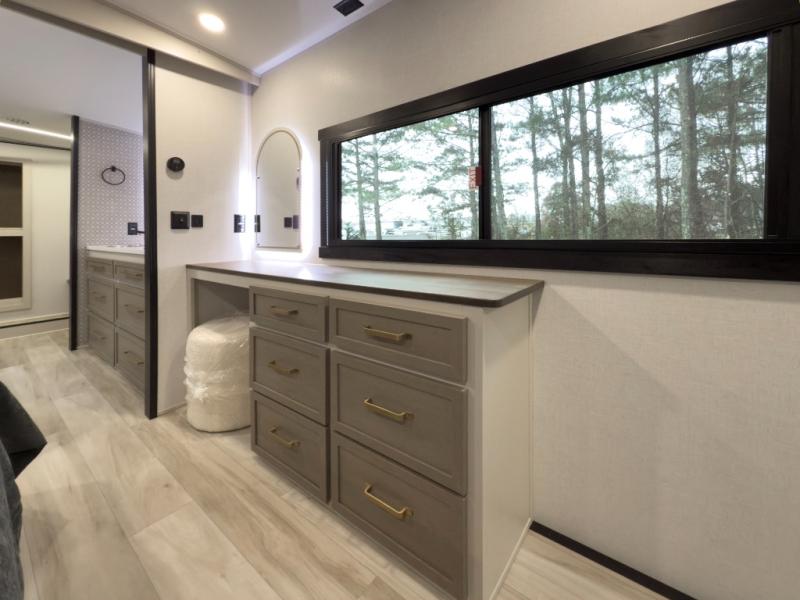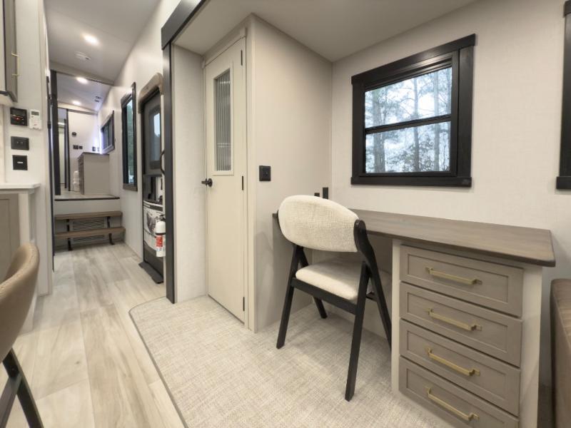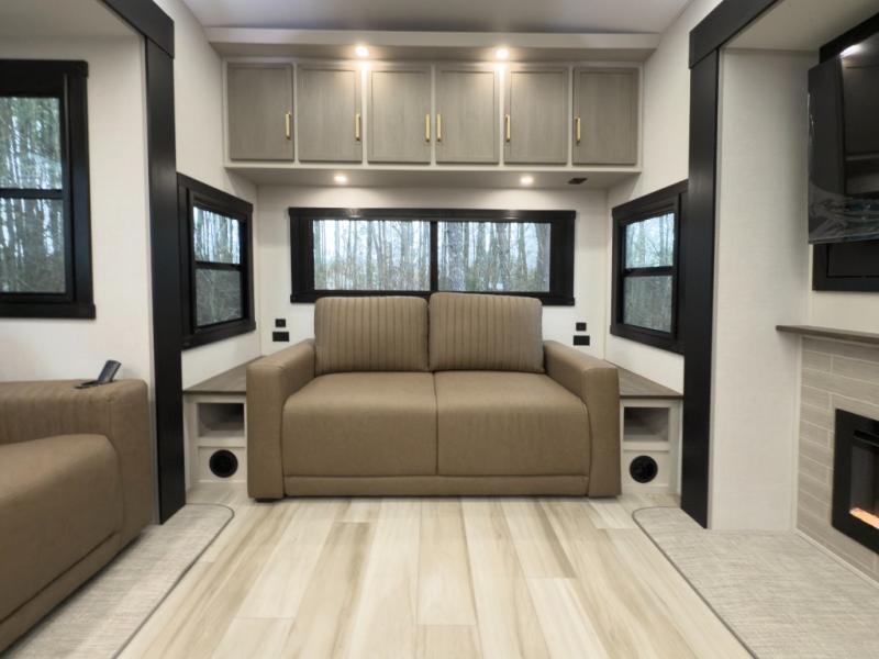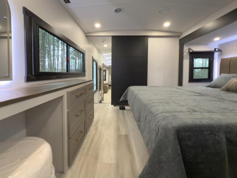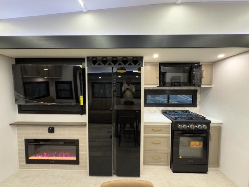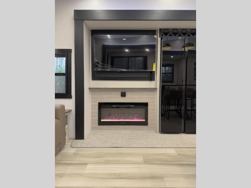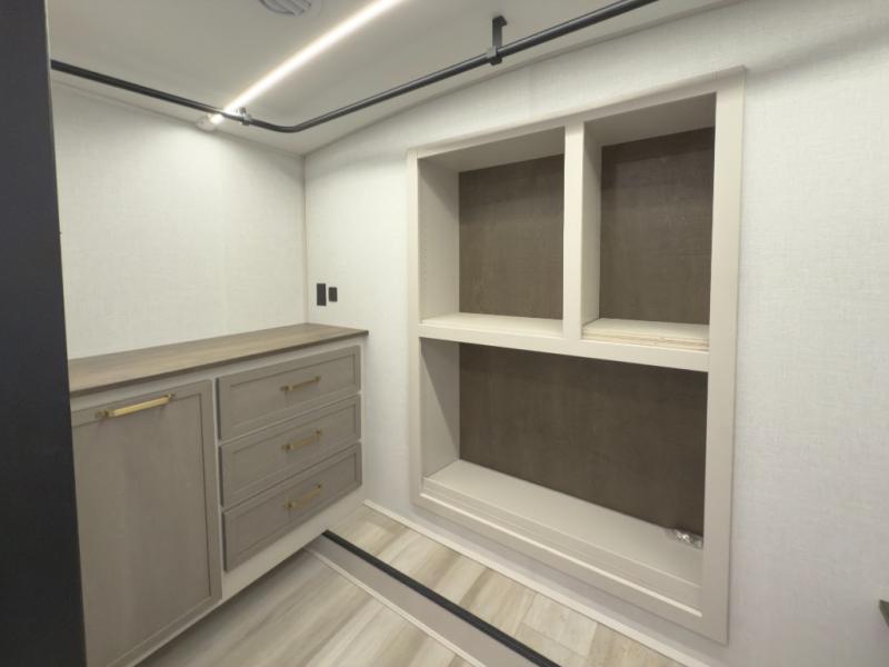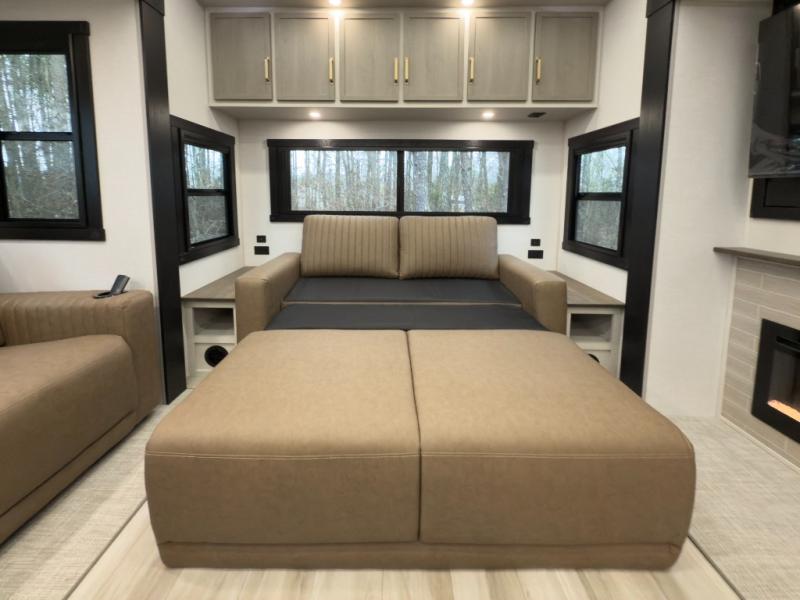 One look at this fifth wheel and you'll be sold! You can wake up each morning in the master bedroom that includes a custom king bed and a dresser with an ottoman. The front full bath has two bath sinks so you both can get ready at once, and you're going to love the walk-in wardrobe with a wrap-around hanging rod. A half bath includes a floating shelf with a hanging rod plus washer/dryer prep, giving you the option to make this a laundry room! The back of this unit is where you can cook meals with full kitchen amenities, dine at the kitchen island with four chairs, and relax on the theater seating and tri-fold sofa. A 50" TV and fireplace is also found here, complete with hidden storage behind for board games, movies, and snacks!