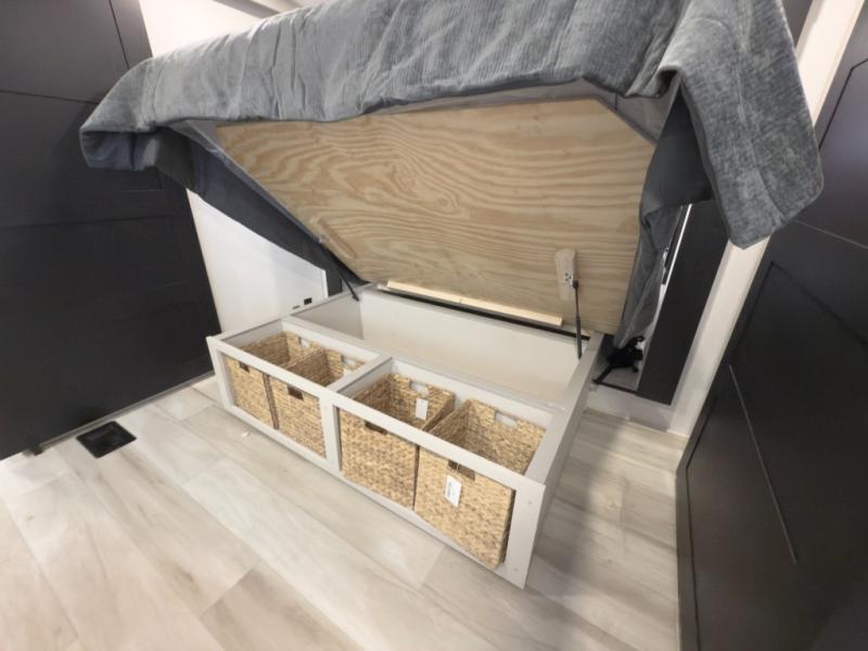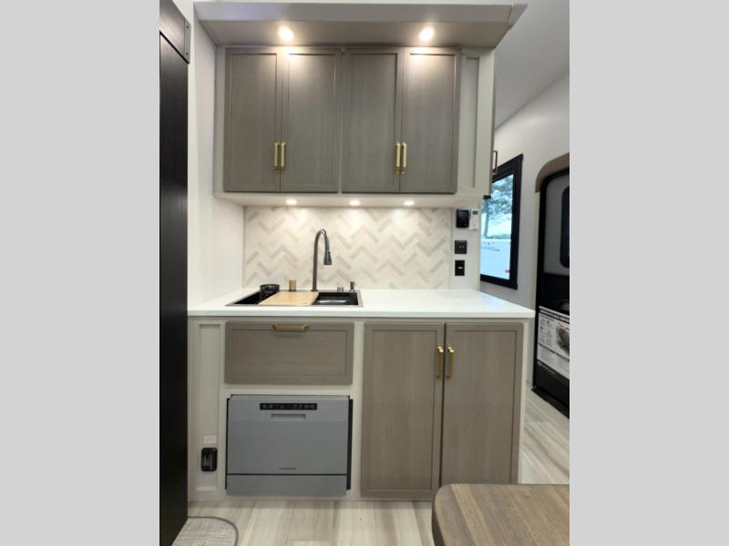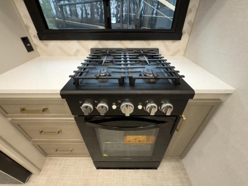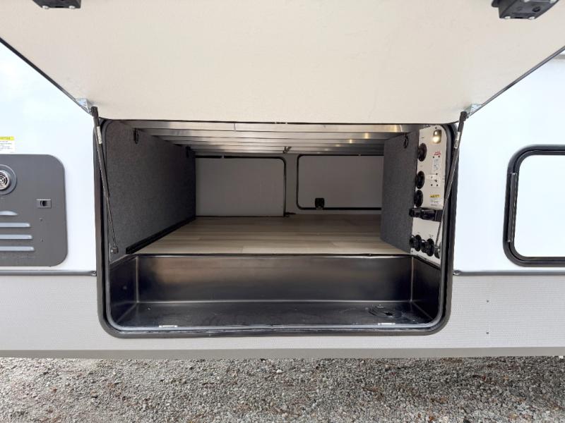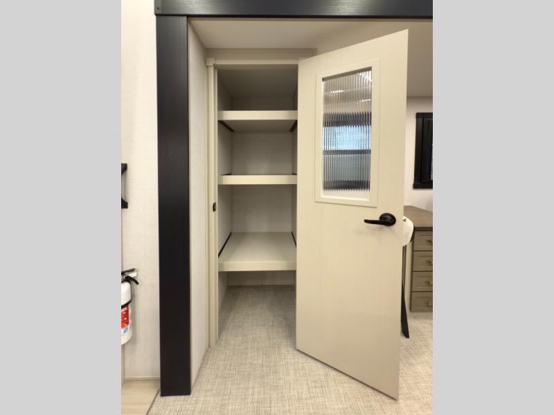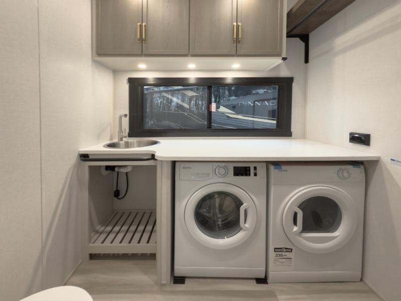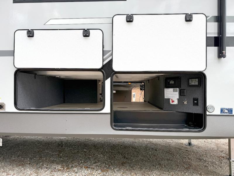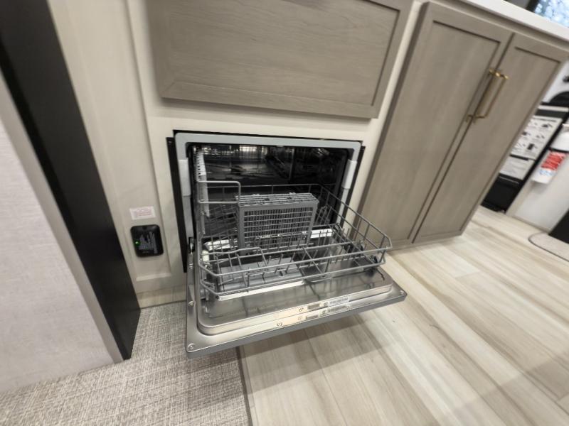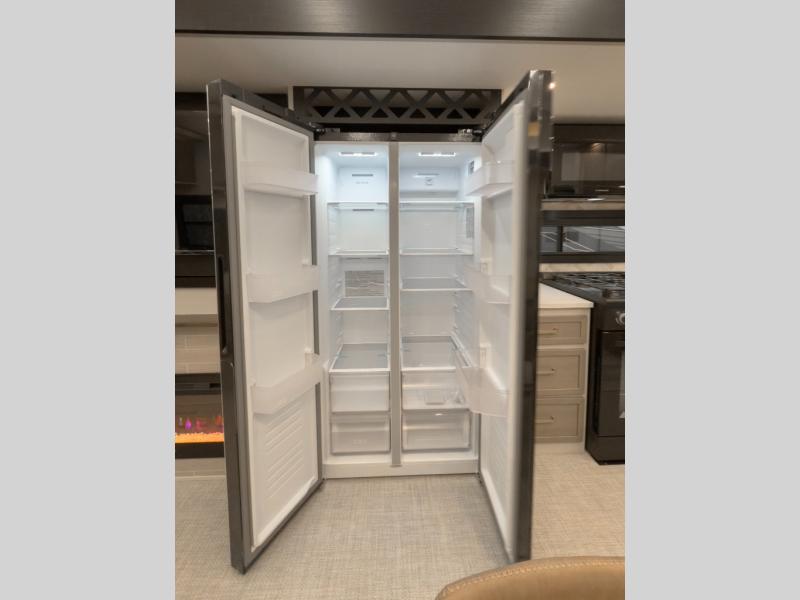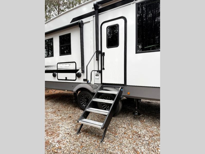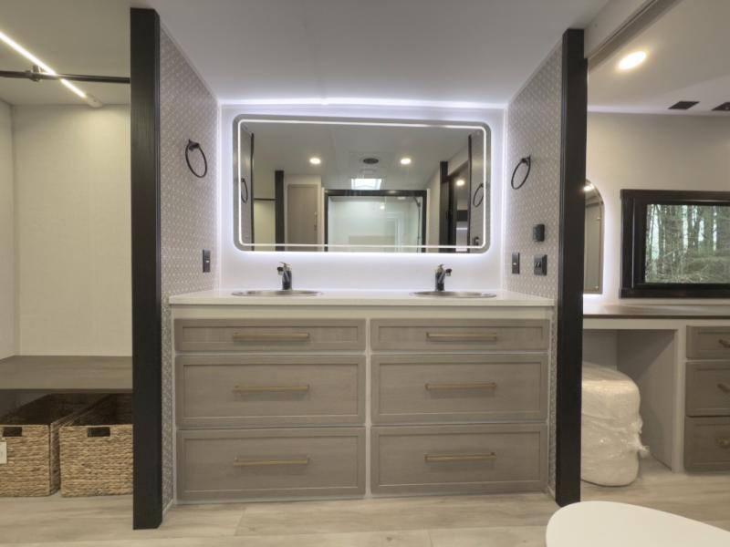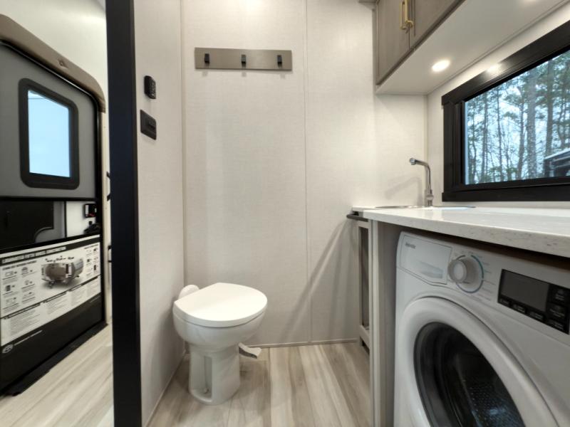 One look at this fifth wheel and you'll be sold! You can wake up each morning in the master bedroom that includes a custom king bed and a dresser with an ottoman. The front full bath has two bath sinks so you both can get ready at once, and you're going to love the walk-in wardrobe with a wrap-around hanging rod. A half bath includes a floating shelf with a hanging rod plus washer/dryer prep, giving you the option to make this a laundry room! The back of this unit is where you can cook meals with full kitchen amenities, dine at the kitchen island with four chairs, and relax on the theater seating and tri-fold sofa. A 50" TV and fireplace is also found here, complete with hidden storage behind for board games, movies, and snacks!