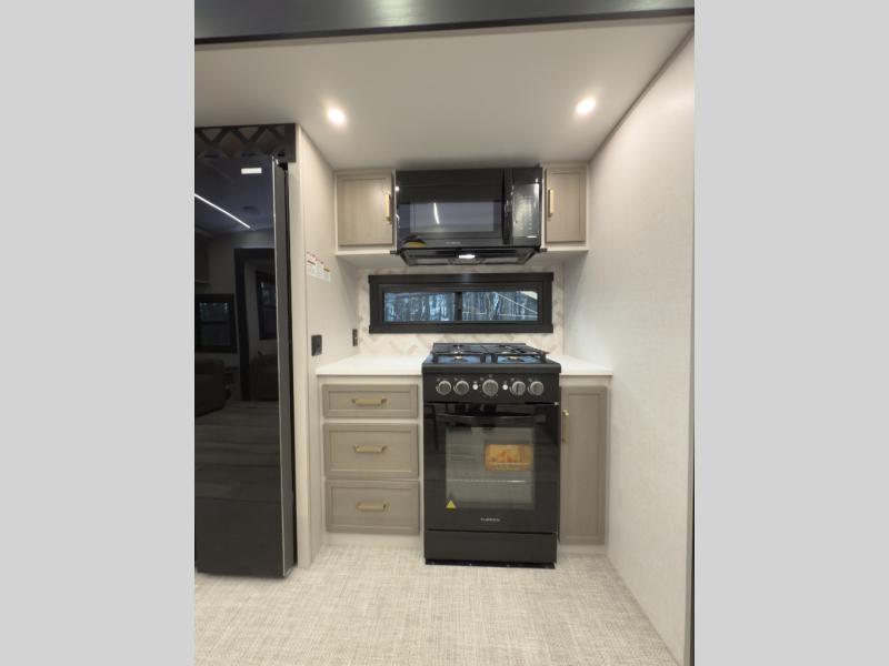 With any Wildwood Heritage Glen fifth wheel by Forest River, the quality construction, attention to detail and design along with a bright and welcoming interior allows you to relax in comfort. You'll love the high-end solid surface countertops included in the Elevated Value Package, along with a JBL sound system, full-length barreled ceilings, and an ultimate interior lighting upgrade. The included Expedition Package features an Accesibelly underbelly panel with 12V tank heaters, nitrogen-filled tires with aluminum rims, and a spacious 30" wide main entry door with a window. The Lippert On-The-Go ladder prep and back-up camera prep let you customize your fifth wheel even more, and the LED awning, front cap, marker and taillights will make it easier than ever to set up camp!