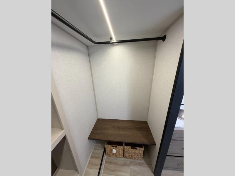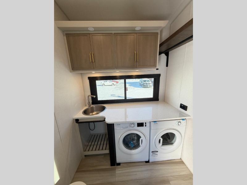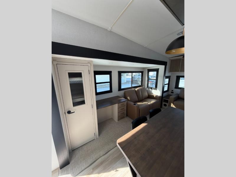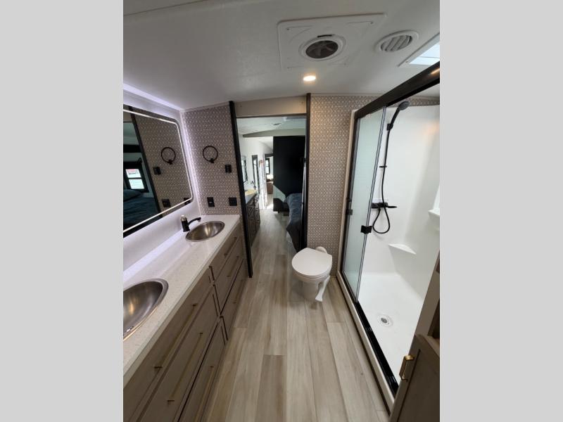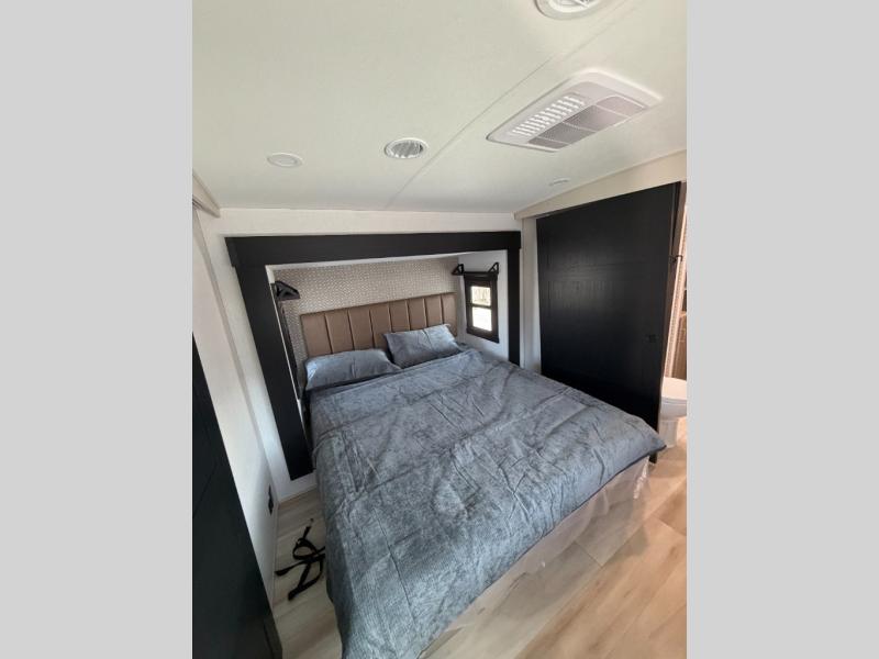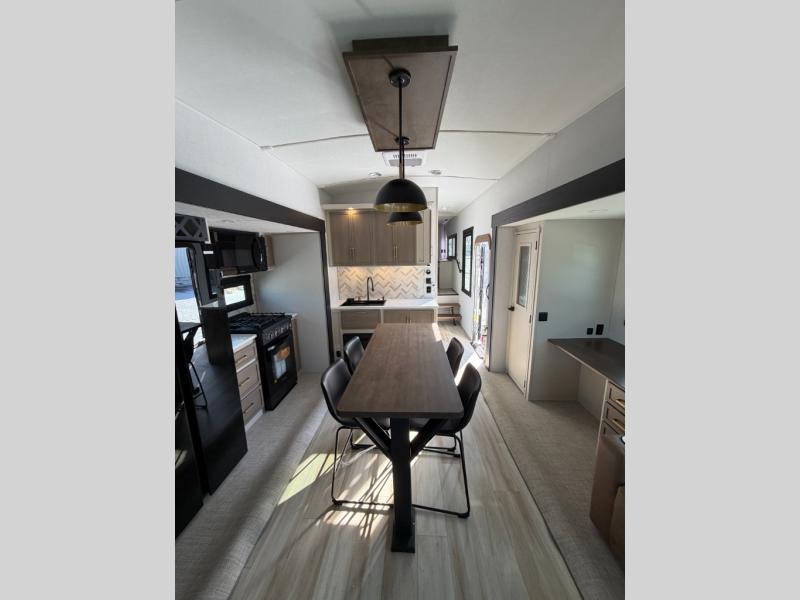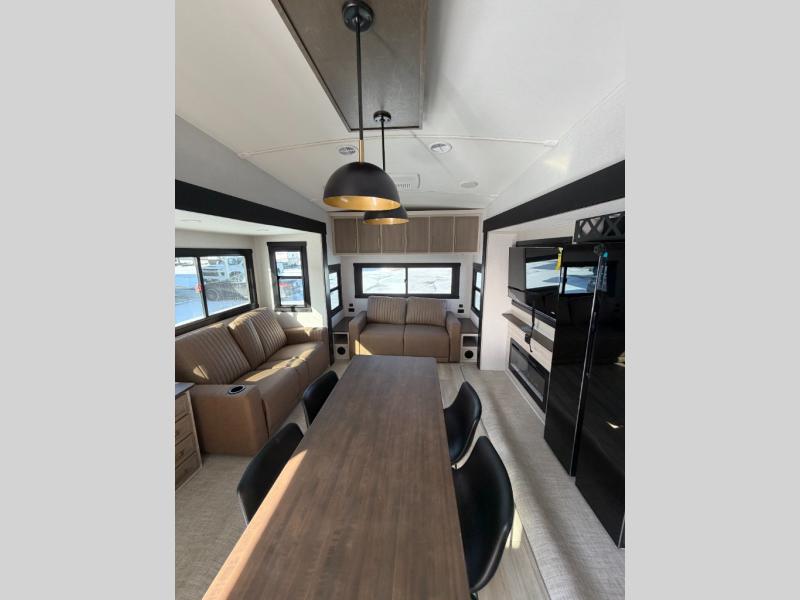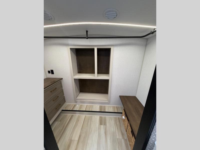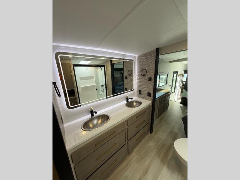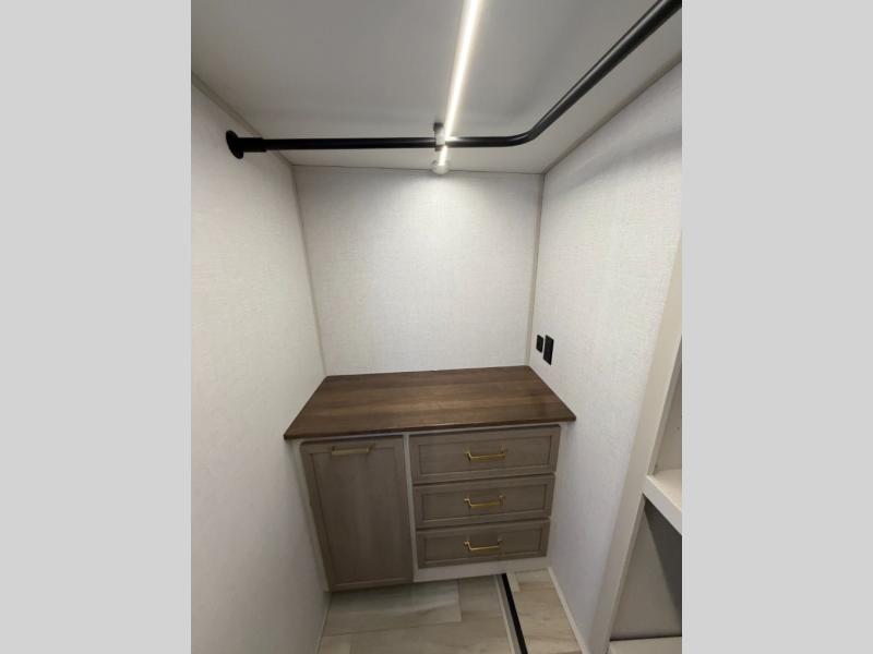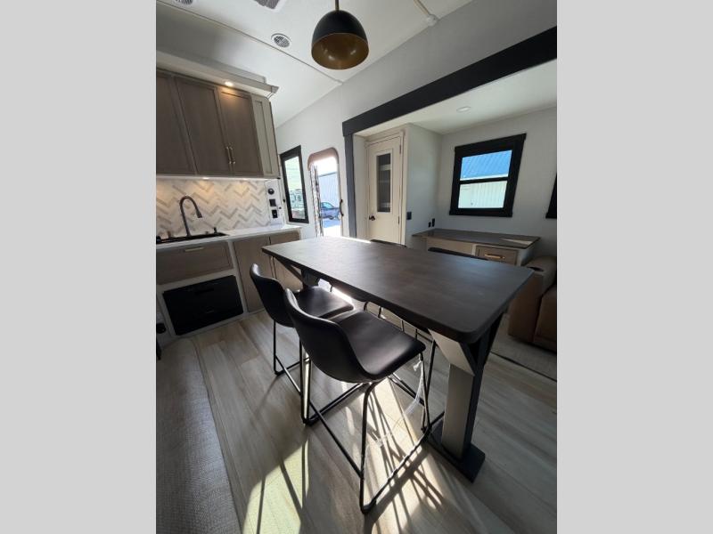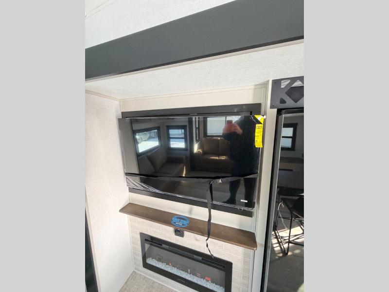 One look at this fifth wheel and you'll be sold! You can wake up each morning in the master bedroom that includes a custom king bed and a dresser with an ottoman. The front full bath has two bath sinks so you both can get ready at once, and you're going to love the walk-in wardrobe with a wrap-around hanging rod. A half bath includes a floating shelf with a hanging rod plus washer/dryer prep, giving you the option to make this a laundry room! The back of this unit is where you can cook meals with full kitchen amenities, dine at the kitchen island with four chairs, and relax on the theater seating and tri-fold sofa. A 50" TV and fireplace is also found here, complete with hidden storage behind for board games, movies, and snacks!