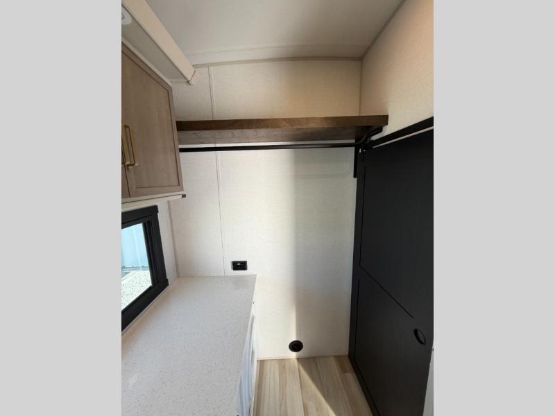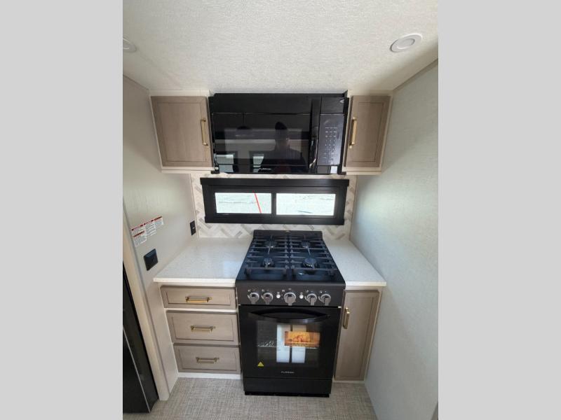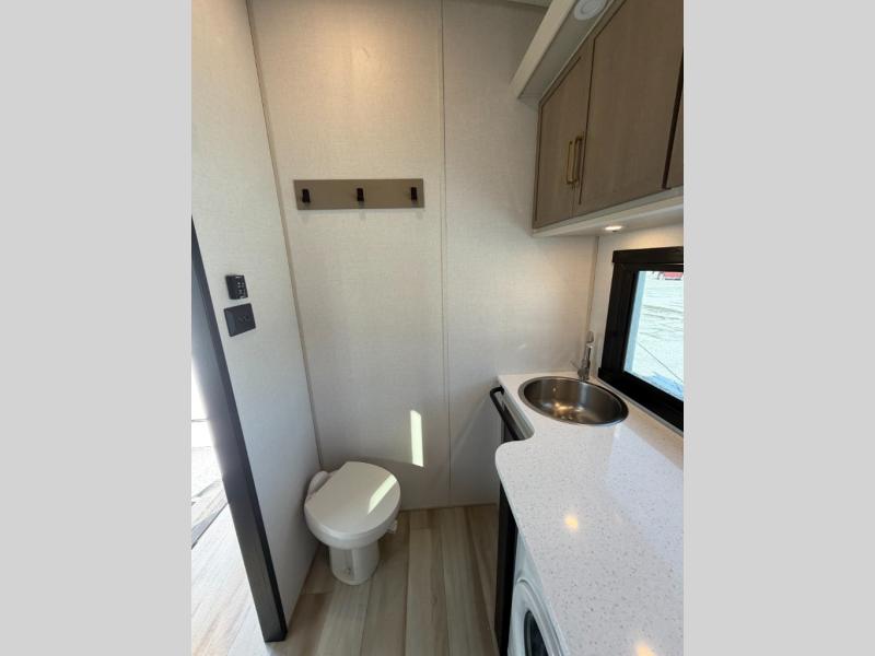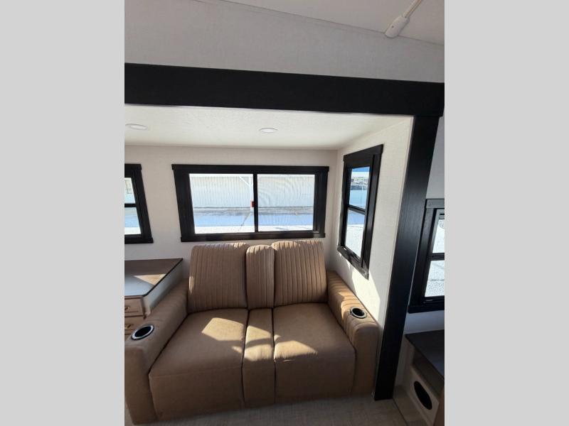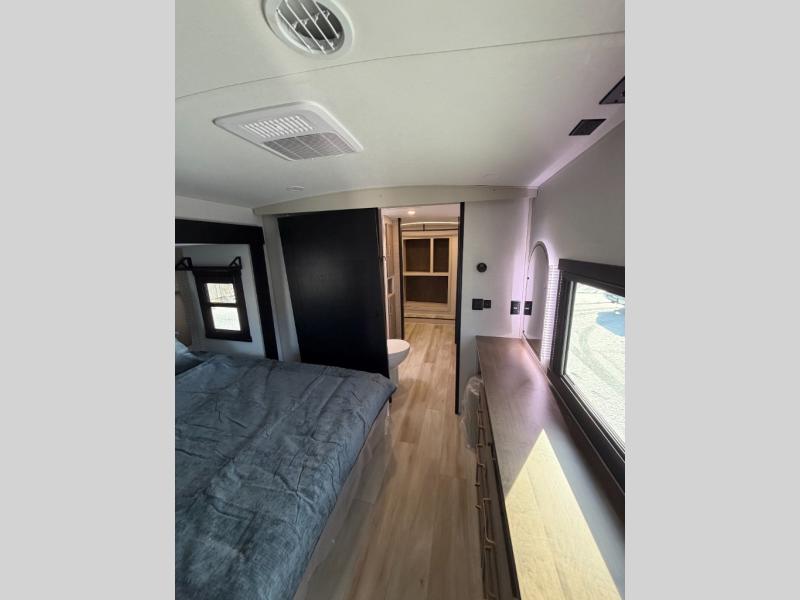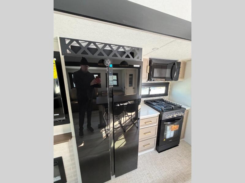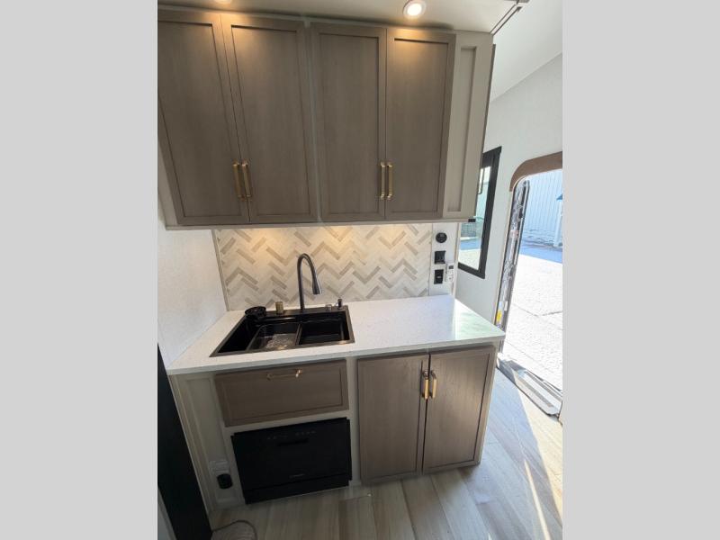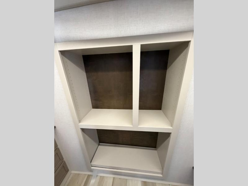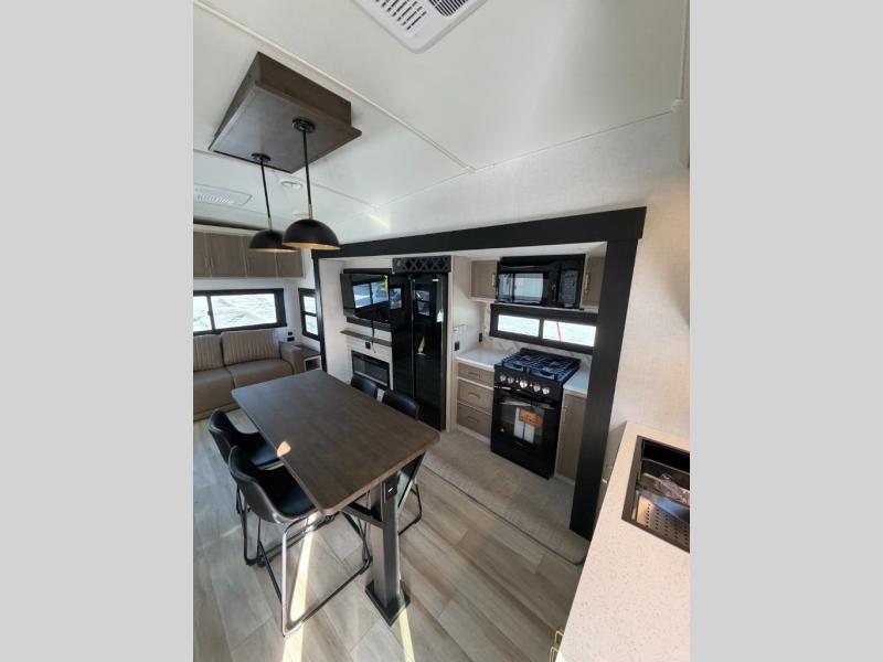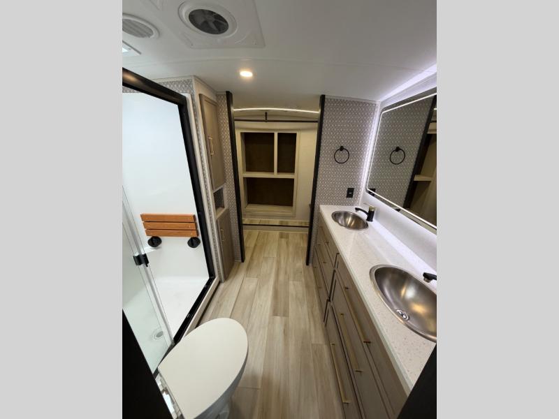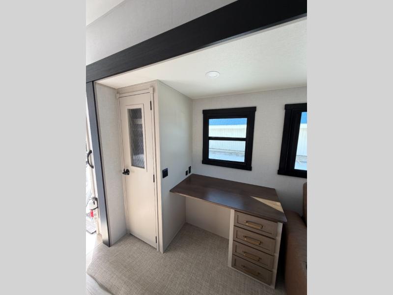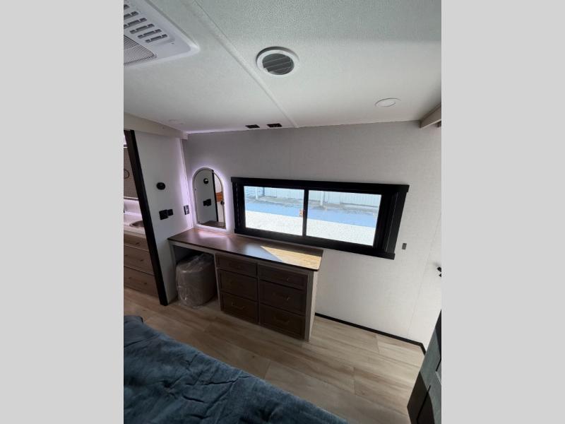 One look at this fifth wheel and you'll be sold! You can wake up each morning in the master bedroom that includes a custom king bed and a dresser with an ottoman. The front full bath has two bath sinks so you both can get ready at once, and you're going to love the walk-in wardrobe with a wrap-around hanging rod. A half bath includes a floating shelf with a hanging rod plus washer/dryer prep, giving you the option to make this a laundry room! The back of this unit is where you can cook meals with full kitchen amenities, dine at the kitchen island with four chairs, and relax on the theater seating and tri-fold sofa. A 50" TV and fireplace is also found here, complete with hidden storage behind for board games, movies, and snacks!