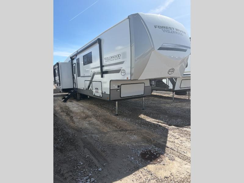 With any Wildwood Heritage Glen fifth wheel by Forest River, the quality construction, attention to detail and design along with a bright and welcoming interior allows you to relax in comfort. You'll love the high-end solid surface countertops included in the Elevated Value Package, along with a JBL sound system, full-length barreled ceilings, and an ultimate interior lighting upgrade. The included Expedition Package features an Accesibelly underbelly panel with 12V tank heaters, nitrogen-filled tires with aluminum rims, and a spacious 30" wide main entry door with a window. The Lippert On-The-Go ladder prep and back-up camera prep let you customize your fifth wheel even more, and the LED awning, front cap, marker and taillights will make it easier than ever to set up camp!