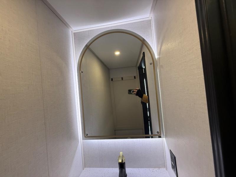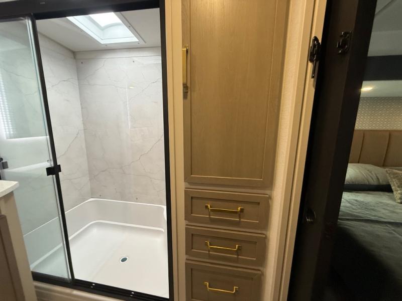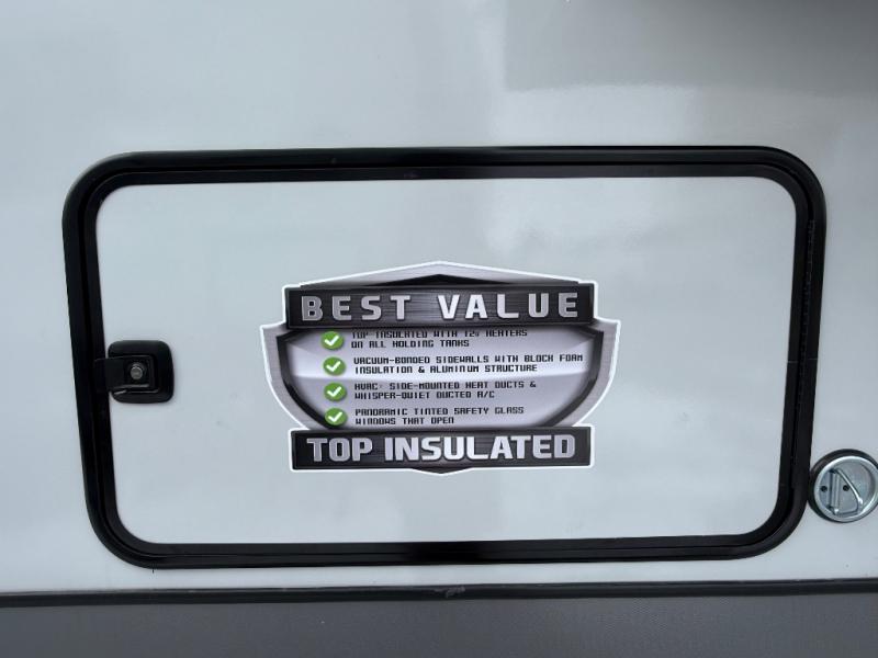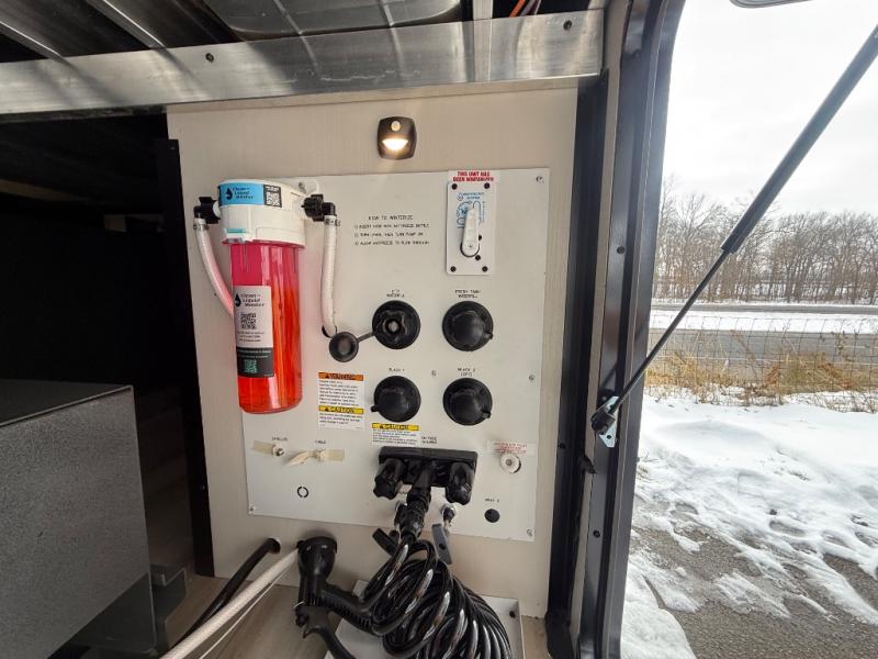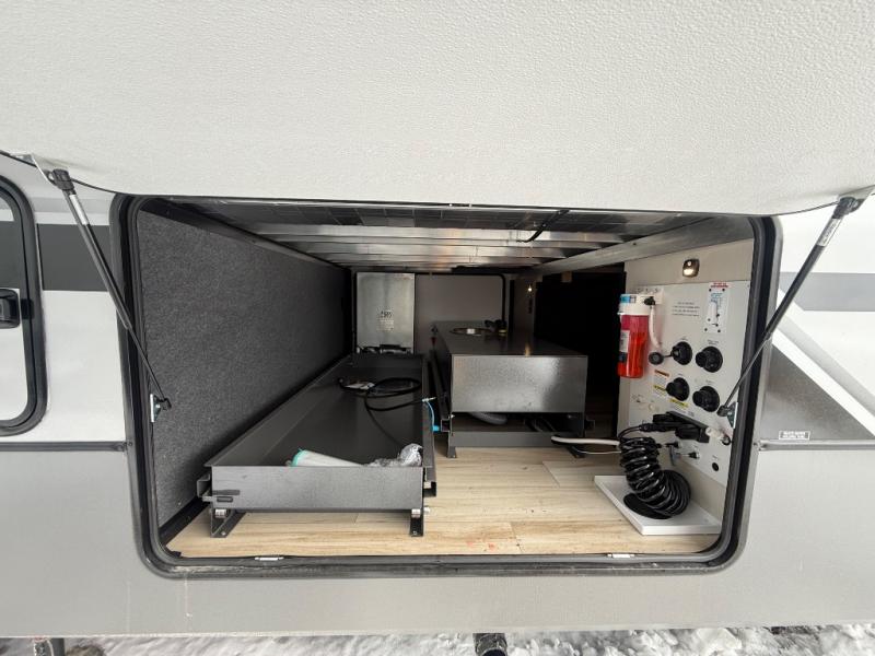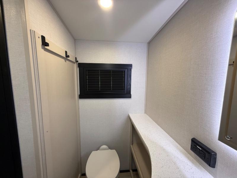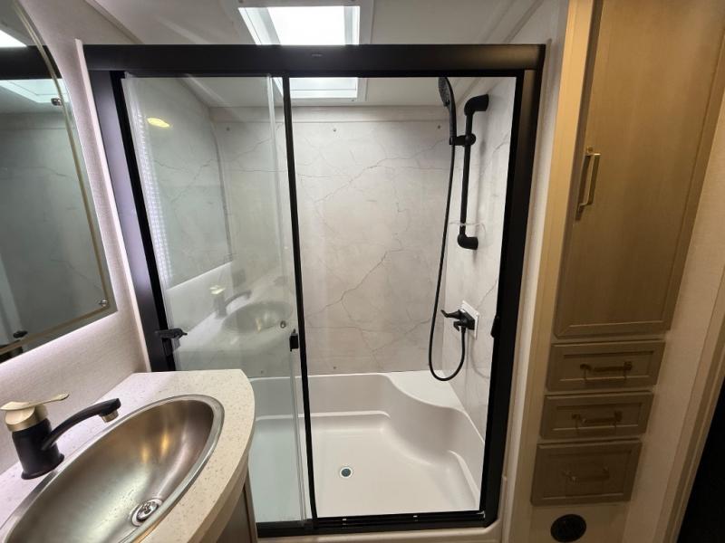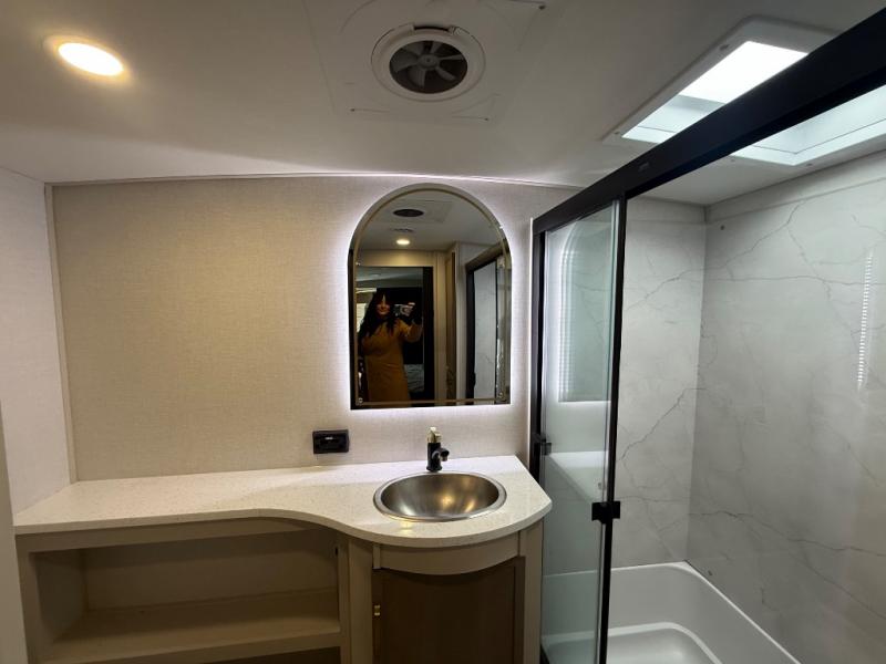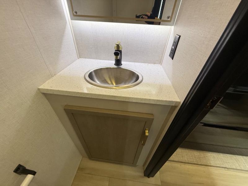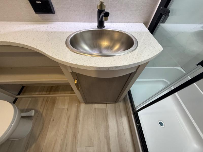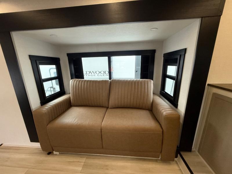 Each Wildwood Heritage Glen Elite Series fifth wheel by Forest River is constructed with vacuum bonded "Aluma Frame" sidewalls and floor, block foam insulation, and an AccessiBelly underbelly with 12V tank heaters on all holding tanks to help extend your camping season. There is an exterior docking station with hot and cold water, along with power stabilizer jacks and landing gear, and Maxxis radial tires with black accented rims. There is also an in-line water filtration system, an RV Airflow system, and an extra large pass-through storage with Slam Latch baggage doors for hassle-free packing. You will love the high-end solid surface countertops inside, along with gold-accented faucets with stainless steel sinks in all bathrooms, and summer wind colored horizontal plank linoleum flooring that is both stylish and easy to keep clean!