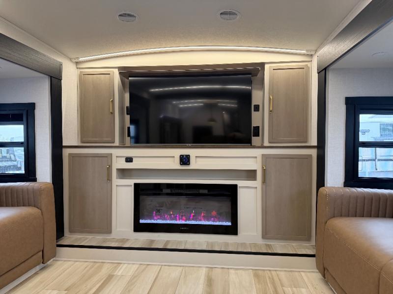 Invite the grandkids or your neighbor friends for your next camping trip in this Wildwood Heritage Glen Elite fifth wheel that features a front entertainment center and living area. Your guests will love the two tri-fold sofas within dual opposing slides to make the room their own. You'll also enjoy theatre seats and a fireplace for an even more at-home feel. The large pantry in the kitchen is very handy as well as the breakfast bar with swivel bar stools. This unit also includes a full and half bath for your convenience, and a king bed with Versa-Tilt on an Elite extra-wide bed slide in the private bedroom. There is abundant storage with multiple pass-through compartments included, so you don't have to leave any of your larger gear behind. Outdoors, you can also enjoy the 20' awning, the strut-assisted steps when entering and exiting, and the Elite outdoor bar and entertainment center which includes a 32" TV, a griddle, and a refrigerator.