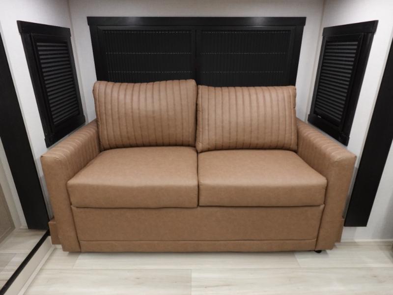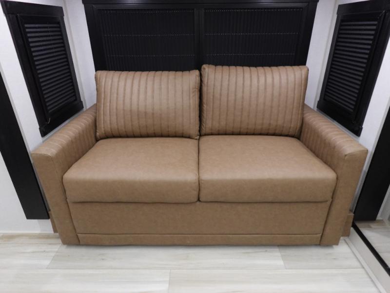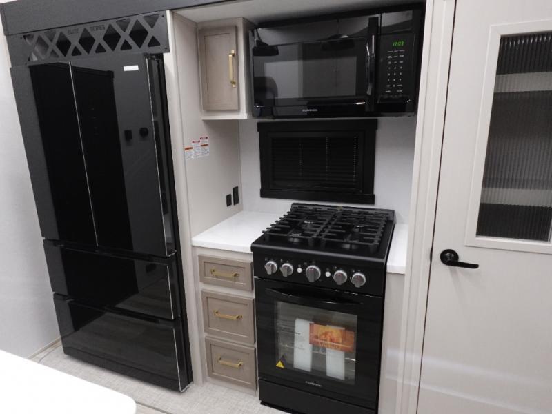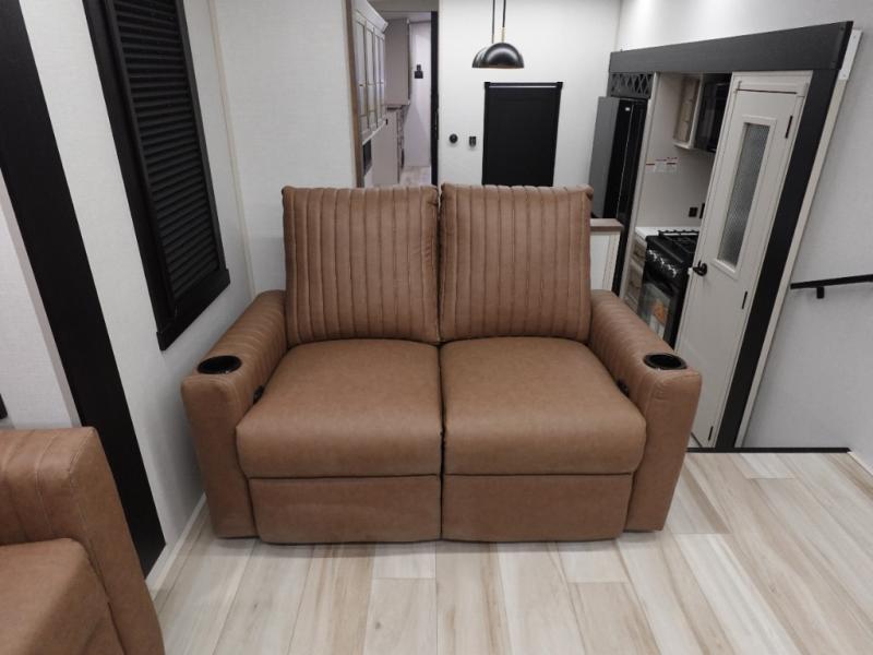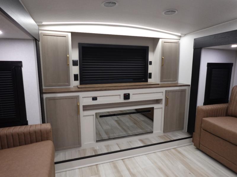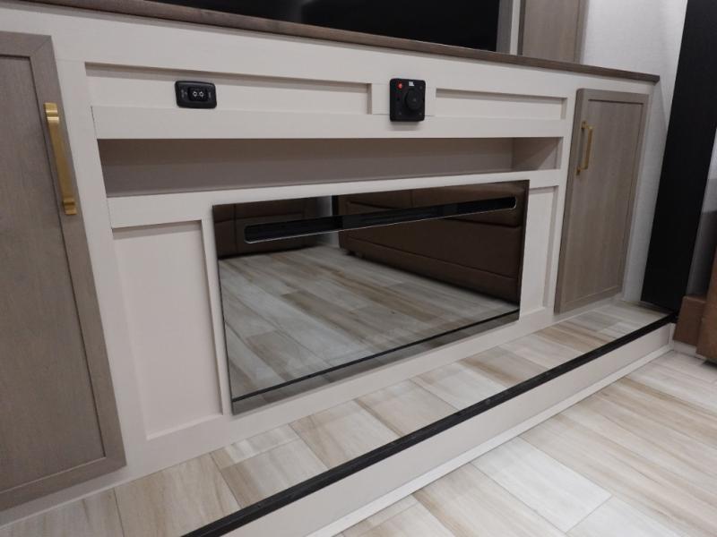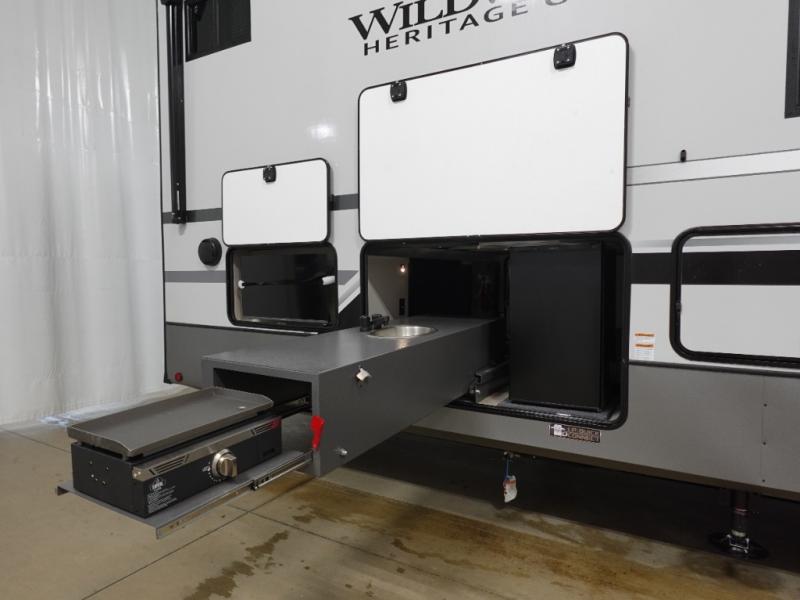 Invite the grandkids or your neighbor friends for your next camping trip in this Wildwood Heritage Glen Elite fifth wheel that features a front entertainment center and living area. Your guests will love the two tri-fold sofas within dual opposing slides to make the room their own. You'll also enjoy theatre seats and a fireplace for an even more at-home feel. The large pantry in the kitchen is very handy as well as the breakfast bar with swivel bar stools. This unit also includes a full and half bath for your convenience, and a king bed with Versa-Tilt on an Elite extra-wide bed slide in the private bedroom. There is abundant storage with multiple pass-through compartments included, so you don't have to leave any of your larger gear behind. Outdoors, you can also enjoy the 20' awning, the strut-assisted steps when entering and exiting, and the Elite outdoor bar and entertainment center which includes a 32" TV, a griddle, and a refrigerator.